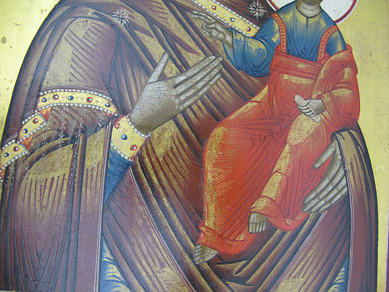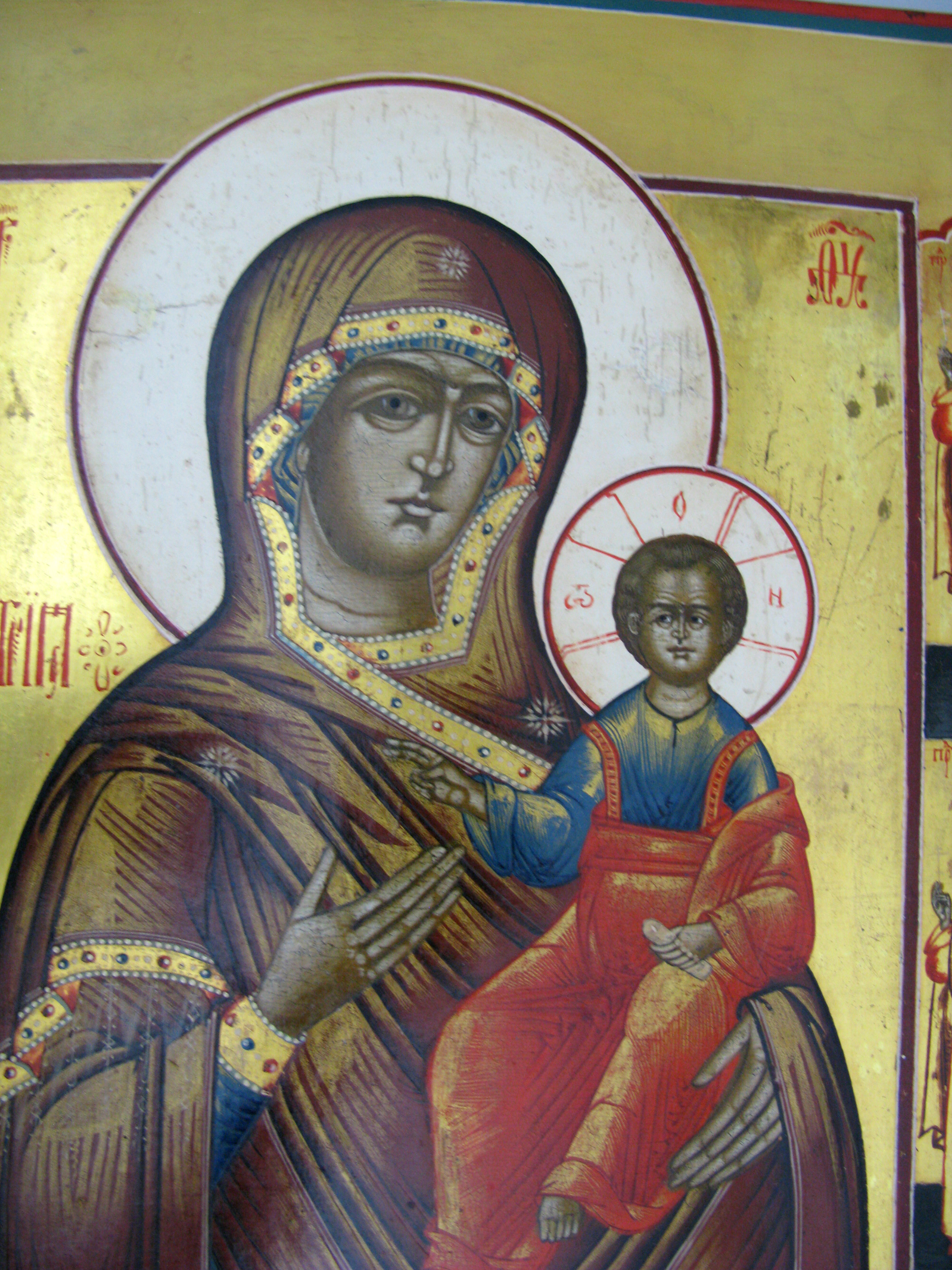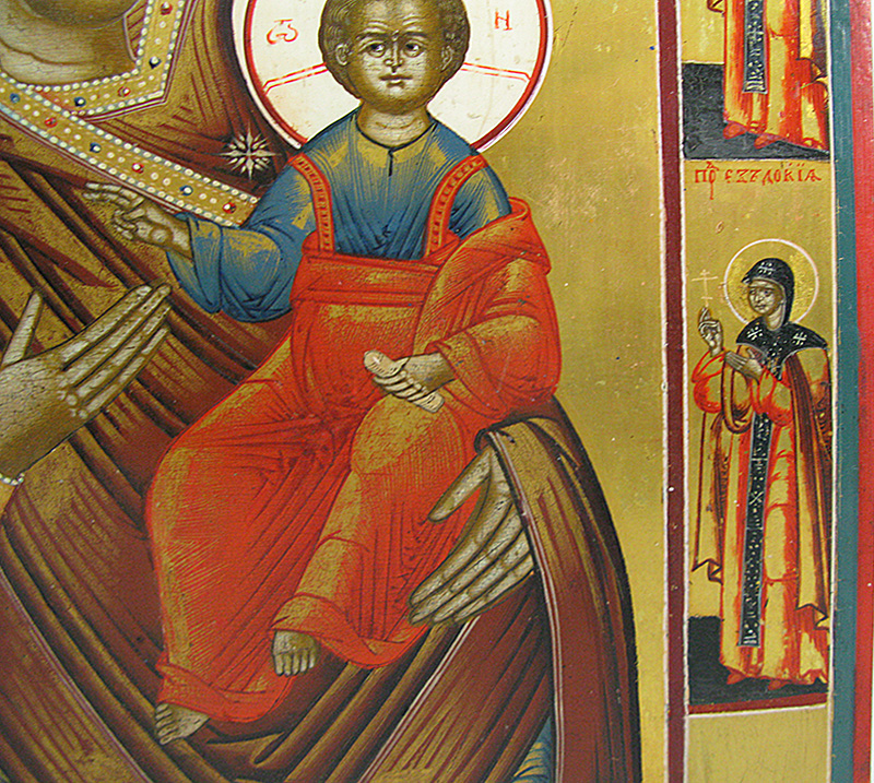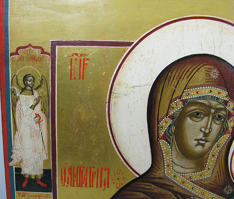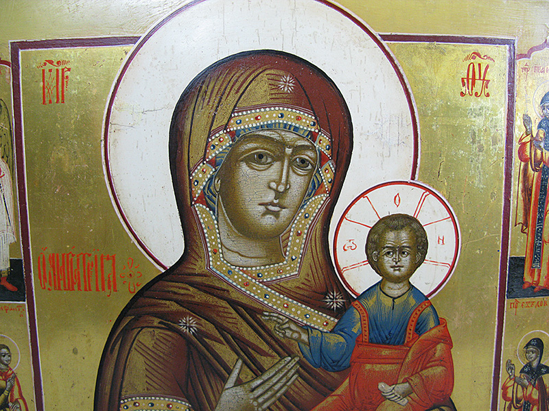 Our Lady of Smolensk is the name of an ancient miracle-working icon and one of the most highly venerated icons in Russia. According to tradition, after the fall of Constantinople, the original icon painted by St. Luke surfaced in Russia, where it was placed in the Assumption Cathedral in Smolensk and therefore referred to as Our Lady of Smolensk. The original icon, dated by art historians to the 11th century, is now believed to have been destroyed by fire during the German occupation of Smolensk in 1941, but a great number of copies were made throughout the century, some of the considerable historical and artistic value of their own.