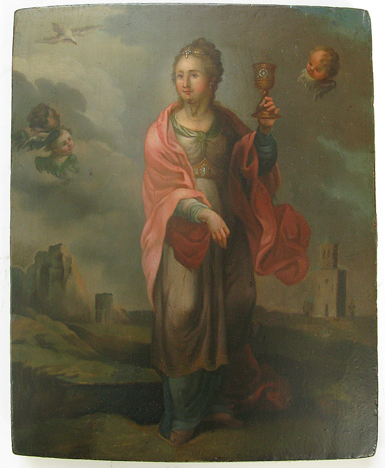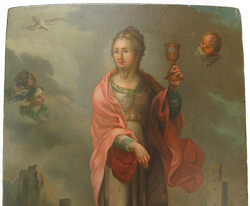 Saint Barbara, known in the Eastern Orthodox Church as the Great Martyr Barbara, was an early Christian saint and martyr living in the Greek city Nicomedia, present-day Turkey, or in Heliopolis of Phoenicia, present-day Baalbek, Lebanon. Saint Barbara is often portrayed with miniature chains and a tower. As one of the Fourteen Holy Helpers, Barbara continues to be a popular saint in modern times, perhaps best known as the patron saint of armorers, artillerymen, military engineers, miners, and others who work with explosives because of her old legend's association with lightning, and also of mathematicians. Many of her the thirteen miracles turn on the security she offered that her devotees would not die without making confession and receiving extreme unction.