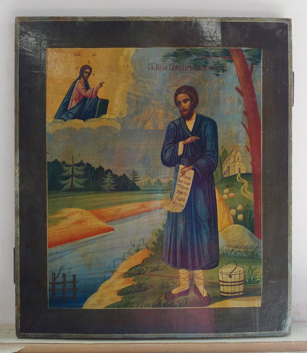 The icon is depicting Saint Righteous Simeon of Verkhotursk (+ 1642) who was born from a noble family, but in order to escape worldly vanity he left home and went off beyond the Ural Mountains to far-away Siberia, to a region newly-converted to Christianity. Humbly concealing his noble parentage, he led the life of a pauper who did not have a permanent shelter. He was a good tailor and so, going from village to village, he sewed clothes. He ate at the homes of his customers, being content with very little. Having finished a job, Simeon would leave his hosts while they slept, in order to avoid payment and worldly praise. Above all, he loved to spend time in solitude among centuries-old cedars and leafy trees and engaged in another innocent pastime – fishing in the turbulent waters of the Tura River, following the example of the fishermen of Galilee. Simeon was one of those saints of God whose posthumous actions were better known that the events of their life. The saint’s relics were found incorruptible and produced a multitude of miracles by not only healing diverse illnesses, but appearing in dreams with stern injunctions to drunkards on sobriety, powerful denunciations to users of offensive language promised God’s wrath in the form of plague and famine to those who lived uncleanly, and also expelled schismatics. Saint Simeon is a holy patron of fishermen.