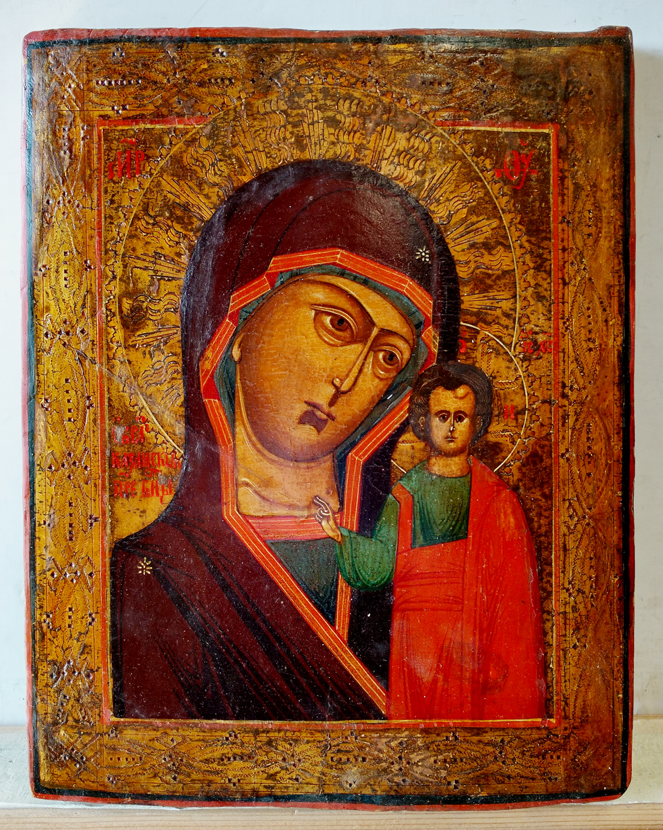 Our Lady of Kazan is a holy icon of the highest stature within the Russian Orthodox Church and considered a palladium of Russia for centuries, until its theft and likely destruction in 1904. The icon represents the Virgin Mary as the protector and patroness of the city of Kazan. It is a close-up variant of the Hodegetria (Directress) style, it is noted mainly for the Child standing, with the Virgin chest-length. The Kazan icons are traditionally small, following the original. The Kazan icon was very popular in Russia, especially as a wedding gift, and many copies were made in the design of the original. Two major Kazan Cathedrals, in Moscow and St. Petersburg, are consecrated to Our Lady of Kazan, as are numerous churches throughout the land. Her feast days are July 21 and November 4.