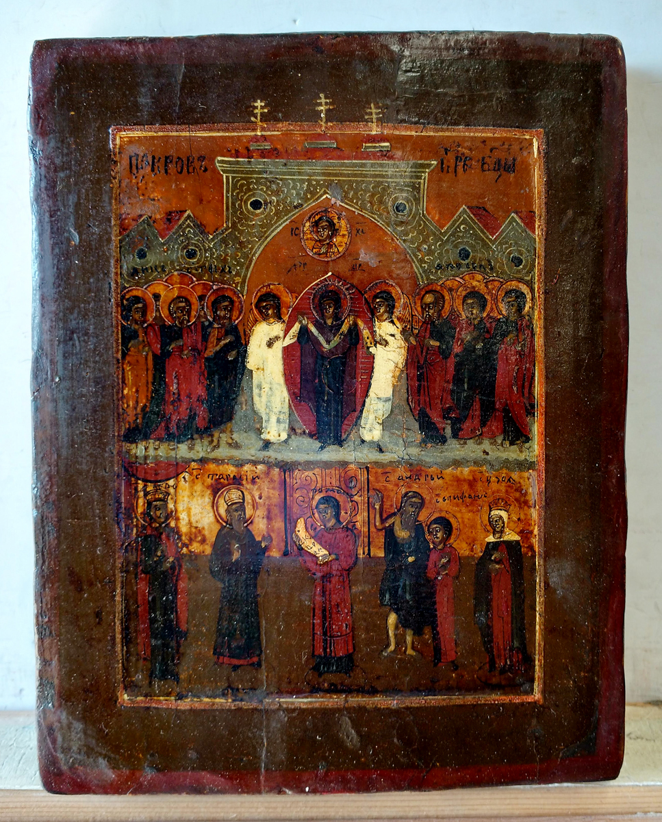 The Protection (Pokrov) of the Most Holy Mother of God is one of the most beloved Feast days on the Orthodox calendar commemorated on October 1 celebrating the appearance of the Virgin Mary in Constantinople in the 10th century at the time when the people in the city were threatened by the Barbarian invasion. Saint Andrew, the Holy Fool with his disciple Saint Epiphanius, and a group of people saw the Mother of God, Saint John the Baptist, and several other Saints and Angels during a vigil in the Church of Blachernae, nearby the city gates. The Mother of God approached the center of the church, knelt down and remained in prayer for a long time with her face drowned in tears. Then she took her veil off and spread it over the people as a sign of protection. After the appearance of the Mother of God, the danger was averted and the city was spared from bloodshed and suffering. On the icon, the Theotokos is depicted standing on a cloud in an aureola of green light with city walls behind her holding her veil surrounded by apostles, saints, and two angels behind her. Below are Saint Romanos the Melodist, Saint Epiphanius, and Saint Andrew the Fool.