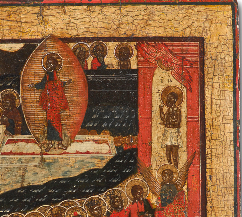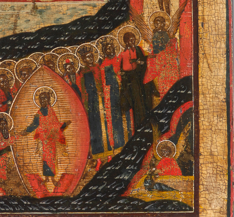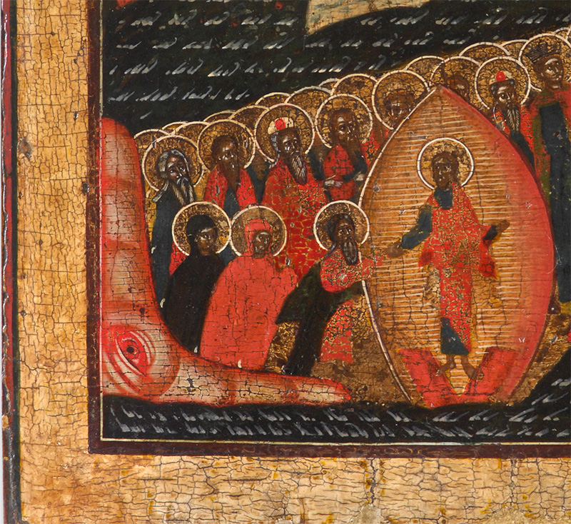 A 16th-century icon depicting the Descent Into Hades and Anastasis (the Resurrection). Christ is shown in two scenes – above in the act of Resurrection and below in his descent into Hades, breaking down the doors of Hell, binding Satan and rescuing Adam and Eve. Behind them follow the kings, the prophets, and the righteous of the Old Testament, David and Solomon wearing the crowns, John the Baptist with the scroll in hand. Feast day: Easter Sunday.