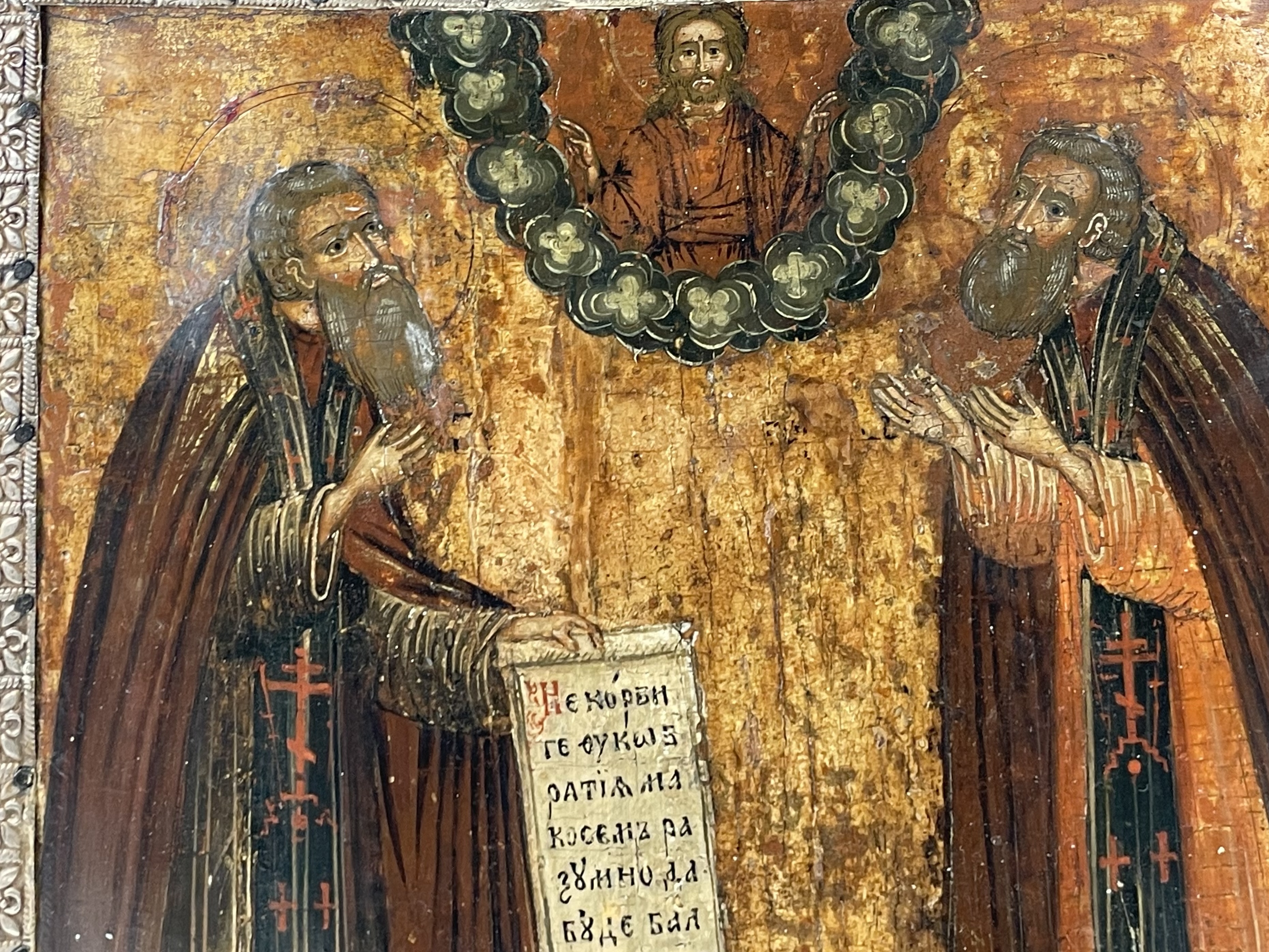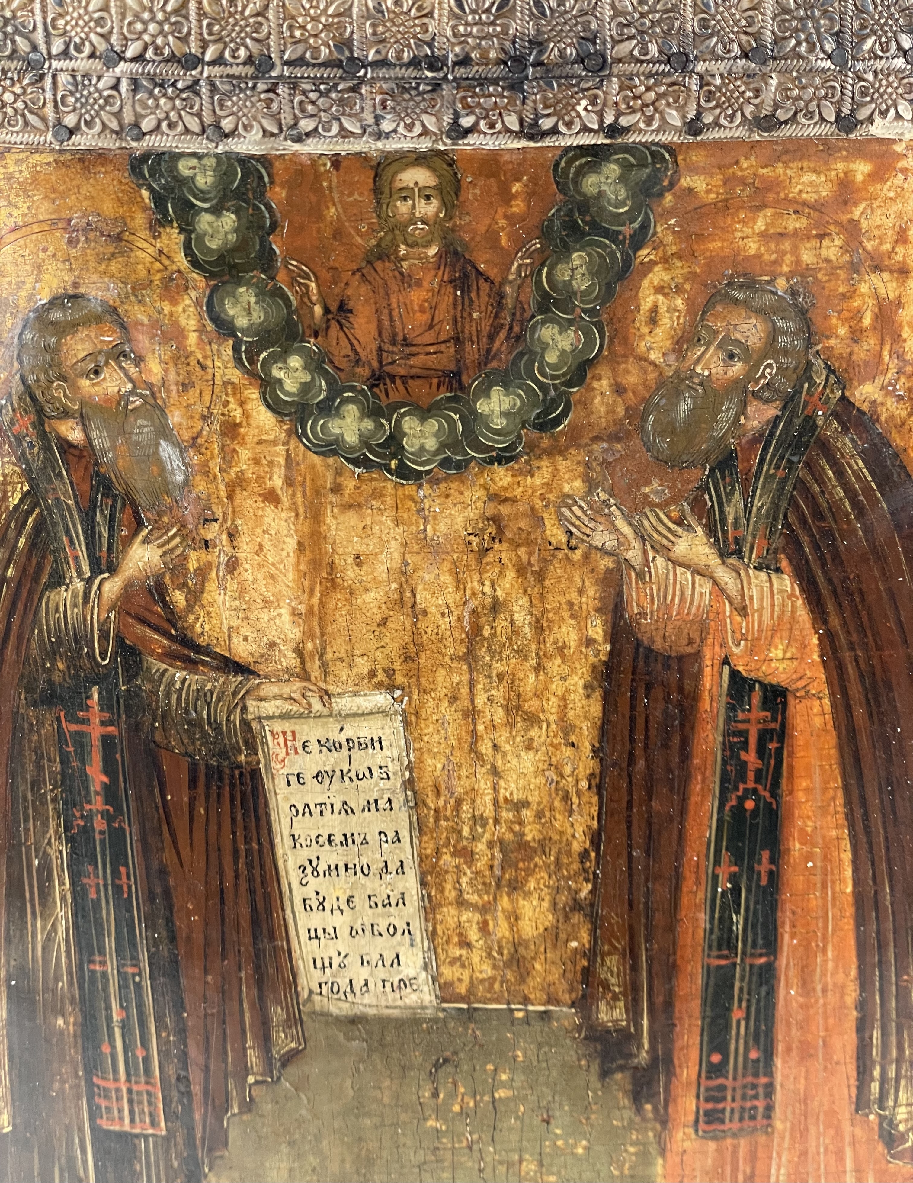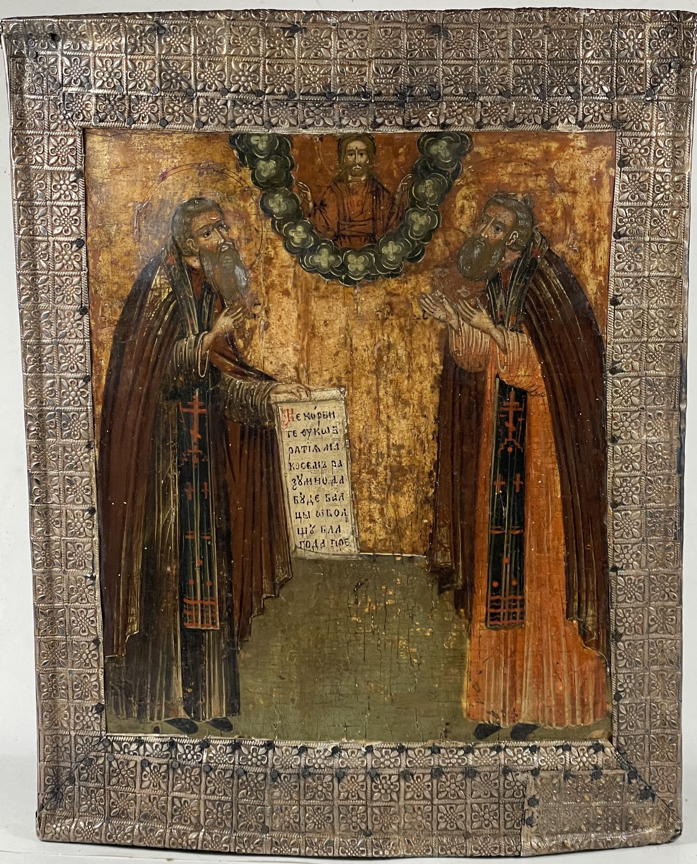 Saints Zosima and Sabbatius, highly venerated Orthodox monastic saints, were founders of the Solovetsky Monastery, a fortified monastery located on the Solovetsky Islands in the White Sea in northern Russia. The Saints are depicted full-figured, facing each other, praying to Christ in the heavens above. St. Zosima is depicted on the left holding a scroll with a traditional text "Do not grieve, brethren, but by this understand, if the essence of my deeds before God will be pleasing, then our monastery will not fail."