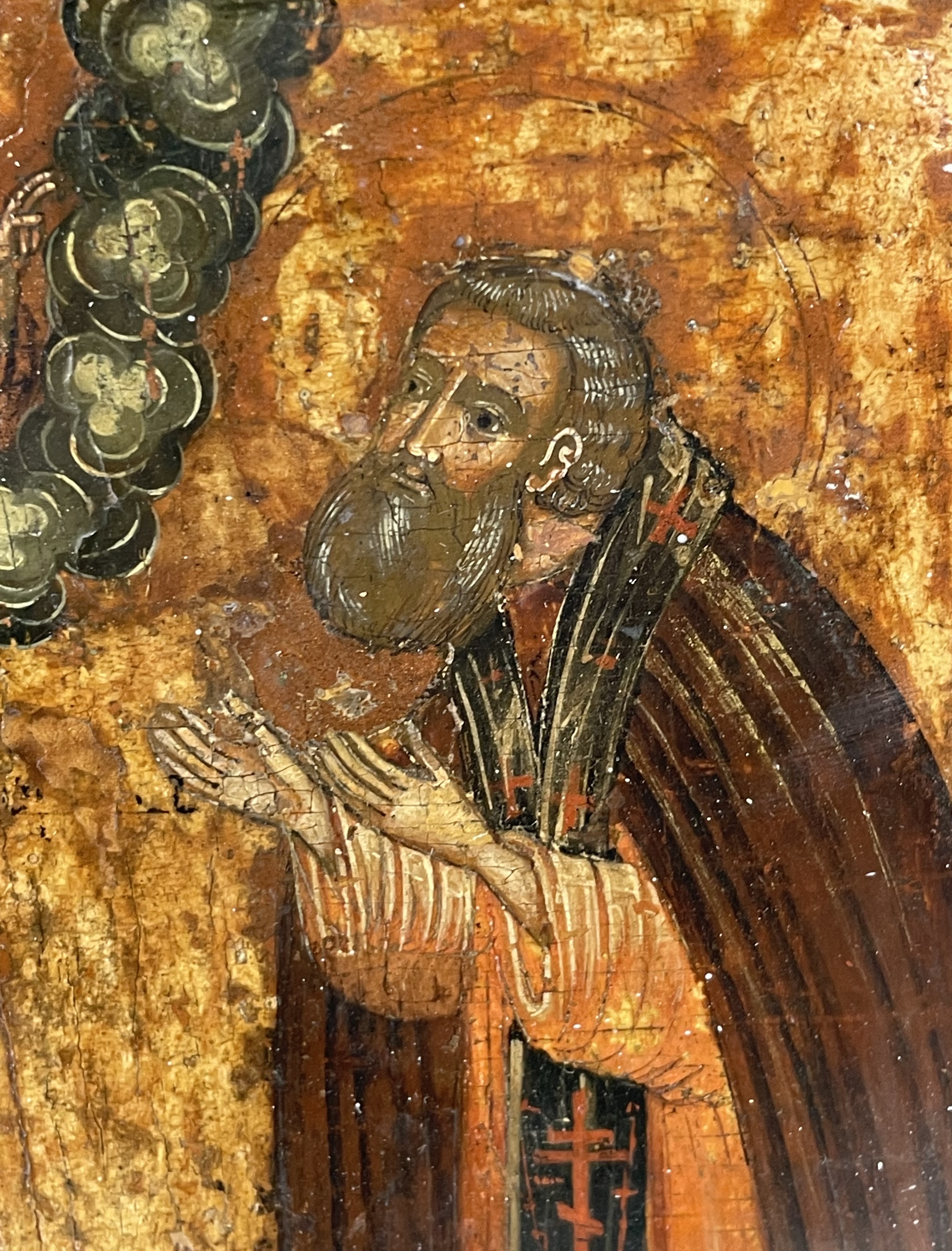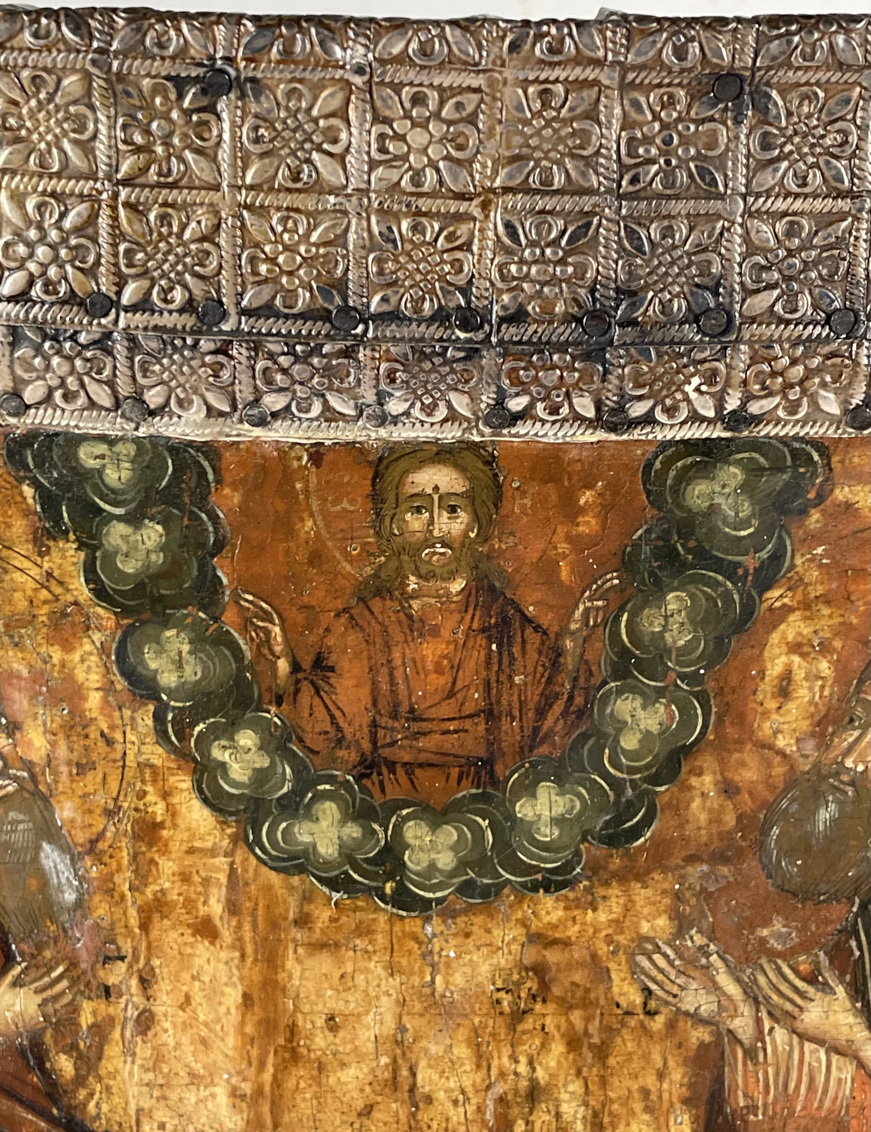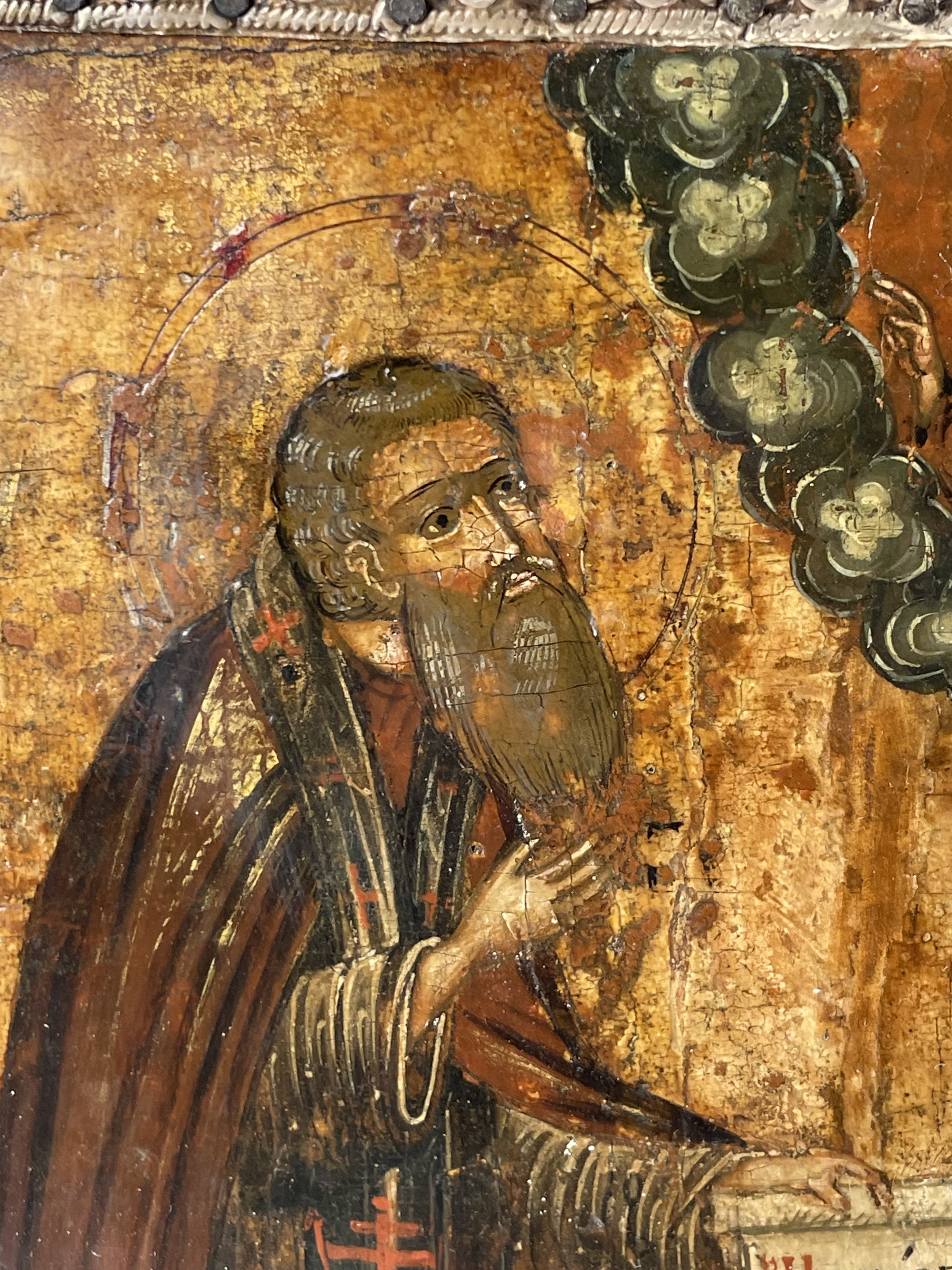 Saints Zosima and Sabbatius, highly venerated Orthodox monastic saints, were founders of the Solovetsky Monastery, a fortified monastery located on the Solovetsky Islands in the White Sea in northern Russia. The Saints are depicted full-figured, facing each other, praying to Christ in the heavens above. St. Zosima is depicted on the left holding a scroll with a traditional text "Do not grieve, brethren, but by this understand, if the essence of my deeds before God will be pleasing, then our monastery will not fail."