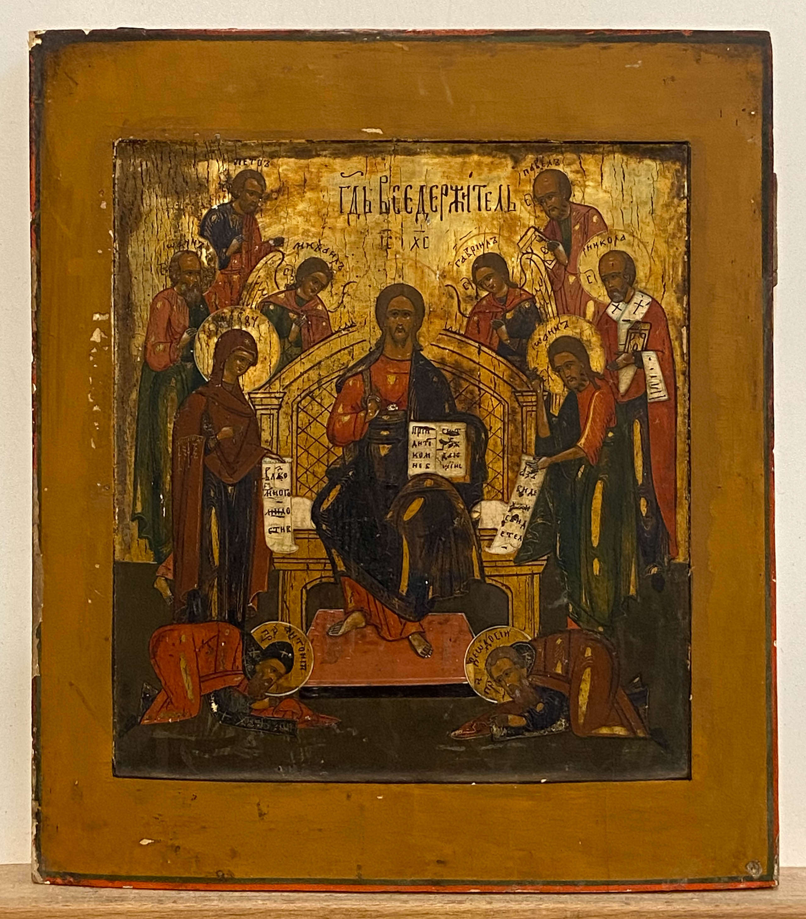 The Savior of Smolensk is the iconographic type of Jesus Christ in which he is represented as the Pantocrator – in a frontal position, with his right hand raised in a blessing gesture and his right hand holding a Gospel book. To either side of Him, are the Virgin Mary and St. John the Baptist; kneeling in prayer at His feet, are St. Sergius of Radonezh and the Venerable Barlaam of Khutyn. In the upper part of the icon, to the right and left of Christ, are angels with the instruments of passion.