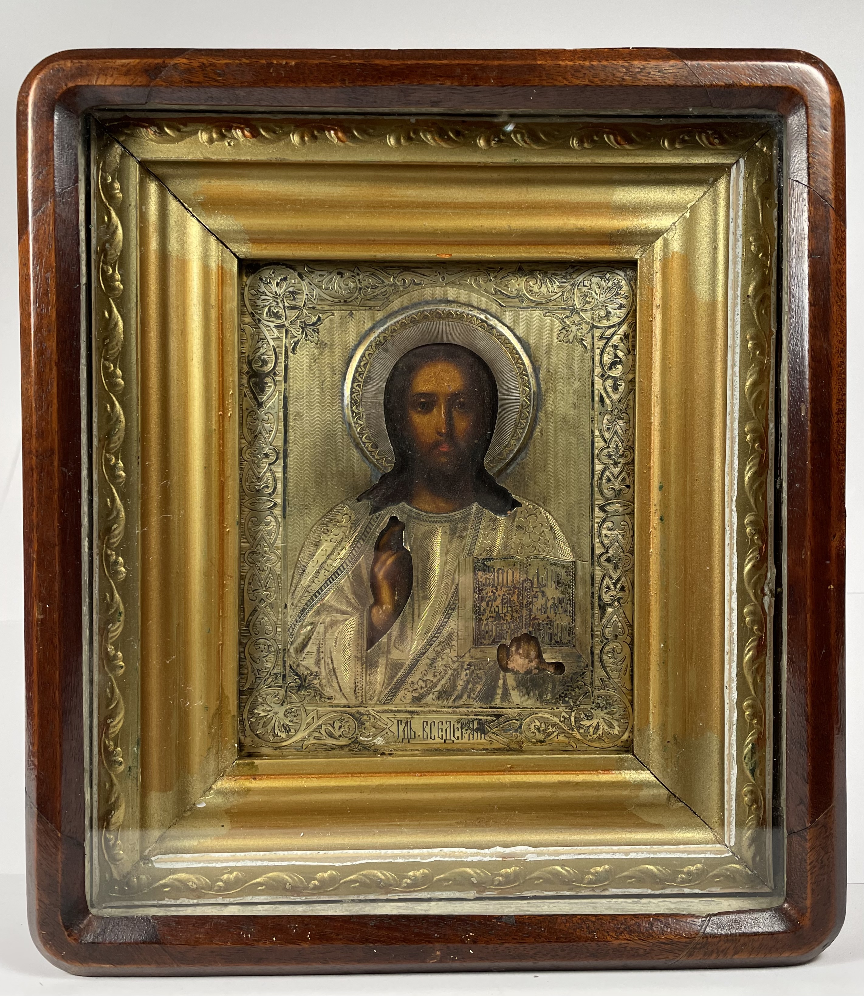 Russian Icon - Christ Pantocrator in brass oklad cover & kiot frame