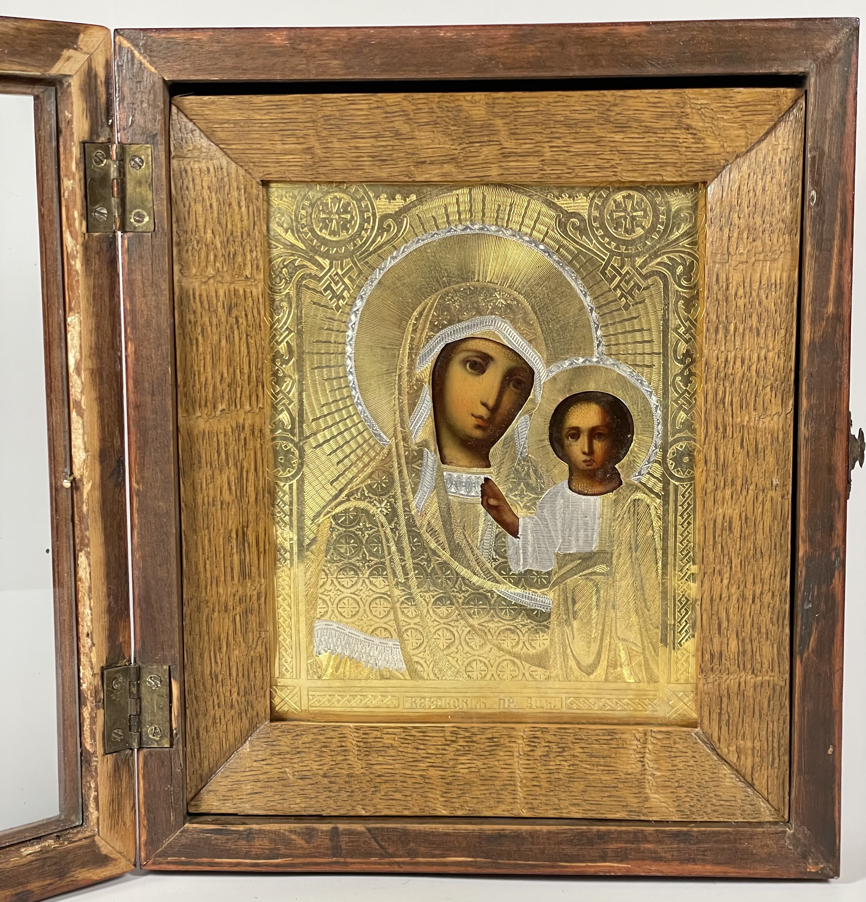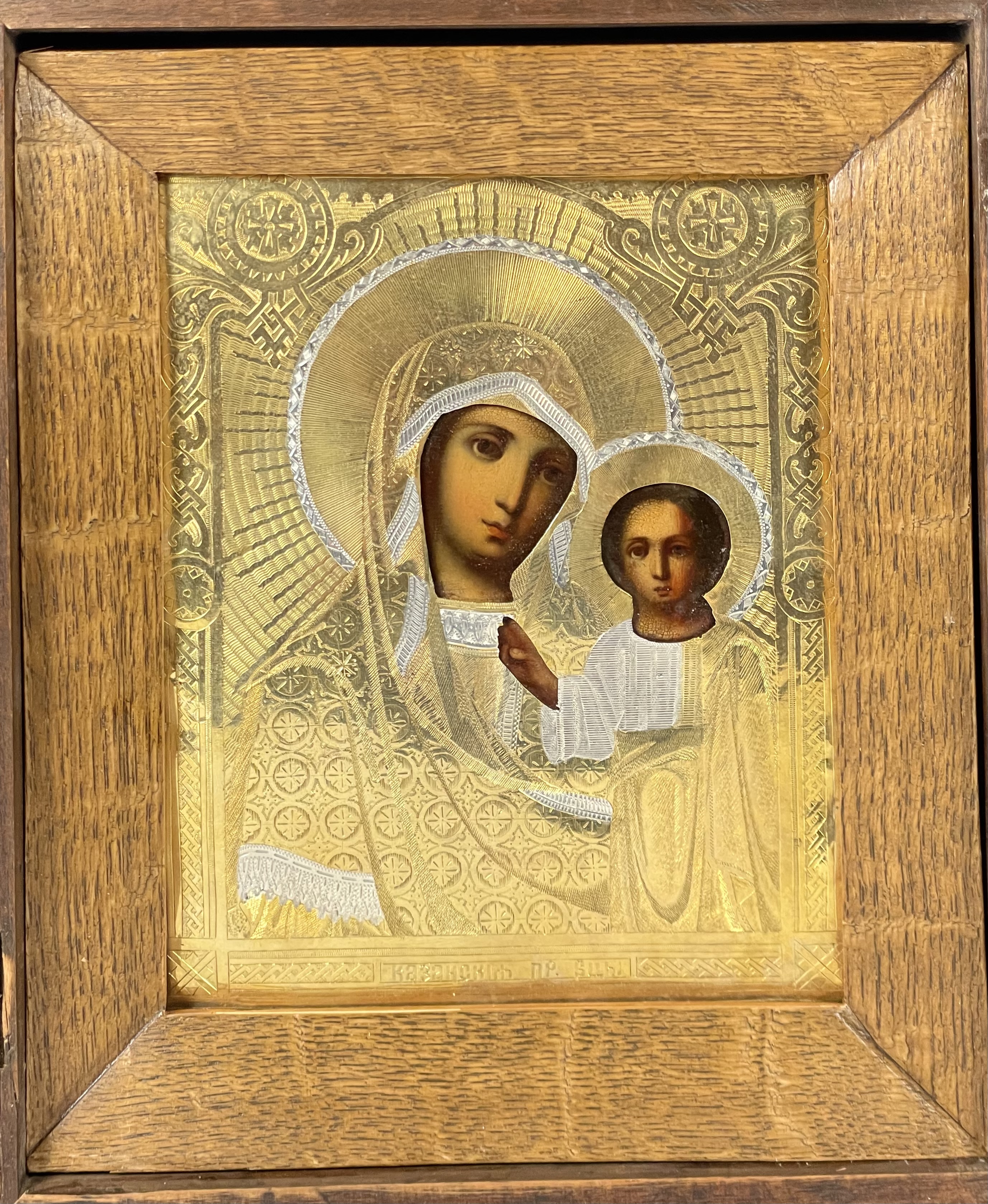 Russian icon - Our Lady of Kazan in brass cover and kiot shadow frame