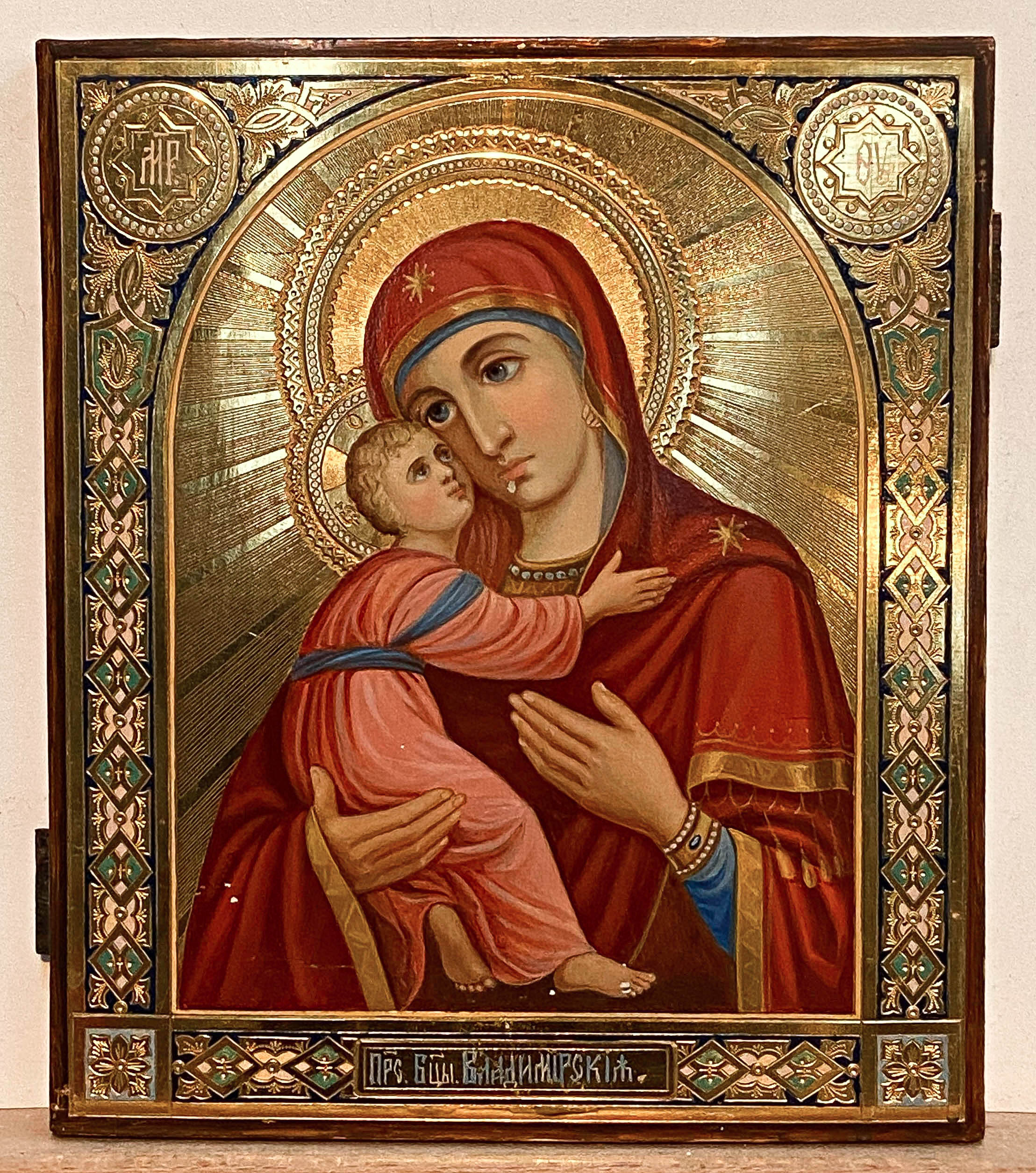 Our Lady of Vladimir is one of the most highly venerated Orthodox icons and a typical example of Byzantine iconography. The original 12th-century icon survived and is displayed in the Tretyakov Gallery museum in Moscow. Even more than most famous icons, the original has been copied repeatedly for centuries and many copies now have considerable artistic and religious significance of their own. The icon is a version of the Eleusa (Tenderness) type, with the Christ child snuggling up to his mother's cheek. The venerated image was used to celebrate the coronations of tsars, the elections of patriarchs, and other important ceremonies of the Russian state. Her feast day is June 3.