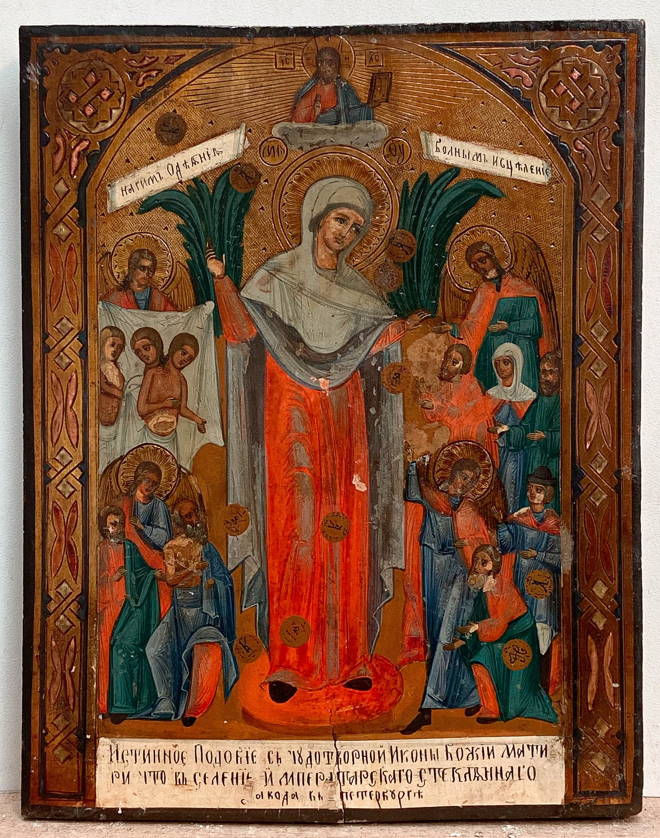 Mother of God, Joy of All Who Sorrow of Saint Petersburg is a miracle-working icon celebrated throughout Russia. On July 23, 1888, during a severe thunderstorm, lightning struck a chapel at a glass factory in St. Petersburg, burning the interior walls of the church, but leaving the icon depicting Mother of God, Joy of All Who Sorrow unharmed. From the violent disturbance of the air, the icon was knocked to the floor, the poor box broke open, and twelve copper coins adhered to the icon in various places; afterward many miracles were worked by the grace of the holy icon. The design of this icon depicts the Mother of God, standing in paradise with her Son above her. Along both sides of the icon, framing the Mother of God, are suppliants, asking for her intercession with angels assisting them. The 12 coins are depicted throughout the central field of the icon.