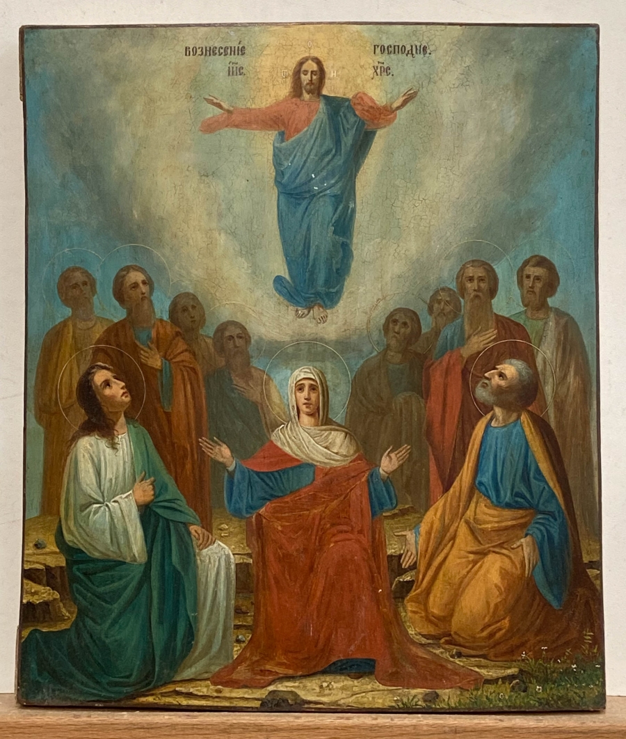 The Ascension of the Lord is recorded in the Gospels of Mark and Luke and is a major movable feast in the Orthodox Church. The icon depicts Christ rising to heaven in the circle of Divine light. Two angels on the hill below gesture toward him while his disciples look on in wonder. The Virgin Mary is standing in the center with onlooking disciples.