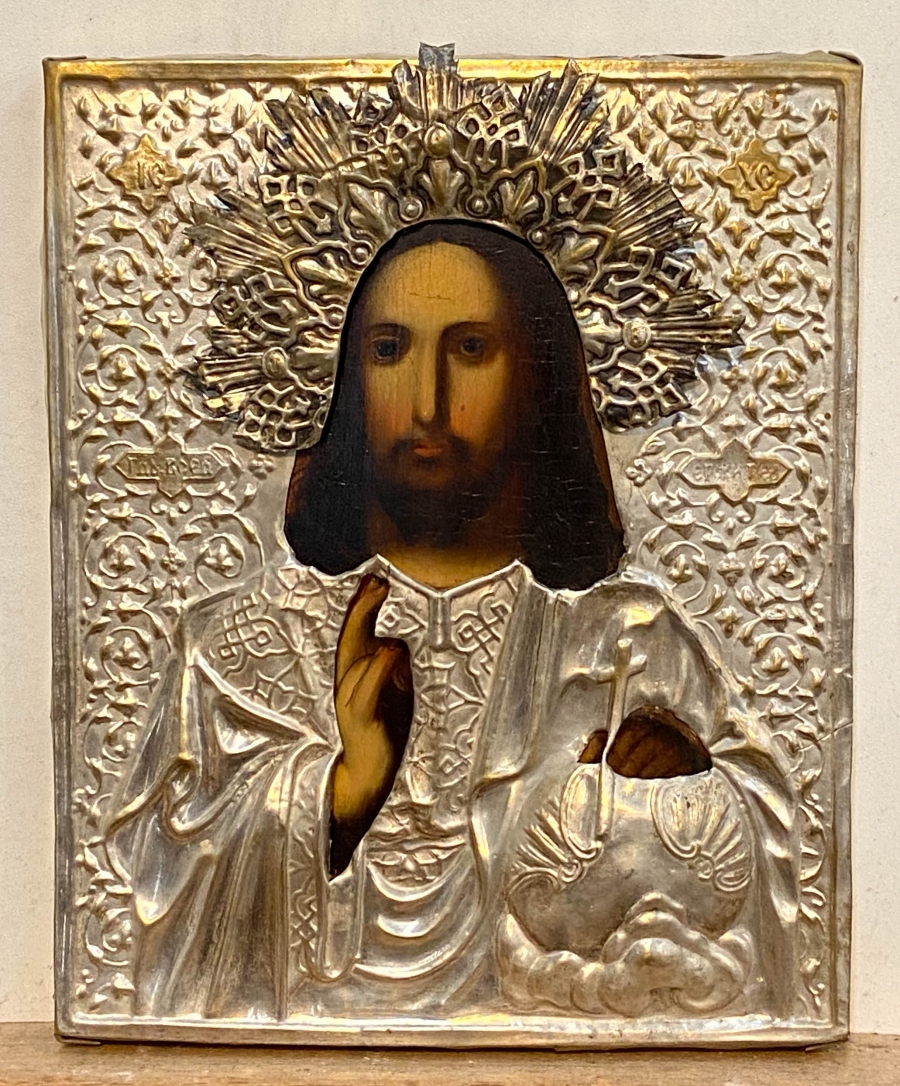 Russian Icon - Christ Pantocrator in silvered brass revetment cover