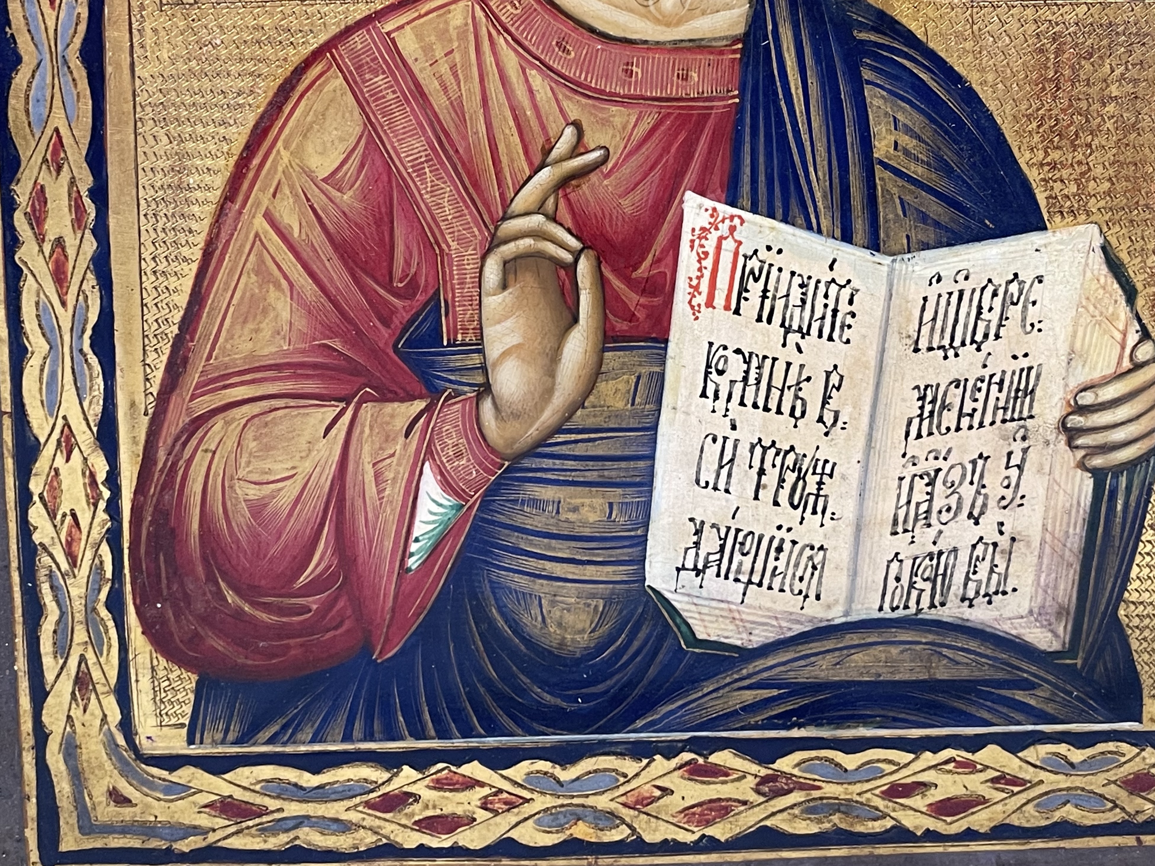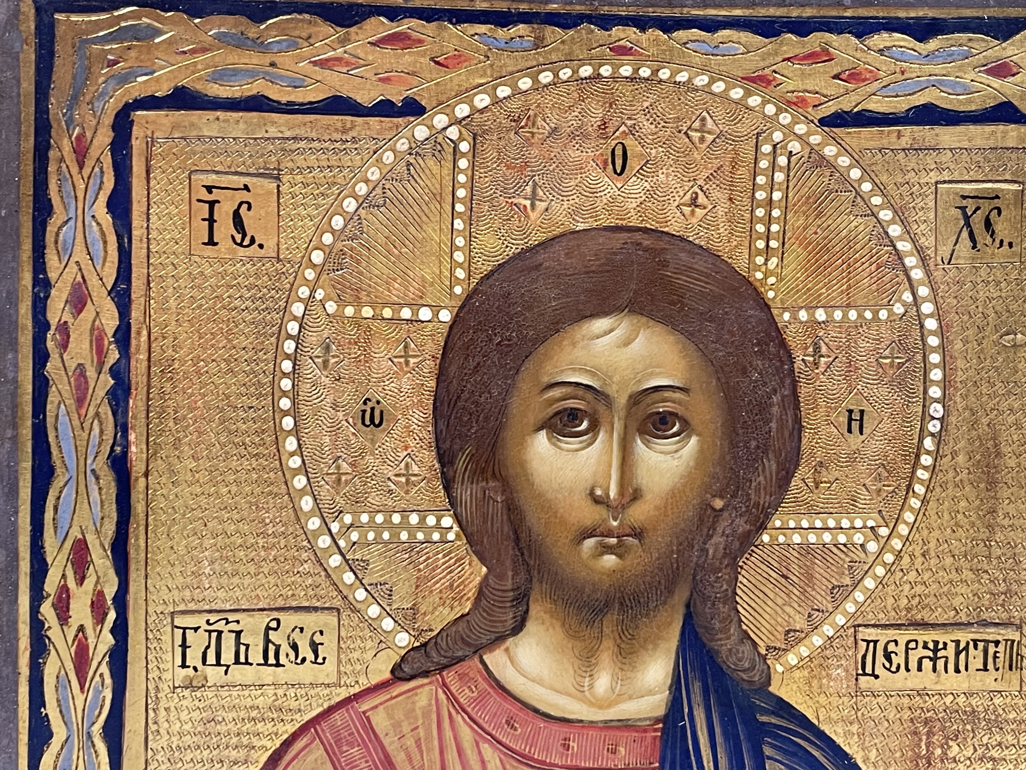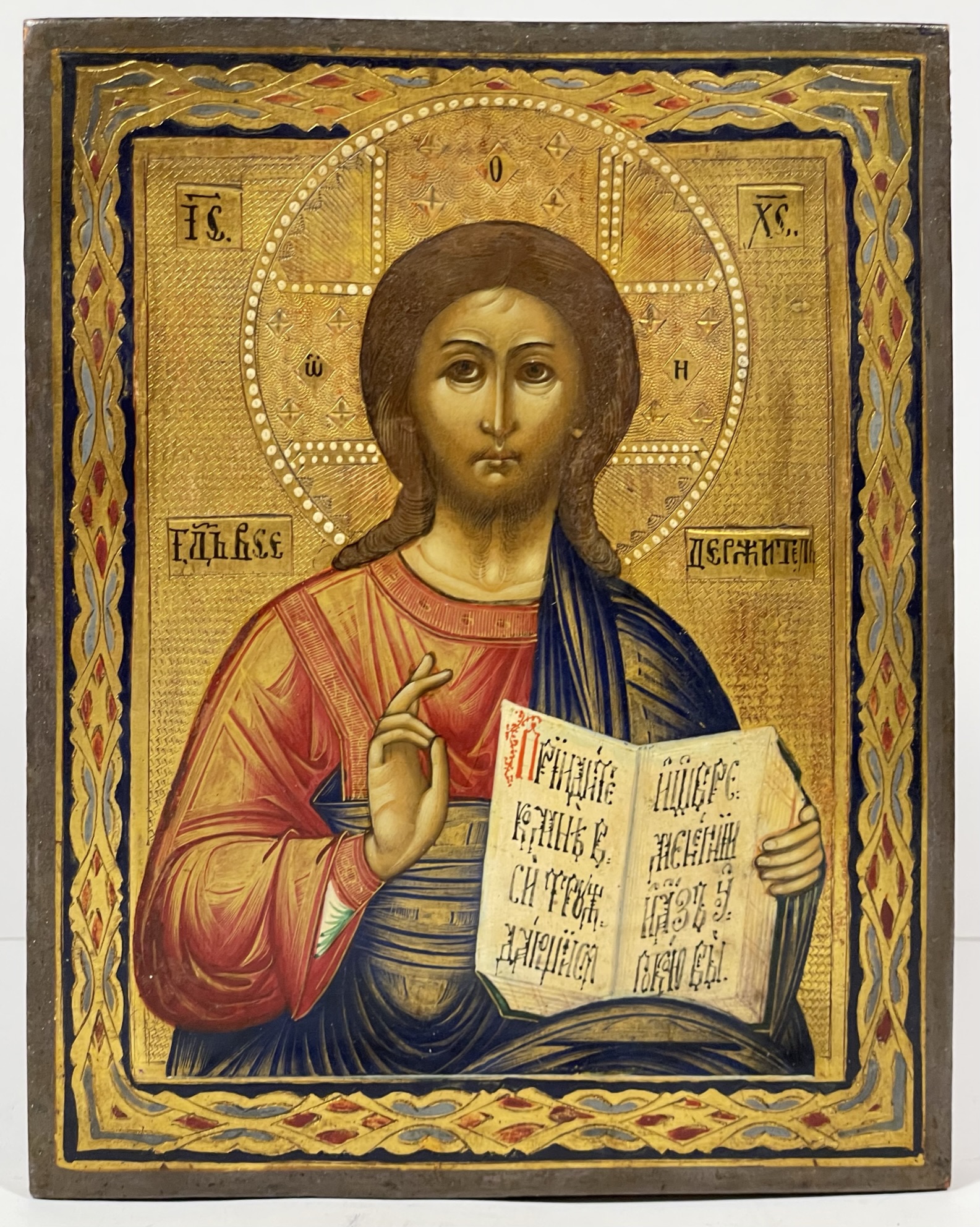 Christ Pantocrator refers to a specific depiction of Christ. The most common translation of Pantocrator is "Almighty" or "All-powerful". In this understanding, Pantocrator is a compound word formed from the Greek words for "all" and the noun "strength" (κρατος). This is often understood in terms of potential power, i.e., the ability to do anything, omnipotence. The iconic image of Christ Pantocrator was one of the first images of Christ developed in the Early Christian Church and remained a central icon of the Eastern Orthodox Church. Christ is depicted half-length, holding the Gospels in his left hand and making the blessing gesture with his right. The Gospels are opened on Matthew 11:28 “Come unto me, all ye that labor and are heavy laden, and I will give you rest.”