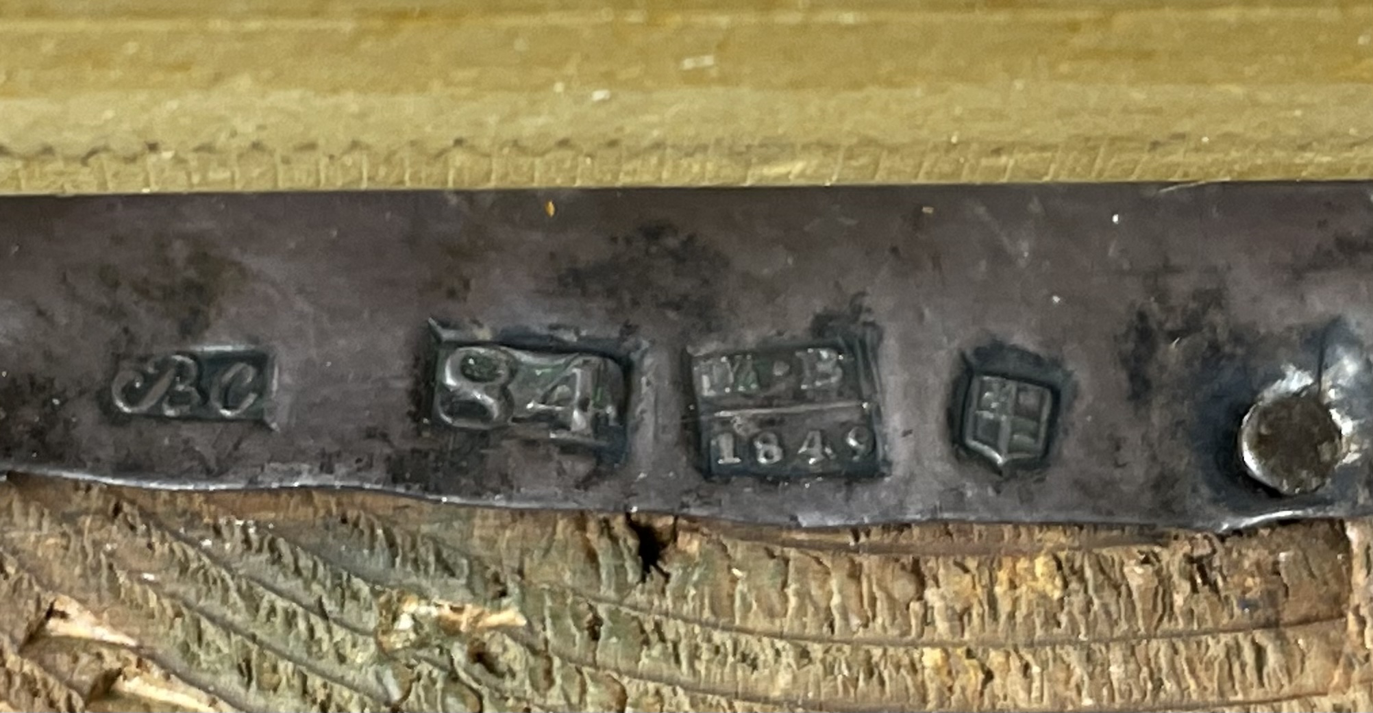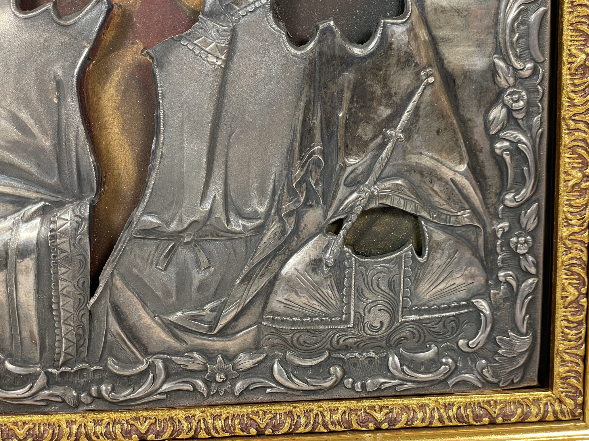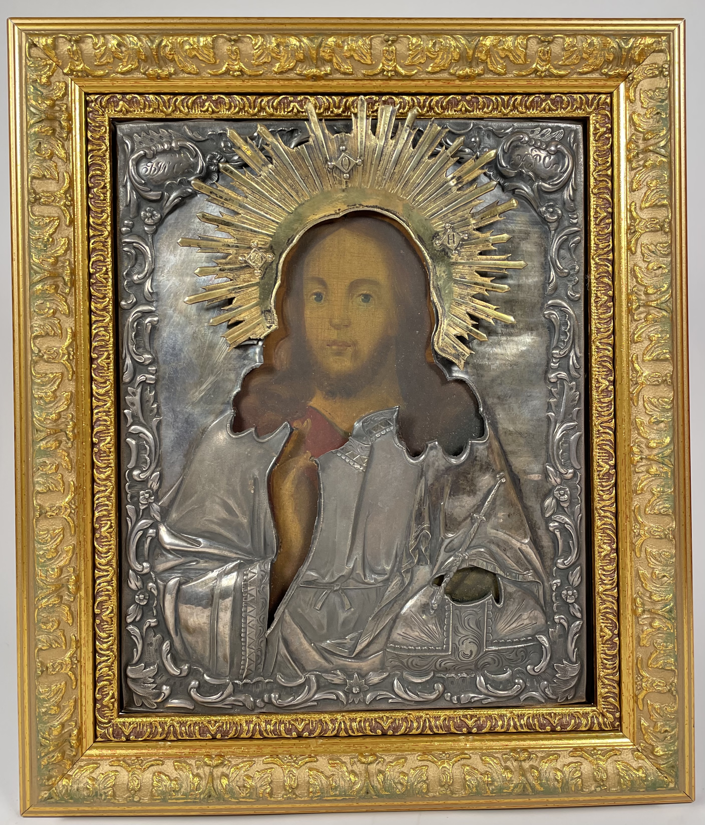 The icon is hallmarked with a town mark for the Russian town of Kostroma, the silversmith's mark BC for Vassily Savelyev, and the assayer's mark dated 1849. The icon is framed in a contemporary gilt wood frame.