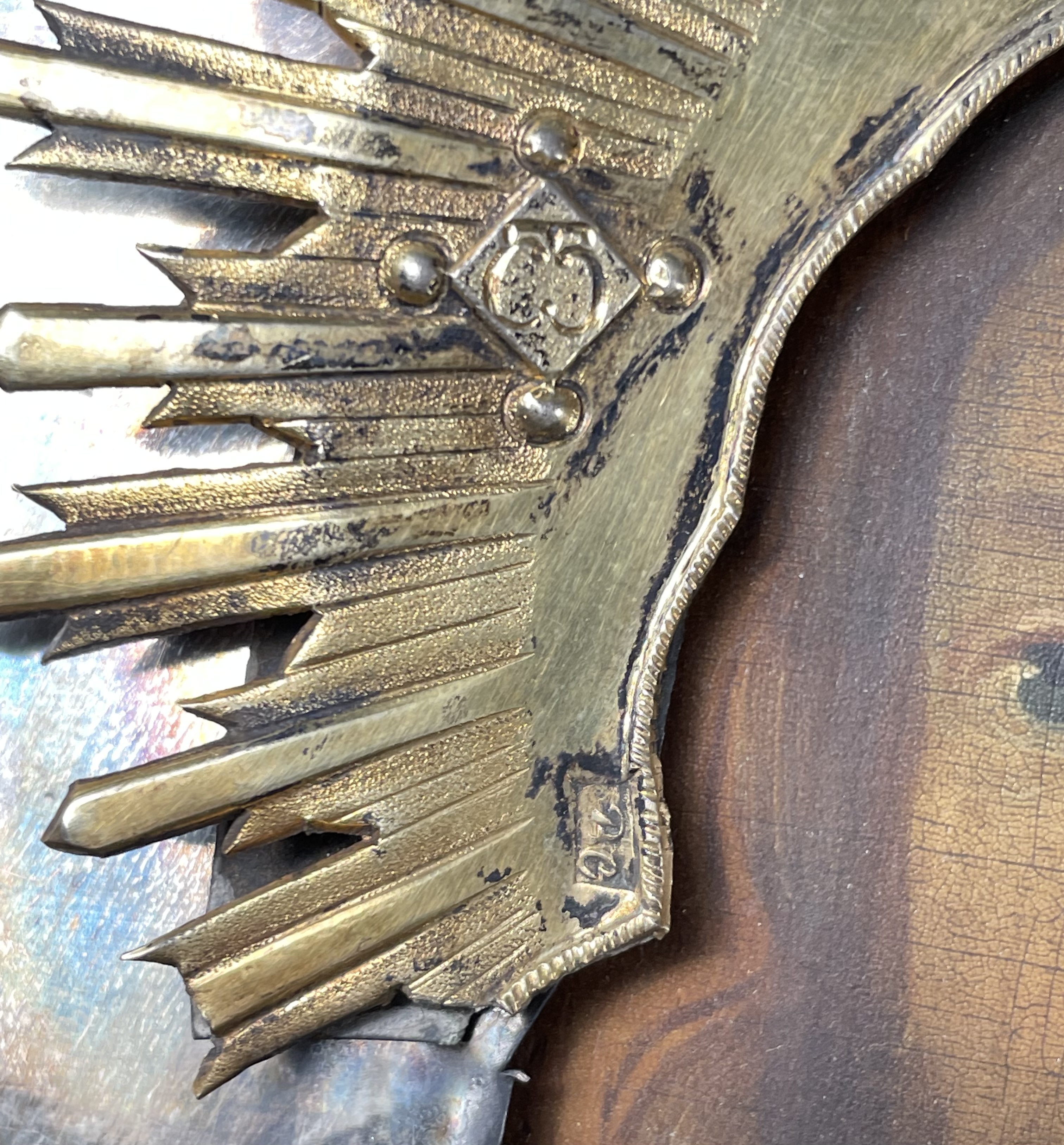 Christ Pantocrator is one of the most common subjects in Russian iconography, and its iconography follows a traditional pattern. In these icons, The term "Pantocrator" means "Almighty" or "Ruler of All," and the image of Christ in this role conveys his power and authority as the divine judge and ruler of the world. The icon portrays Christ with a stern expression, indicating his righteous judgment and the seriousness of his message. The icon's composition features Christ as Pantocrator - pictured half-figured blessing with his right hand while holding an Orb and a Cross in his left hand. It is covered by an ornate silver oklad revetment cover with a separately attached multilayered gilt-silver halo.
