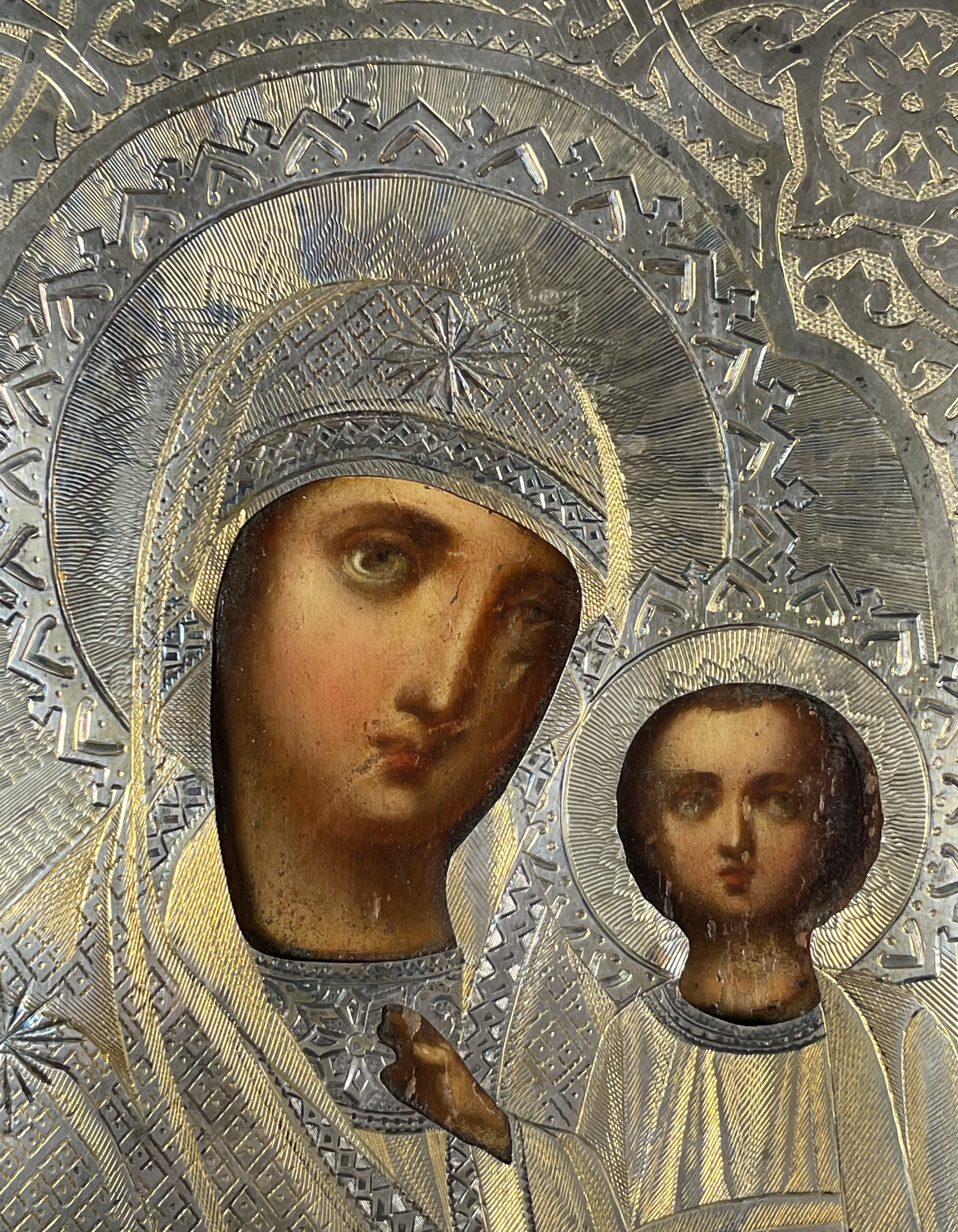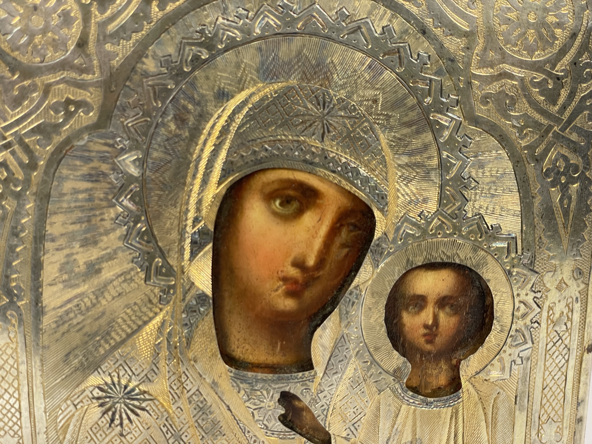 The icon is covered with a gilt silver cover hallmarked with a town mark of Moscow, assayer's mark dated 1877 and maker's mark СГ for a well-known maker Semyon Galkin.