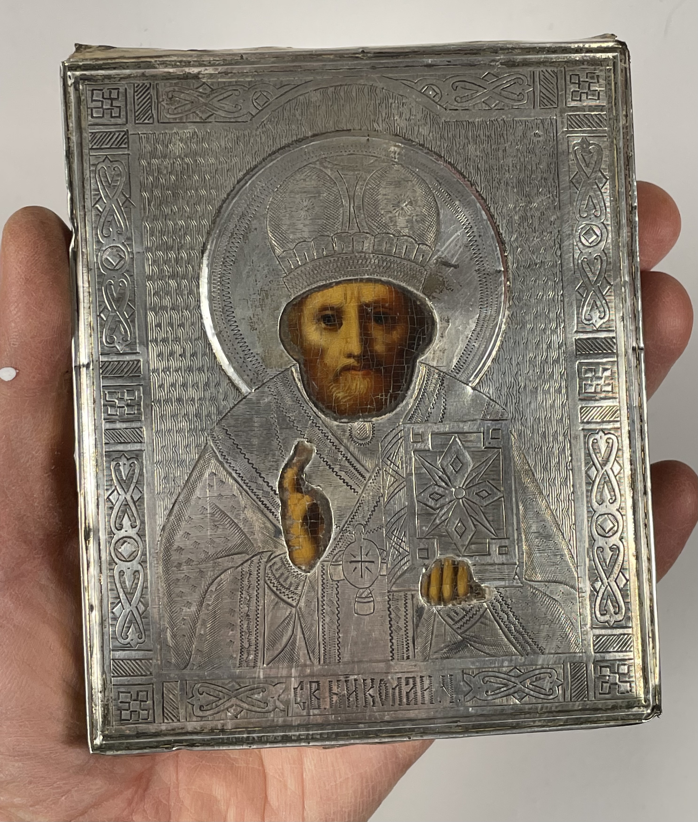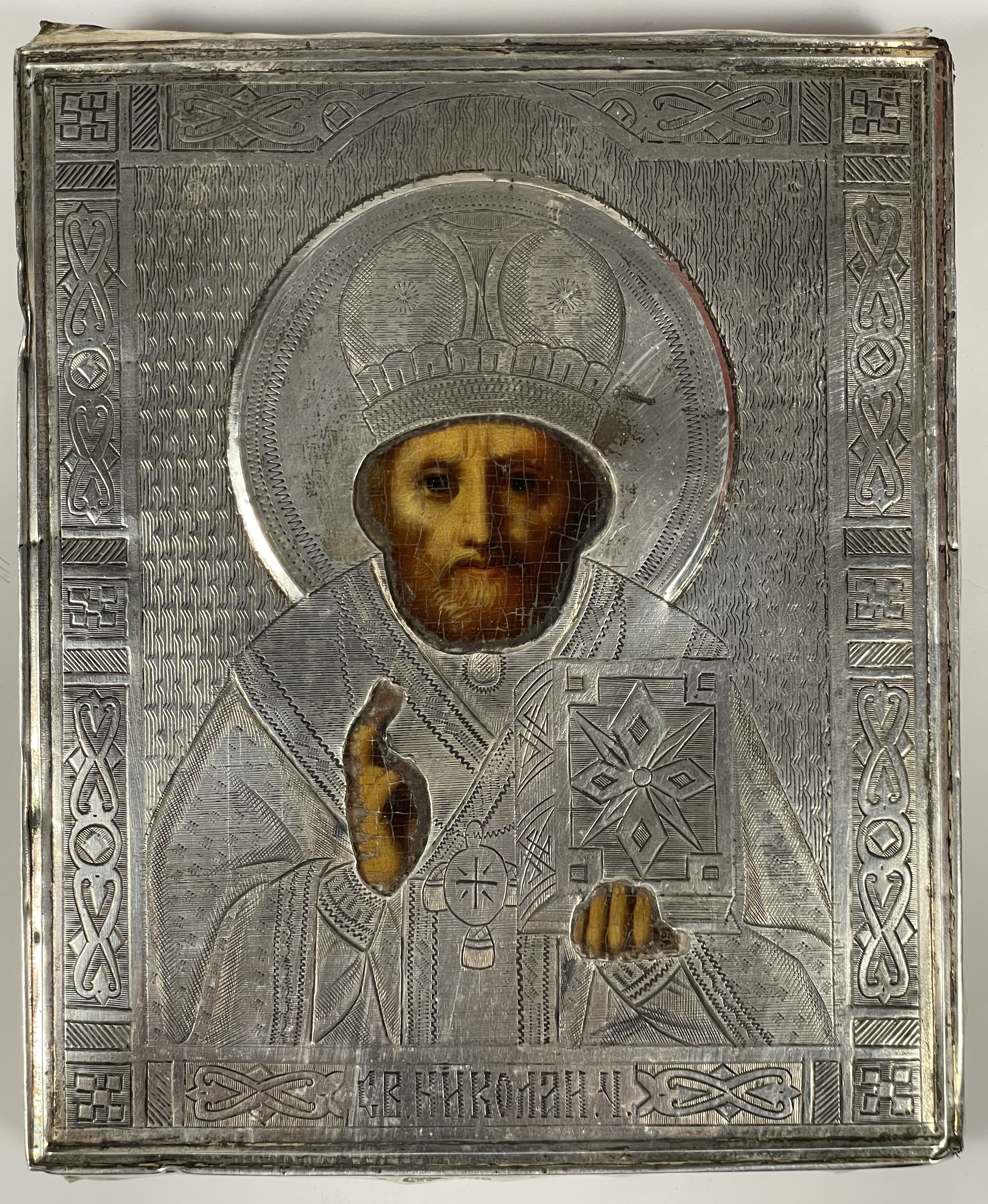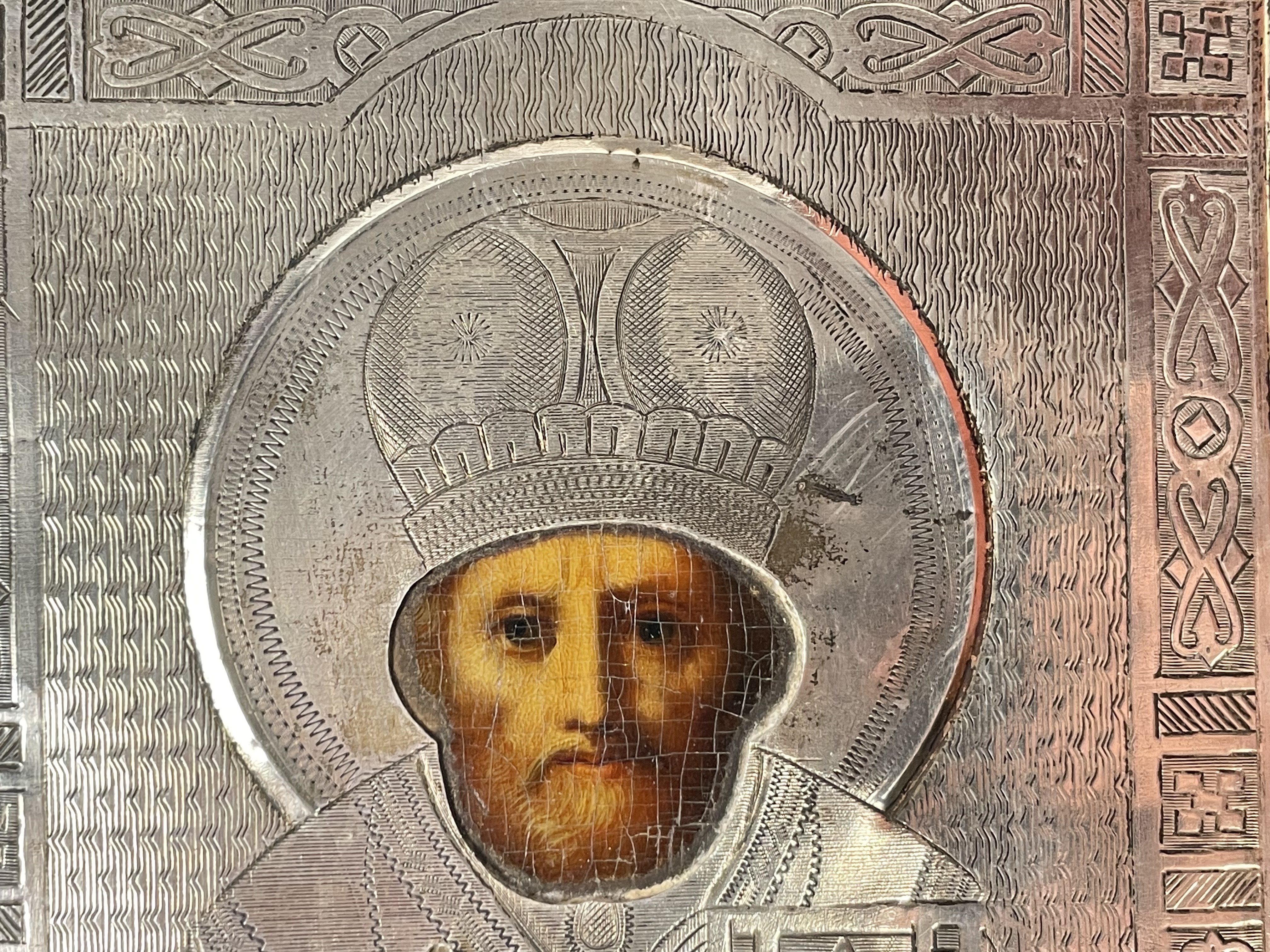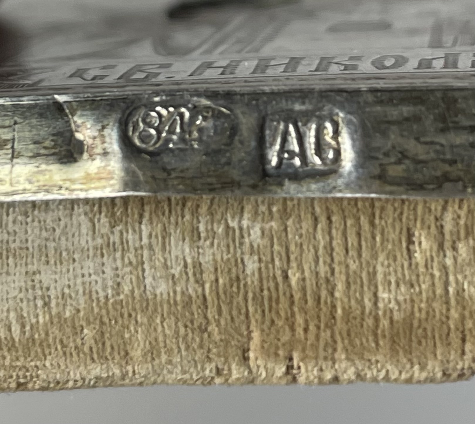 The icon is covered by silver revetment cover with a ca. 1880's Moscow town mark and maker's mark AC for Alexander Sparyshkin.