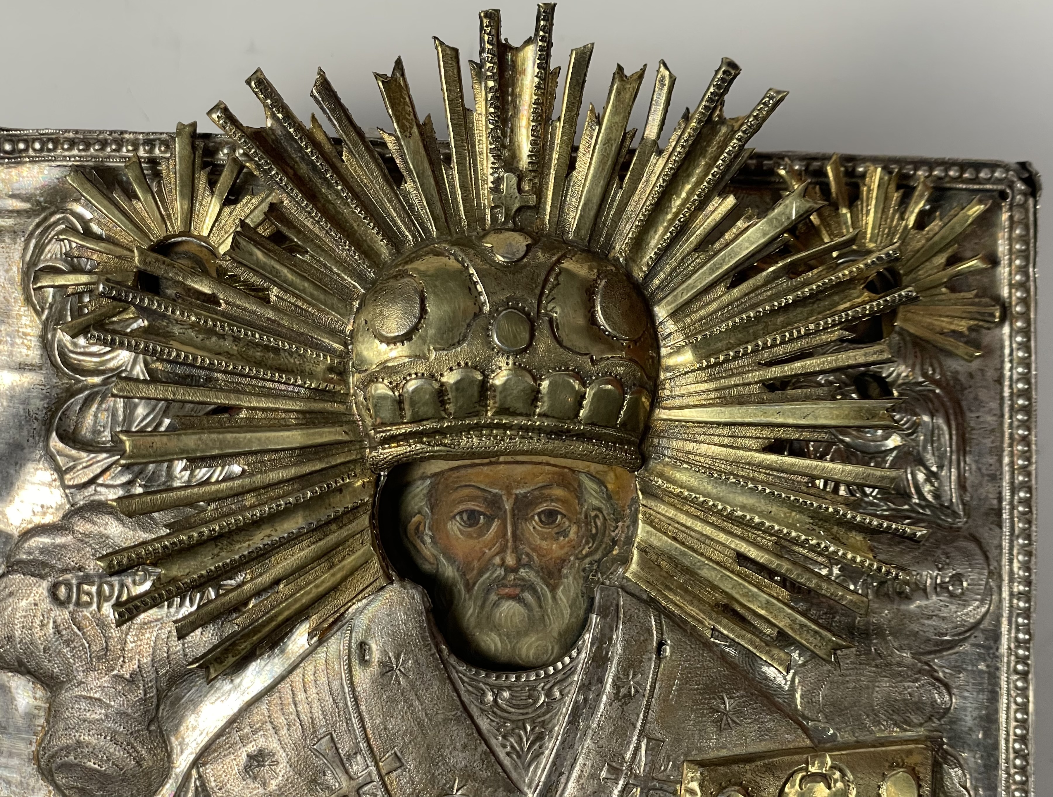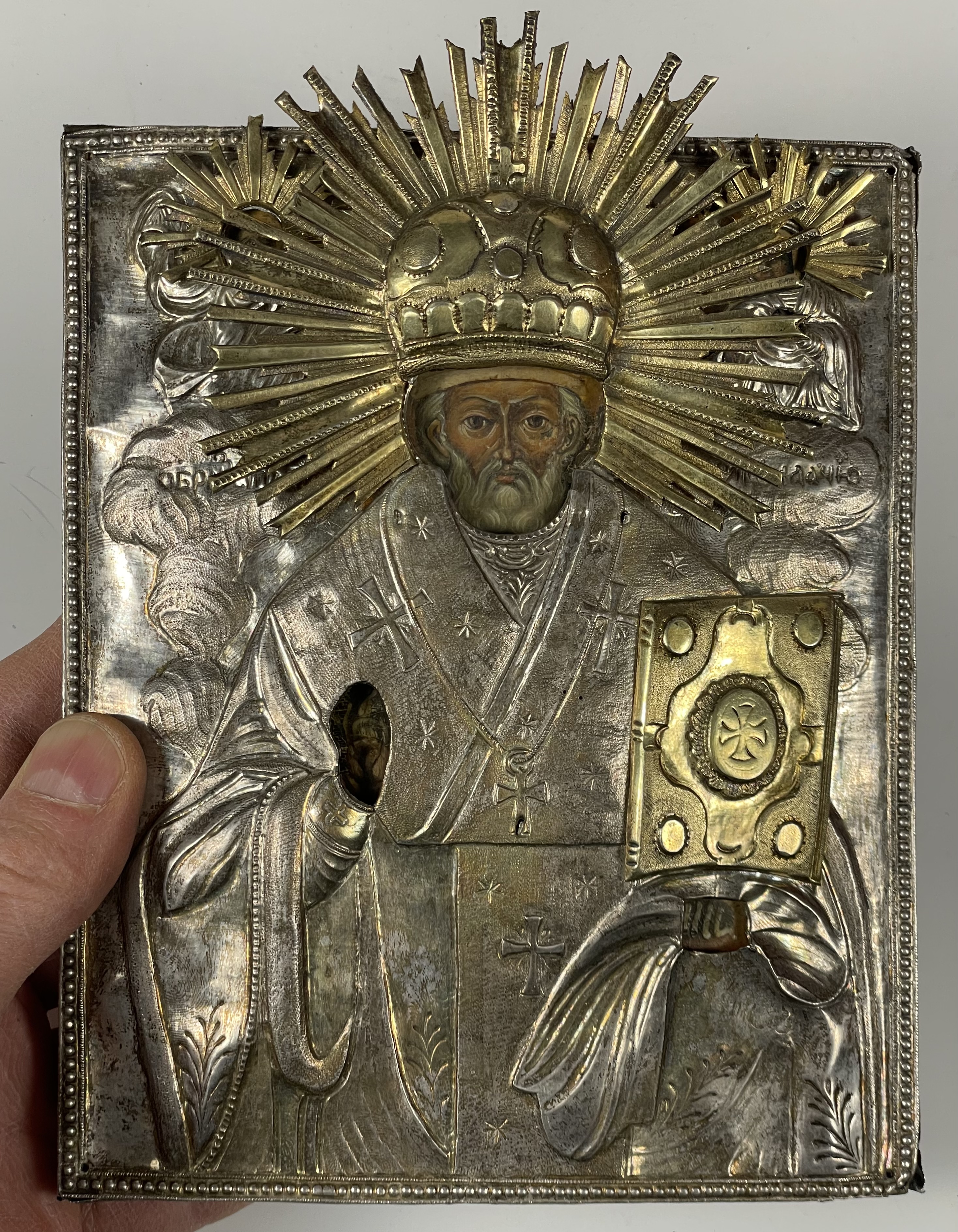 The icon is covered by an unmarked parcel-gilt silver revetment cover.