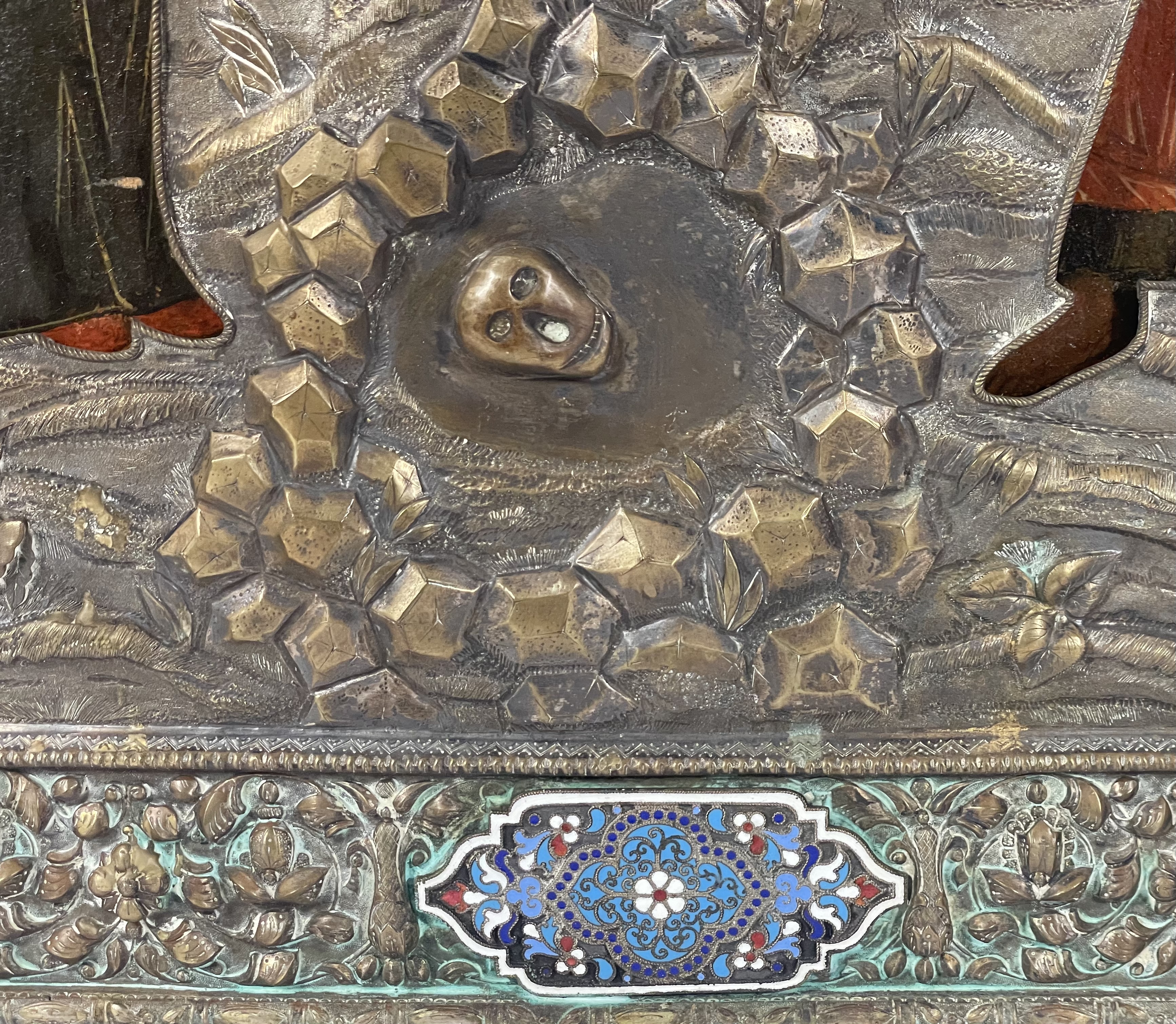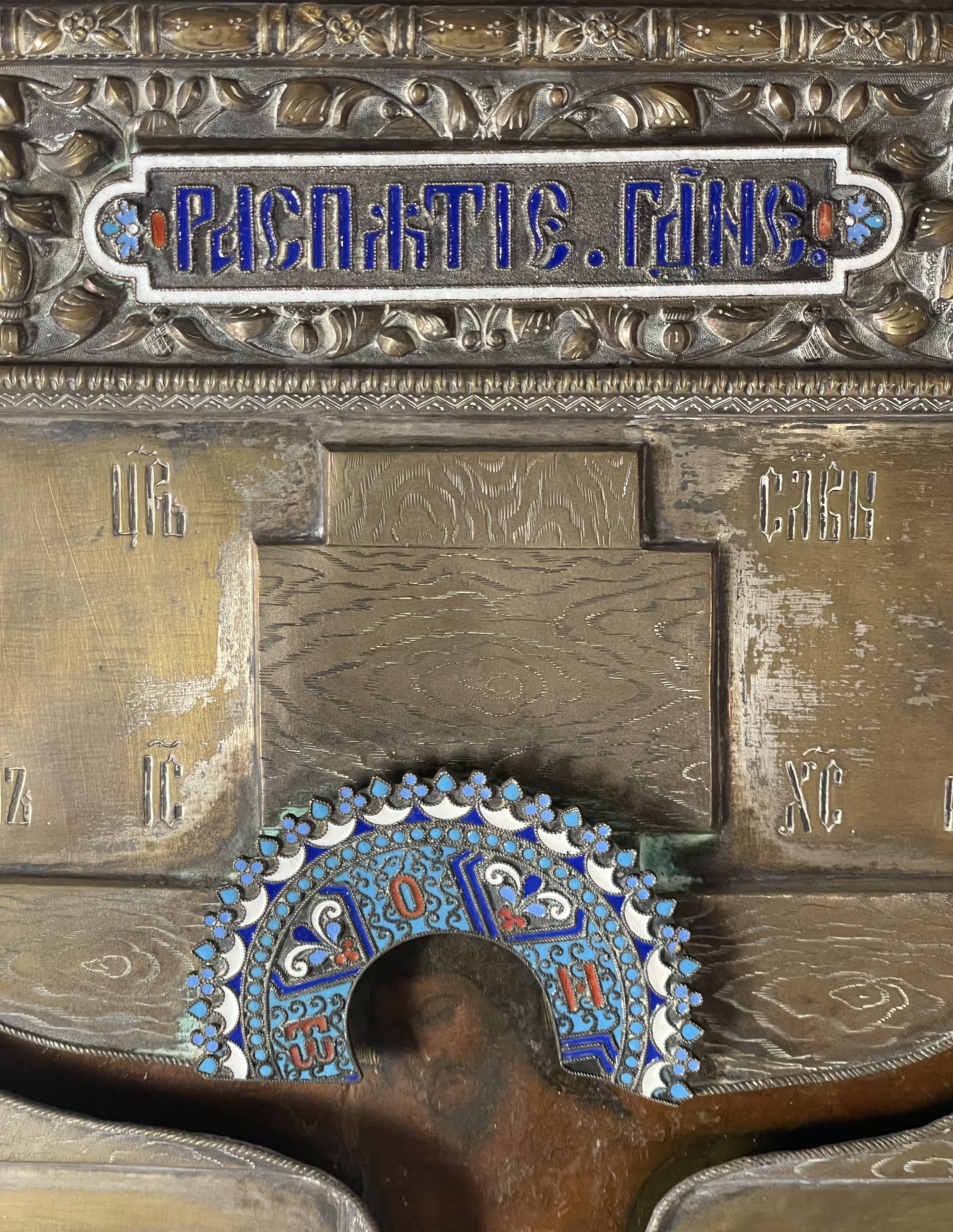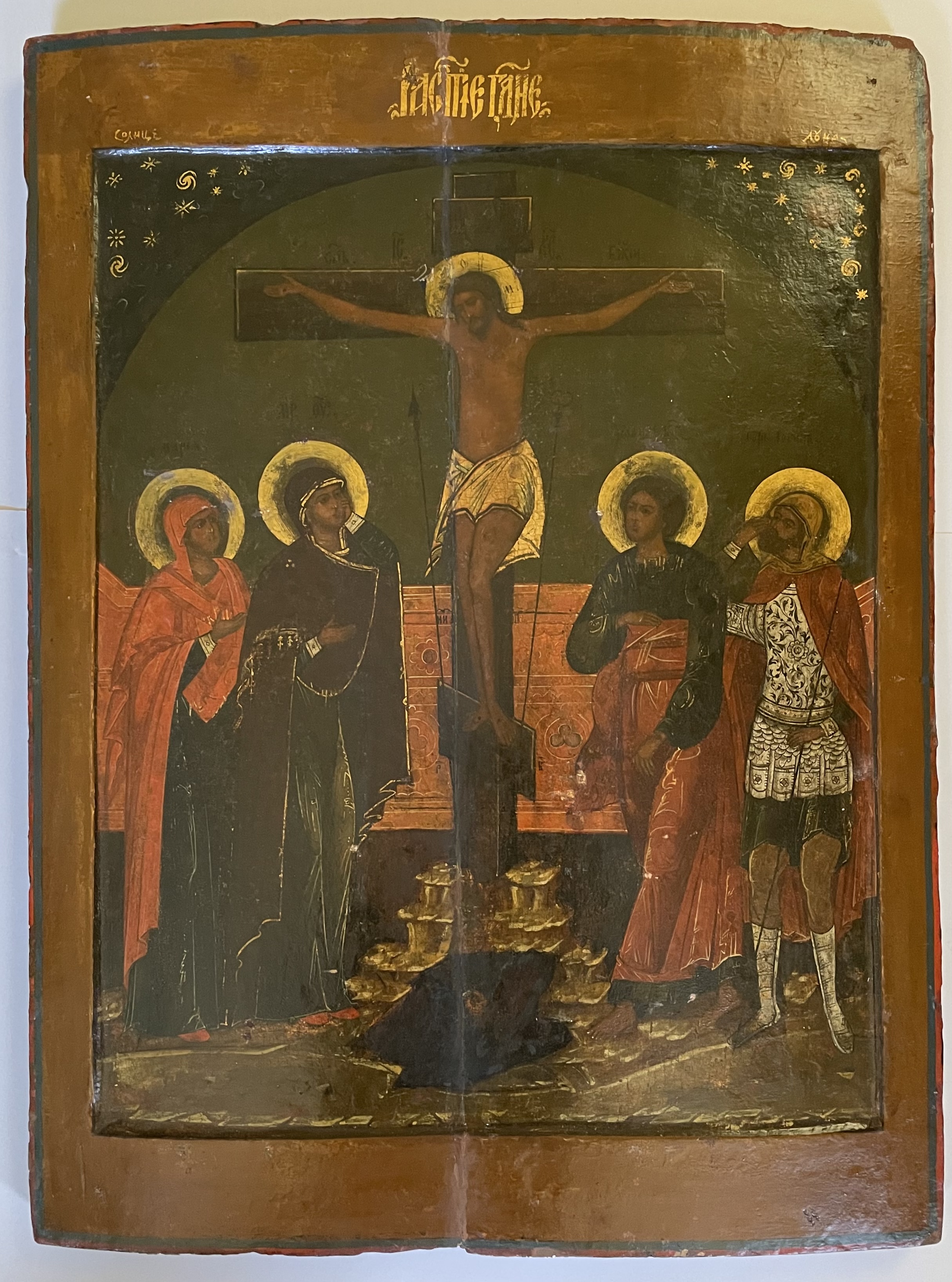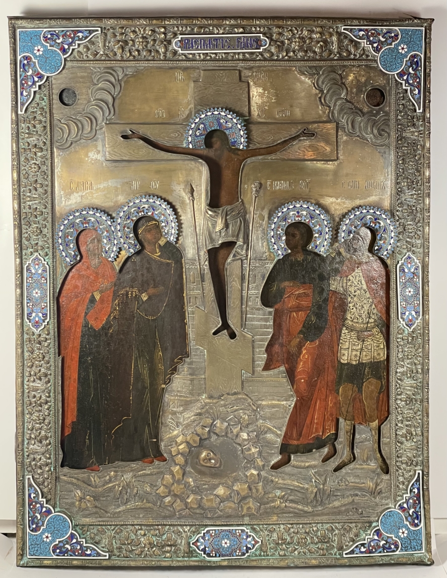 A large church icon depicting the crucified Christ flanked by the Virgin Mary, St. John the Apostle, St. Mary Magdalene, and St. Longinus the Centurion. In the corners are depicted the Sun and the Moon, behind the Cross are the walls of Jerusalem, and below is the Adam's head. The enameled plaque, just above Christ’s head, reads "The Crucifixion of Our Lord." The abbreviated inscriptions around Christ's head read: "Jesus Christ, King of Glory and Son of God." The heavy parcel-silvered brass revetment cover and the halos are decorated with intricate polychrome enamel. The icon dates to the 18th century and the embellished cover was added in the 19th century.