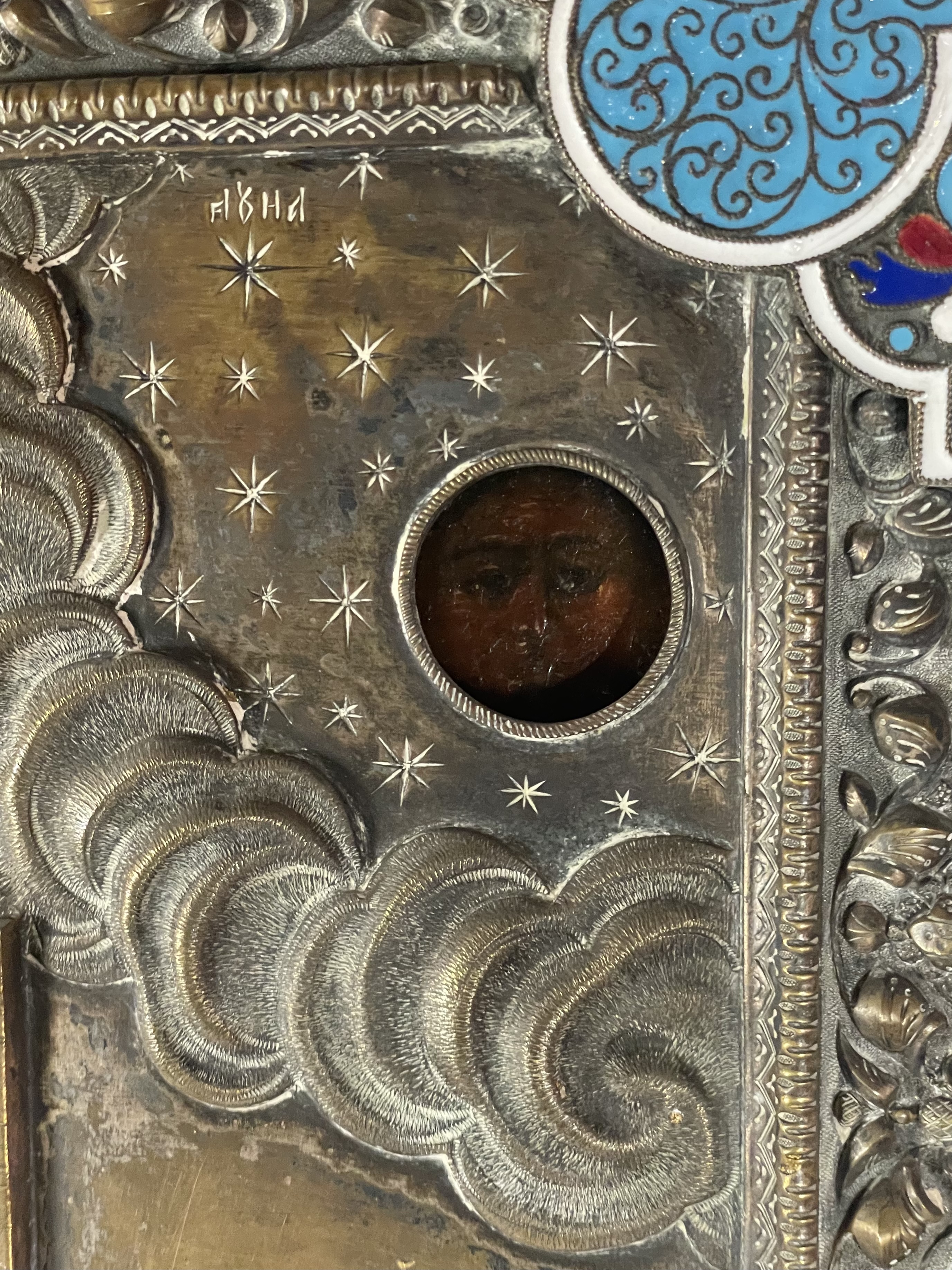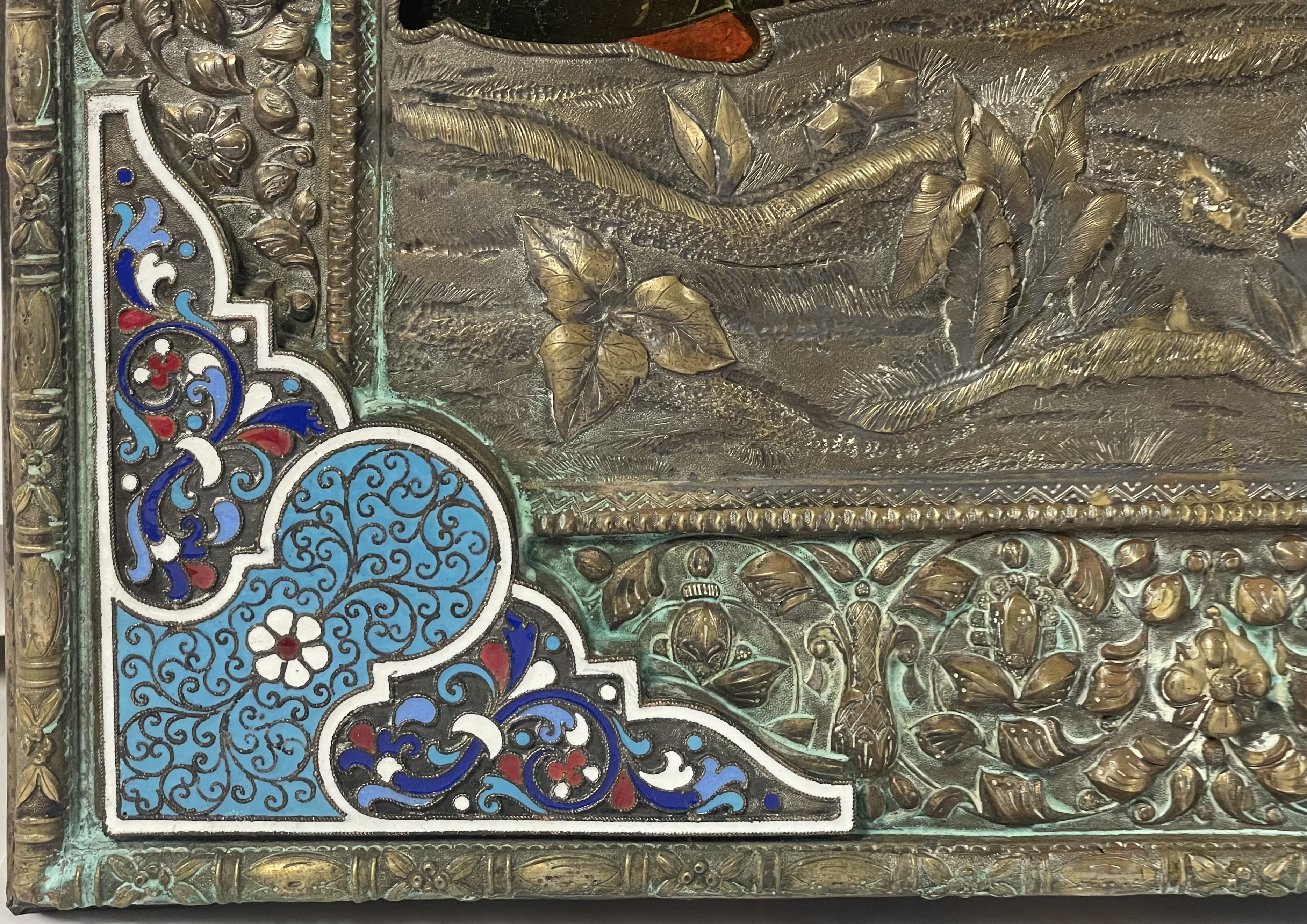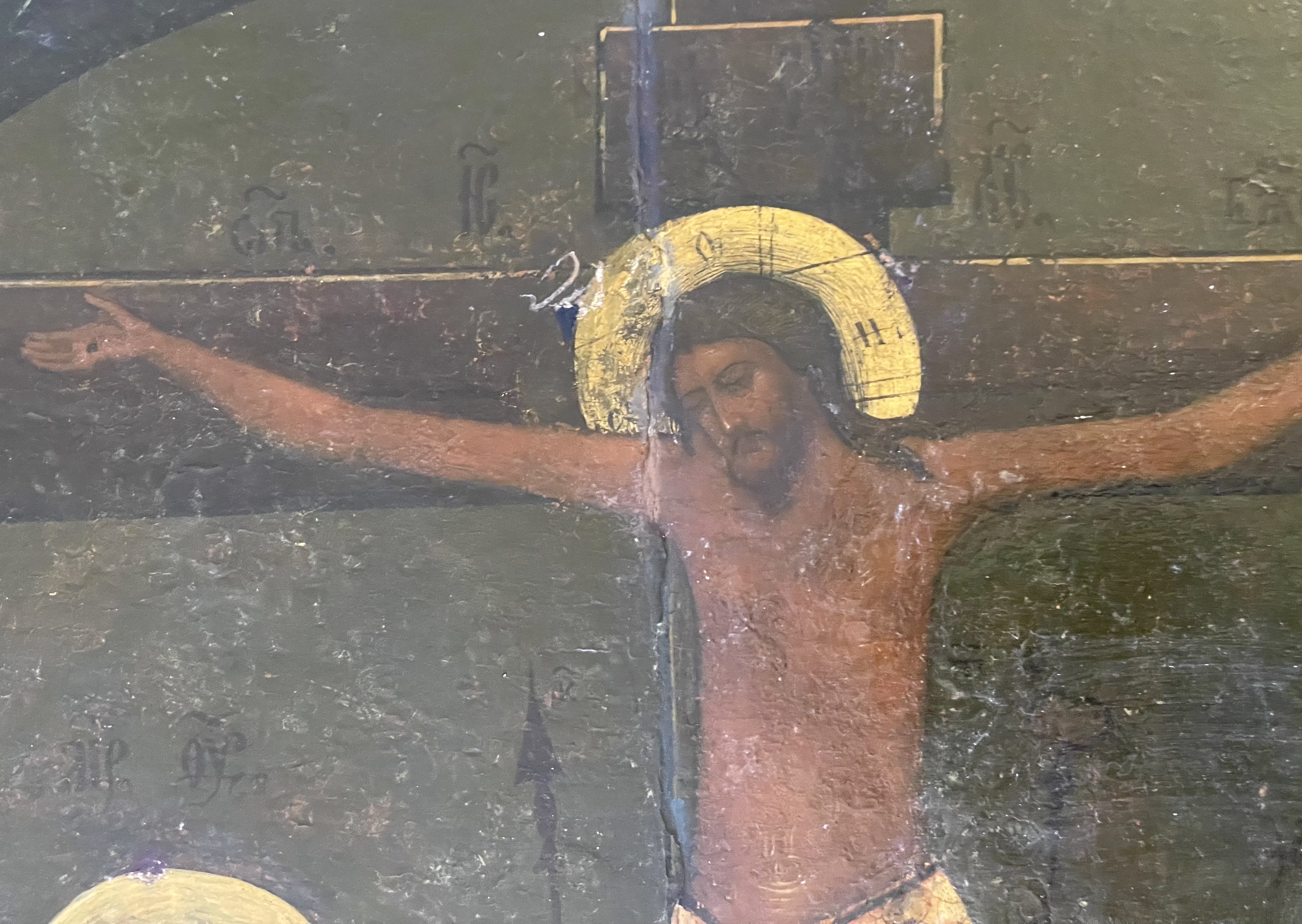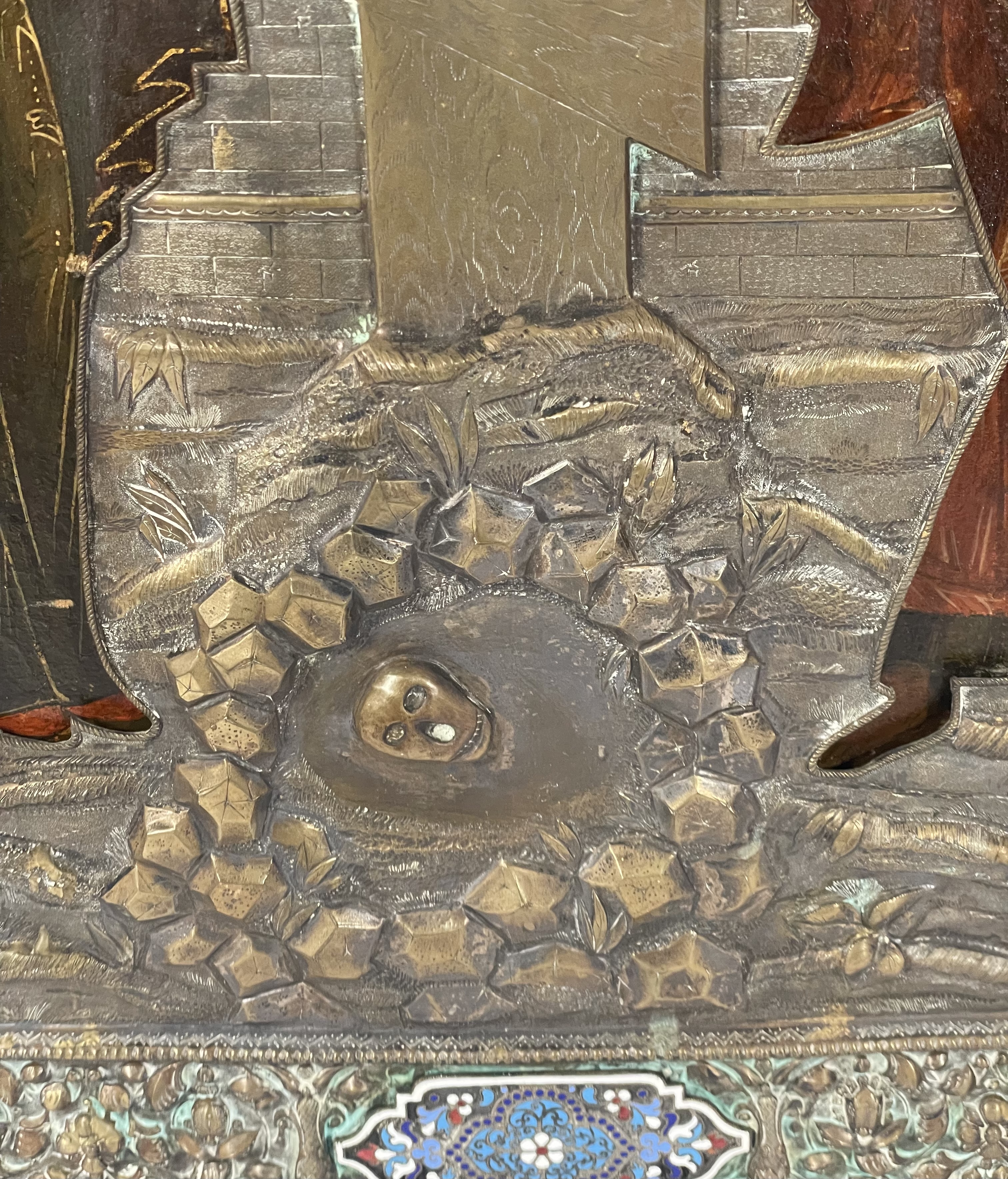 A large church icon depicting the crucified Christ flanked by the Virgin Mary, St. John the Apostle, St. Mary Magdalene, and St. Longinus the Centurion. In the corners are depicted the Sun and the Moon, behind the Cross are the walls of Jerusalem, and below is the Adam's head. The enameled plaque, just above Christ’s head, reads "The Crucifixion of Our Lord." The abbreviated inscriptions around Christ's head read: "Jesus Christ, King of Glory and Son of God." The heavy parcel-silvered brass revetment cover and the halos are decorated with intricate polychrome enamel. The icon dates to the 18th century and the embellished cover was added in the 19th century.