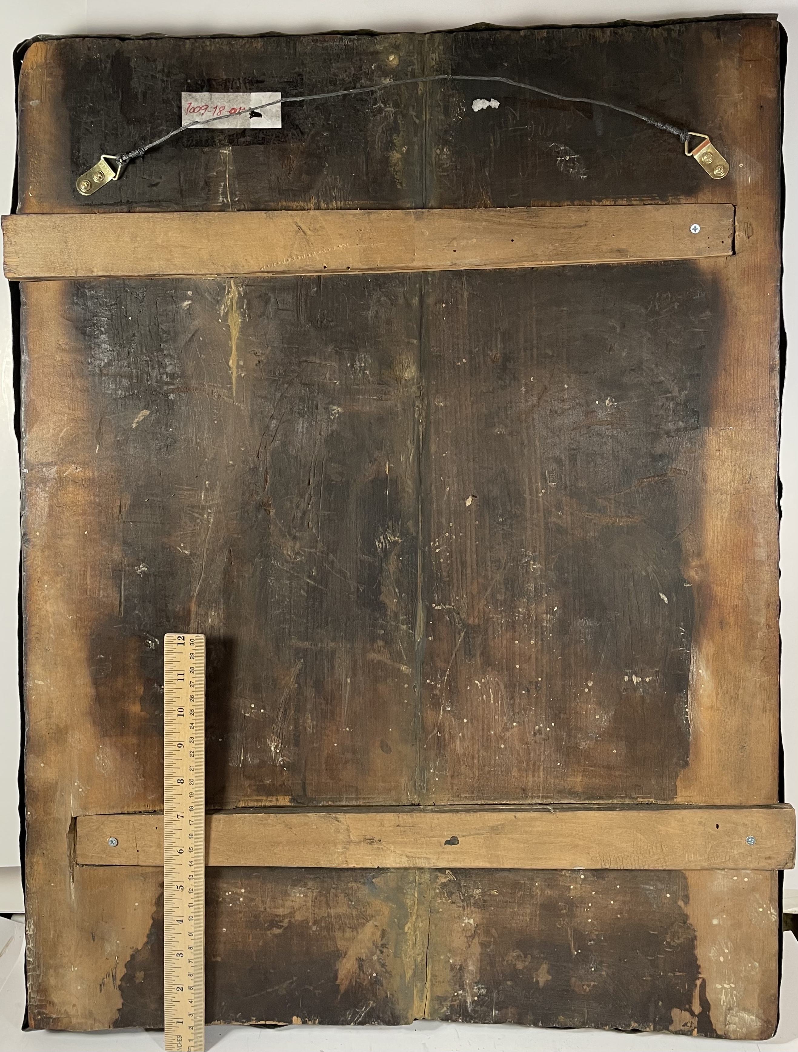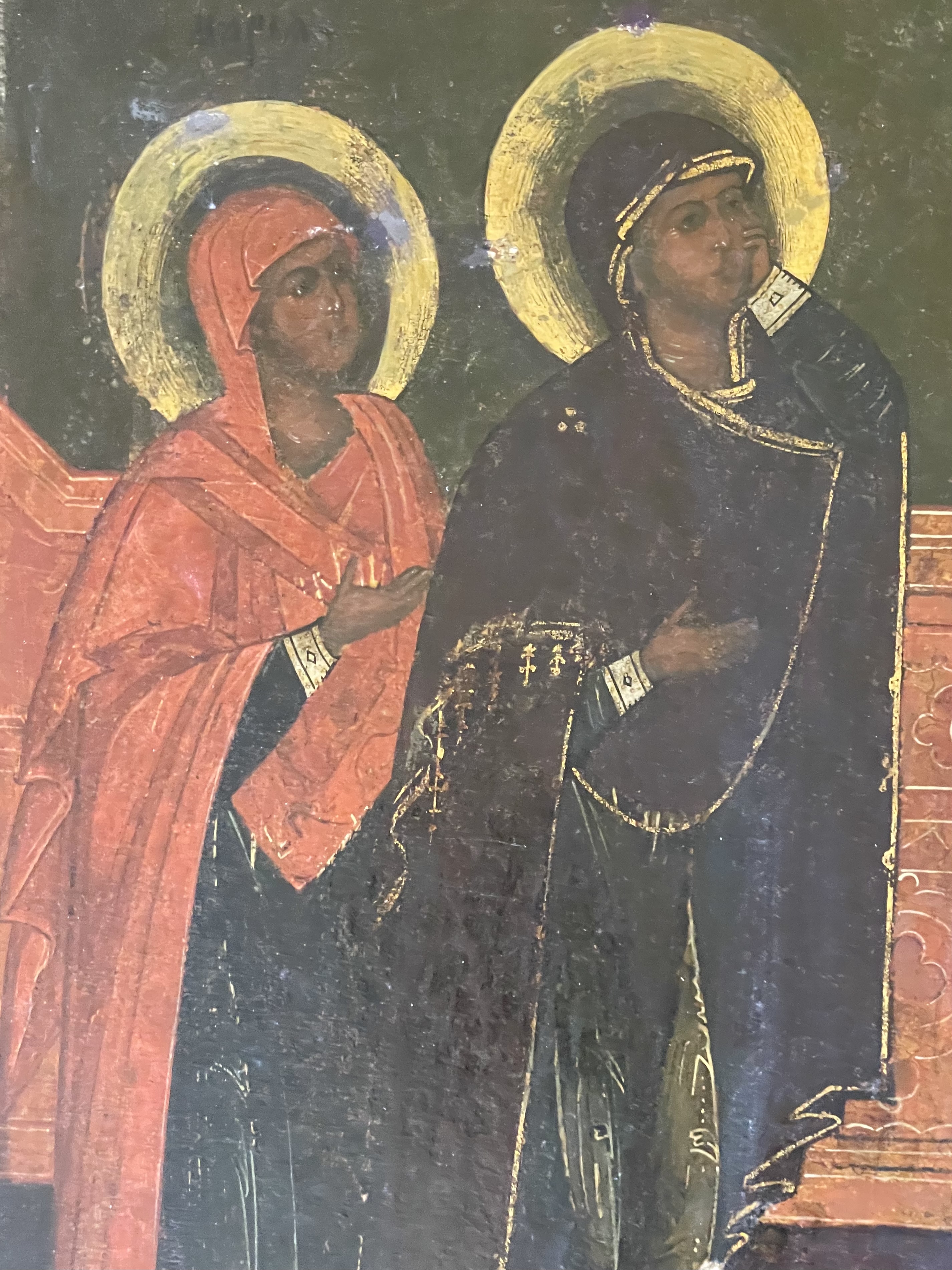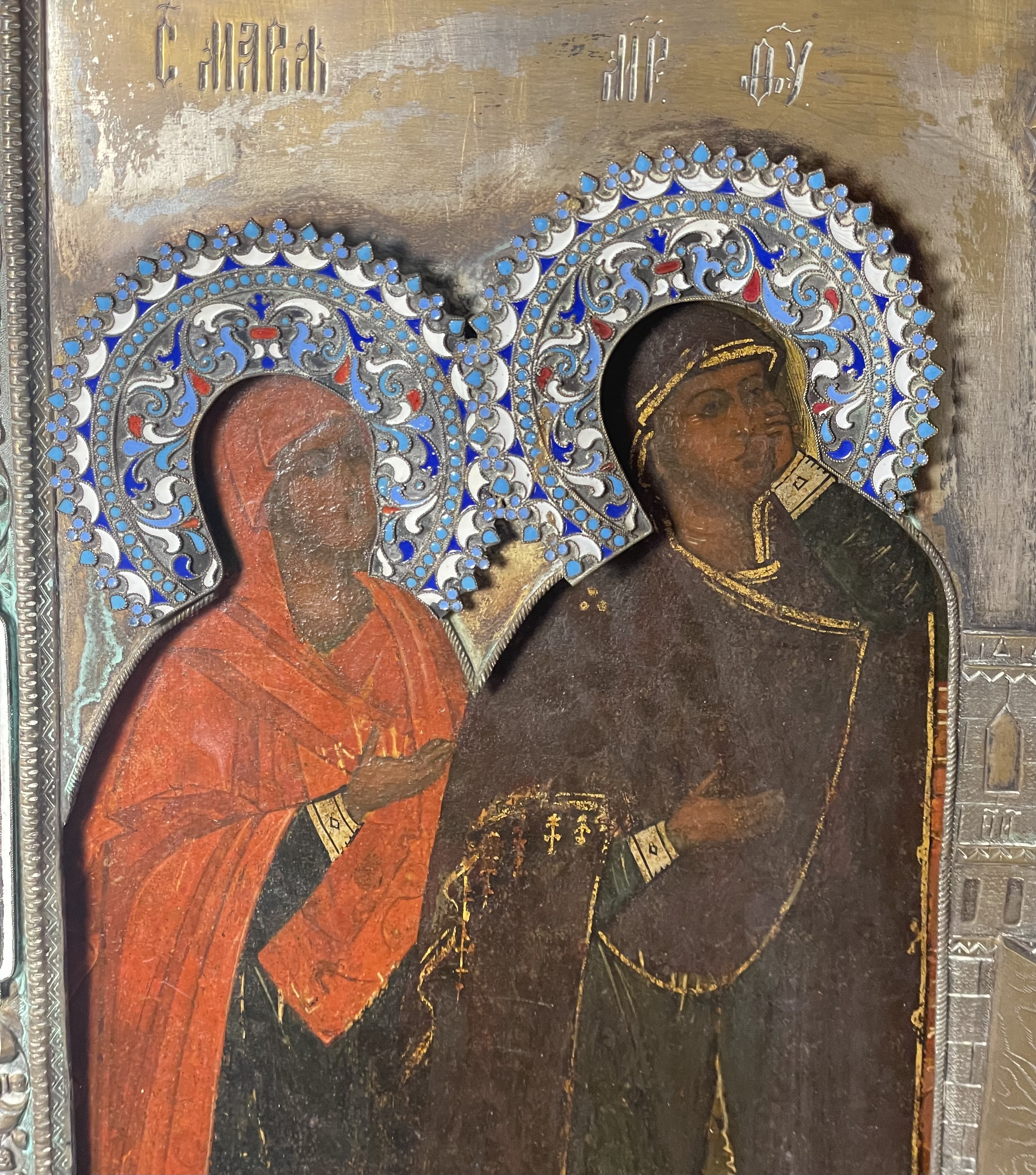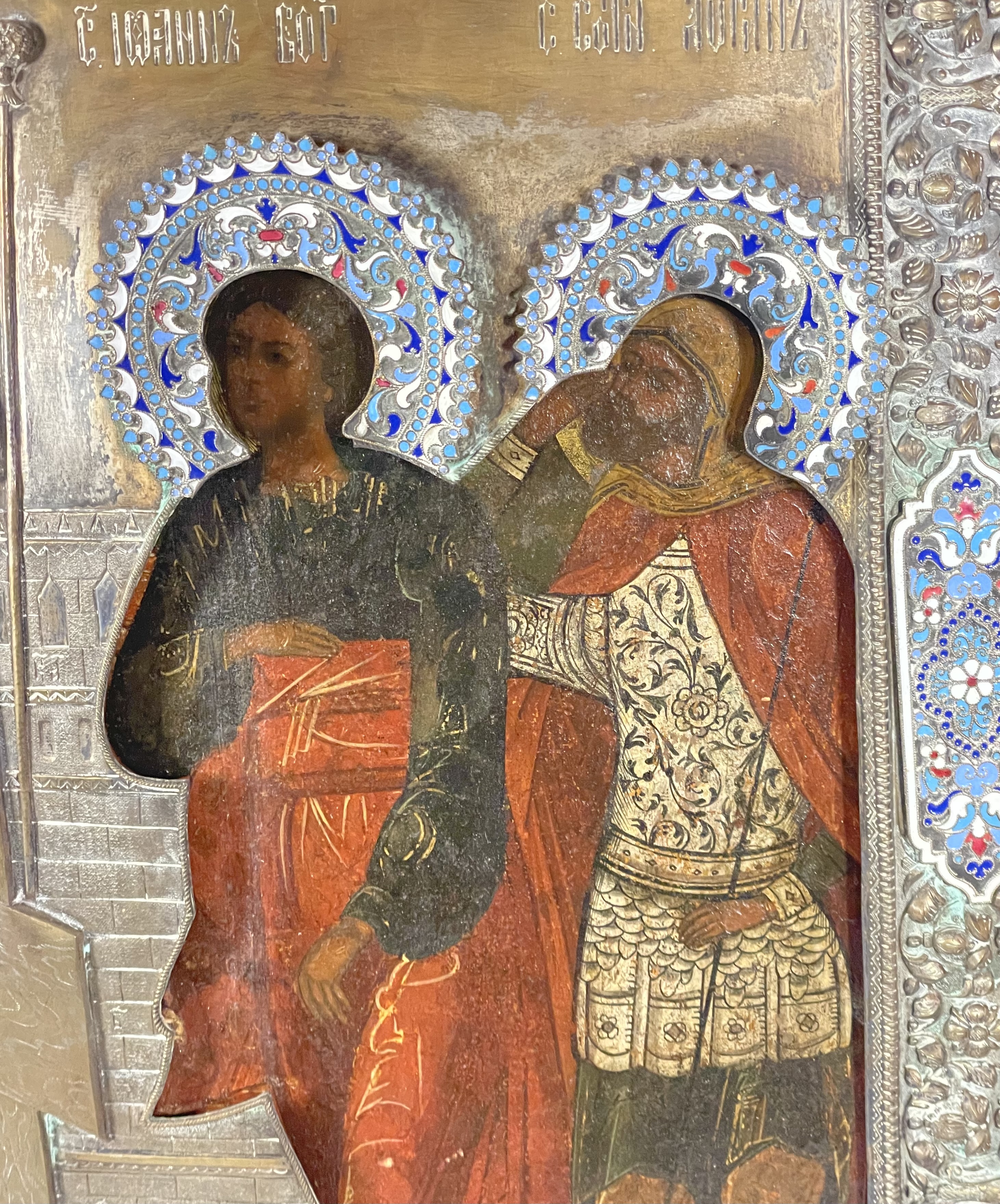 A large church icon depicting the crucified Christ flanked by the Virgin Mary, St. John the Apostle, St. Mary Magdalene, and St. Longinus the Centurion. In the corners are depicted the Sun and the Moon, behind the Cross are the walls of Jerusalem, and below is the Adam's head. The enameled plaque, just above Christ’s head, reads "The Crucifixion of Our Lord." The abbreviated inscriptions around Christ's head read: "Jesus Christ, King of Glory and Son of God." The heavy parcel-silvered brass revetment cover and the halos are decorated with intricate polychrome enamel. The icon dates to the 18th century and the embellished cover was added in the 19th century.