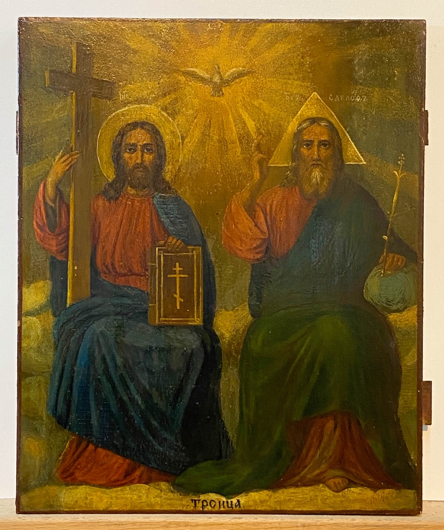 The icon depicts the New Testament Trinity of Jesus Christ, God the Father and the Holy Spirit above. Jesus is pictured on the left with a closed book of the Gospels and a monumental cross, God the Father as the venerable old white-bearded man depicted on the right blessing with one hand and holding an Orb in the other, between them is a six-winged Seraph. Above them the Holy Spirit appears as a dove in divine light. The Holy Trinity pattern was officially unacceptable, but nonetheless very common in icons of both State Church and of the Old Believers who separated from the State Church after the liturgical revisions of Patriarch Nikon in the mid-17th century.