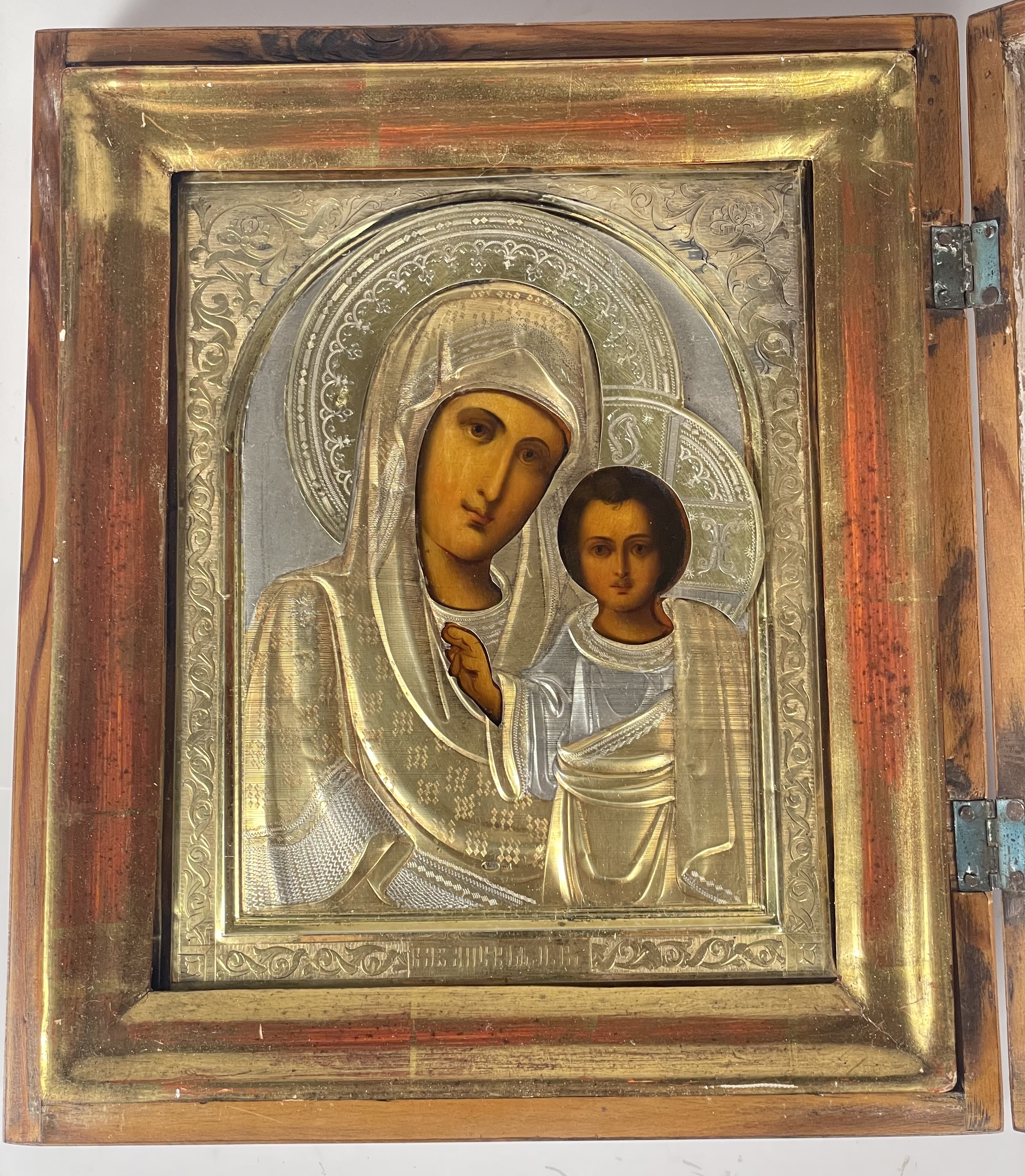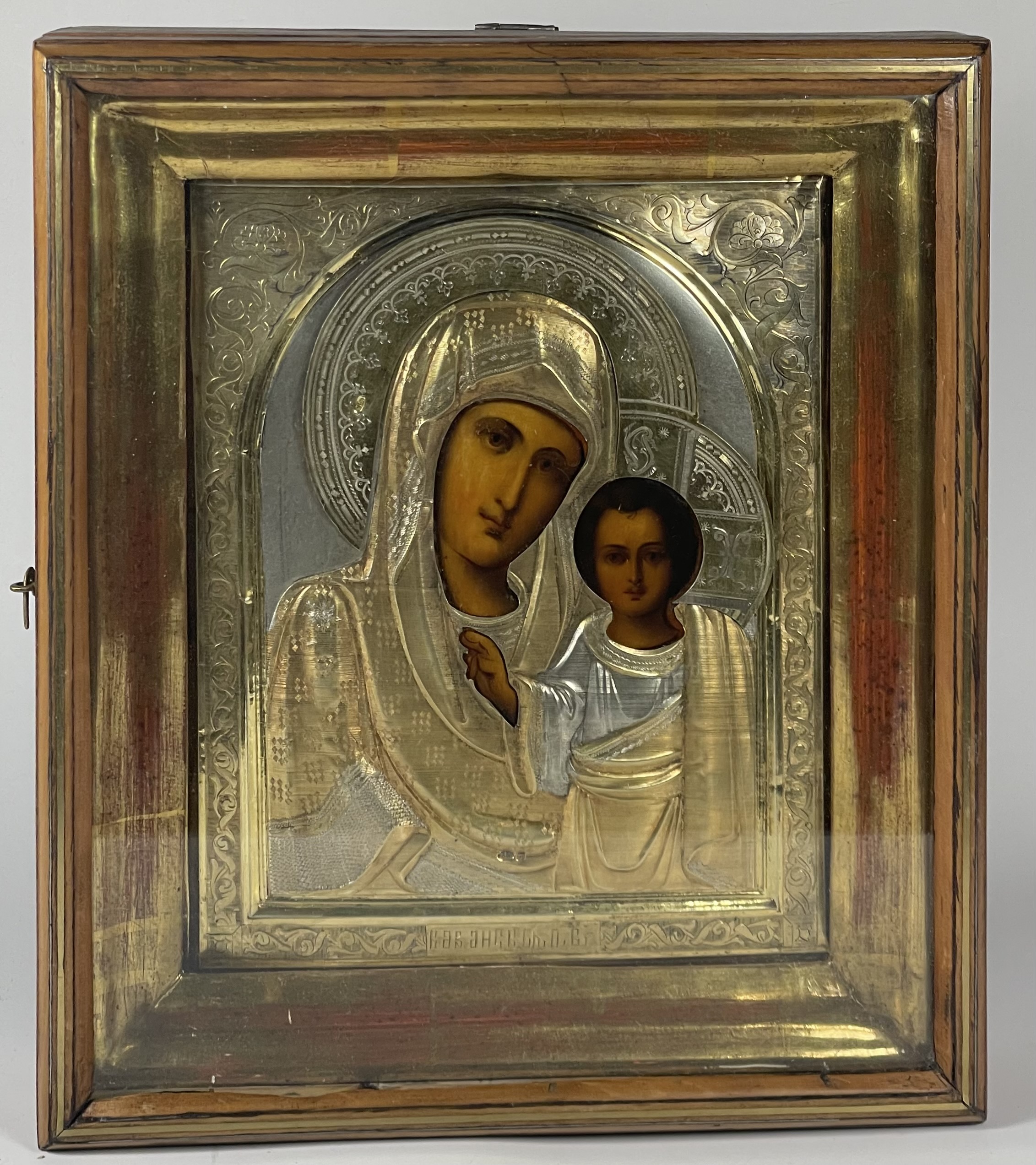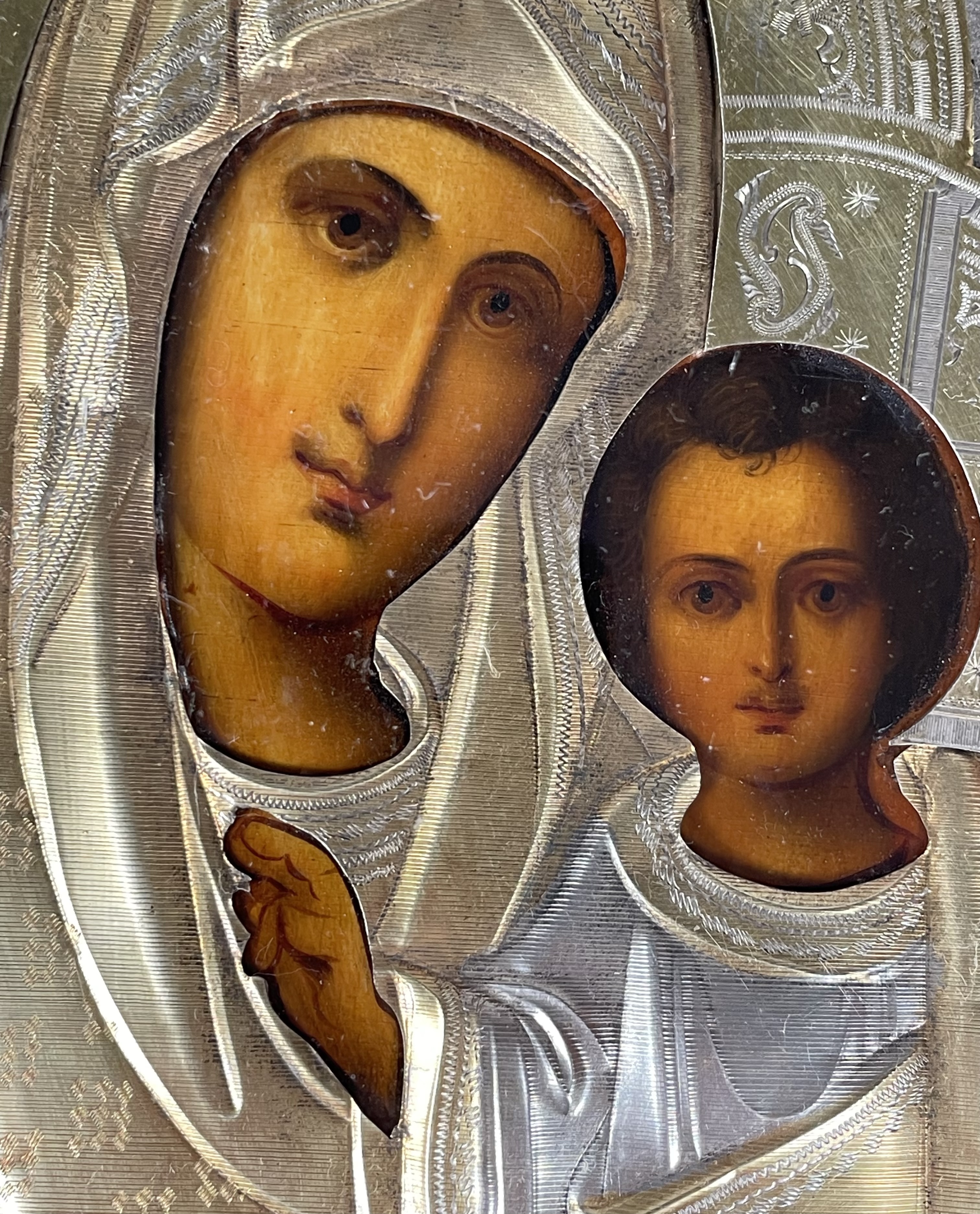Our Lady of Kazan is a holy icon of the highest stature within the Russian Orthodox Church and is considered a palladium of Russia for centuries until its theft and likely destruction in 1904. The icon represents the Virgin Mary as the protector and patroness of the city of Kazan. It is a close-up variant of the Hodegetria (Directress) style, it is noted mainly for the Child standing, with the Virgin chest length. The Kazan icons are traditionally small, following the original. The Kazan icon was very popular in Russia, especially as a wedding gift, and many copies were made in the design of the original. Two major Kazan Cathedrals, in Moscow and St. Petersburg, are consecrated to Our Lady of Kazan, as are numerous churches throughout the land. Her feast days are July 21 and November 4.