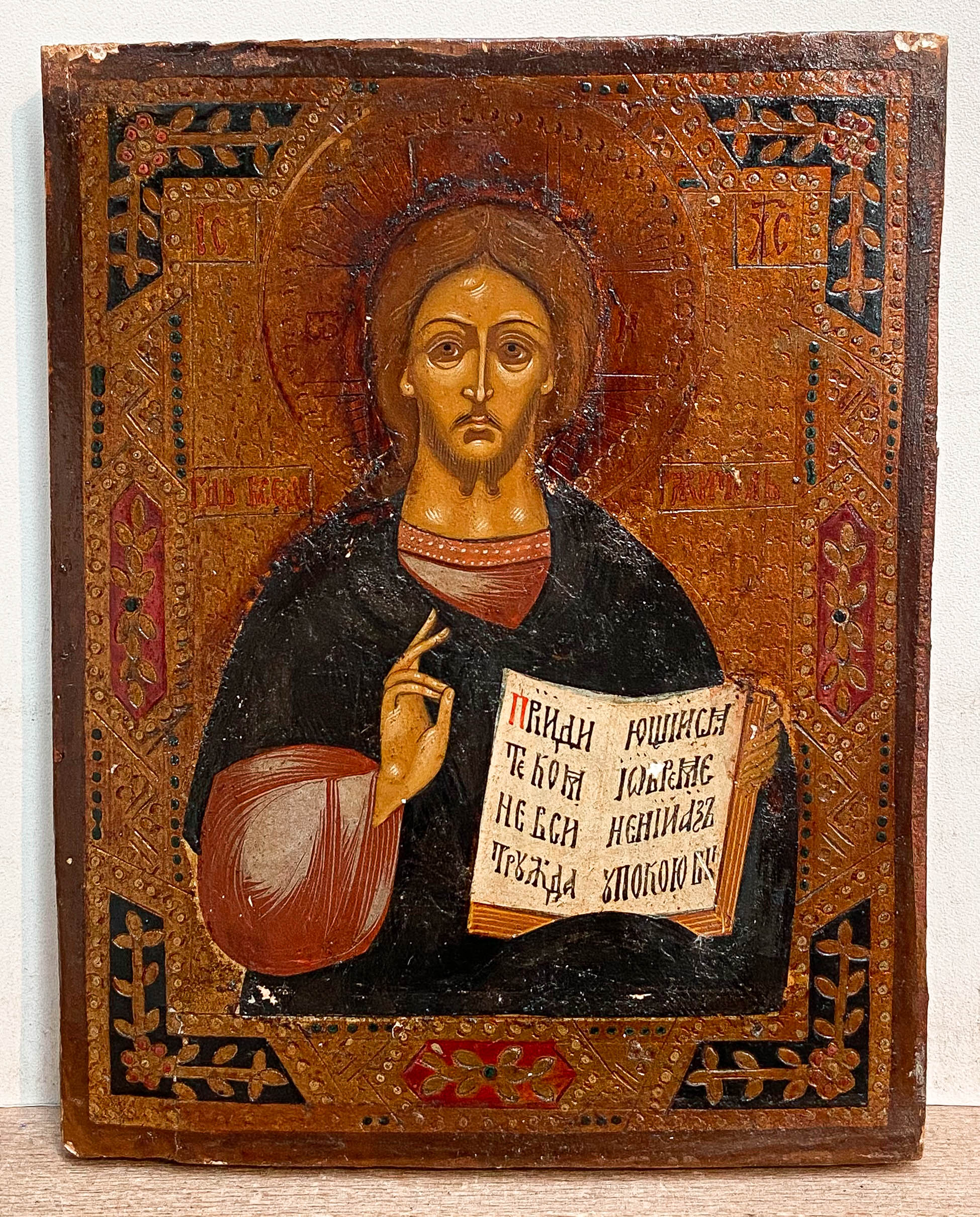 Christ Pantocrator is one of the most common subjects in Russian iconography, and its iconography follows a traditional pattern. In these icons, Christ is depicted as a powerful and majestic figure, with his right hand raised in blessing and his left hand holding an open book of the Gospels. The term "Pantocrator" means "Almighty" or "Ruler of All," and the image of Christ in this role conveys his power and authority as the divine judge and ruler of the world. The icon portrays Christ with a stern expression, indicating his righteous judgment and the seriousness of his message. The icon's composition features Christ's head and shoulders in the center of the image, with his body slightly turned to the right. He is shown wearing a red tunic and blue mantle, with his long hair and beard flowing around his face. The Gospels are opened on Matthew 11:28 “Come unto me, all ye that labor and are heavy laden, and I will give you rest.”