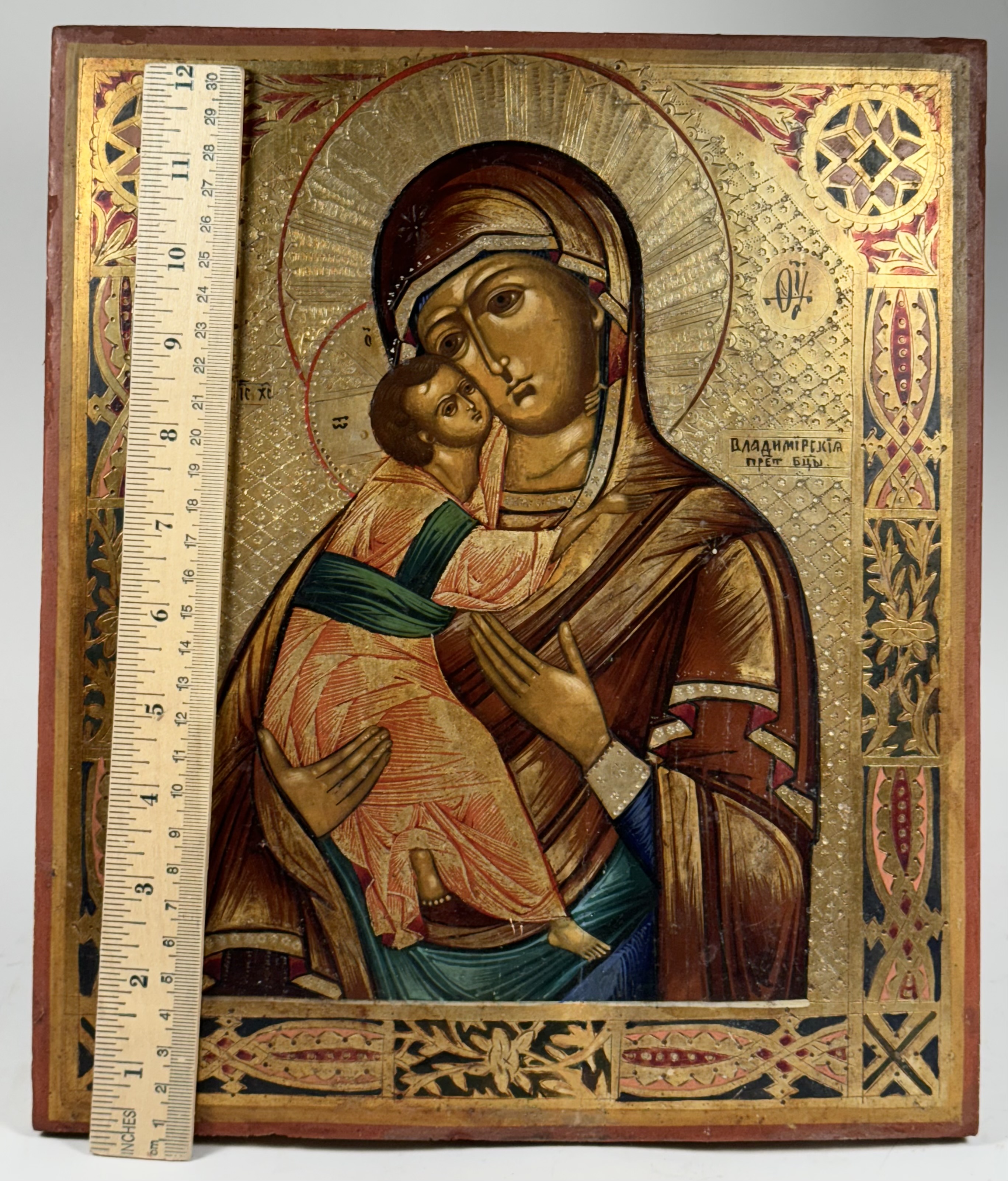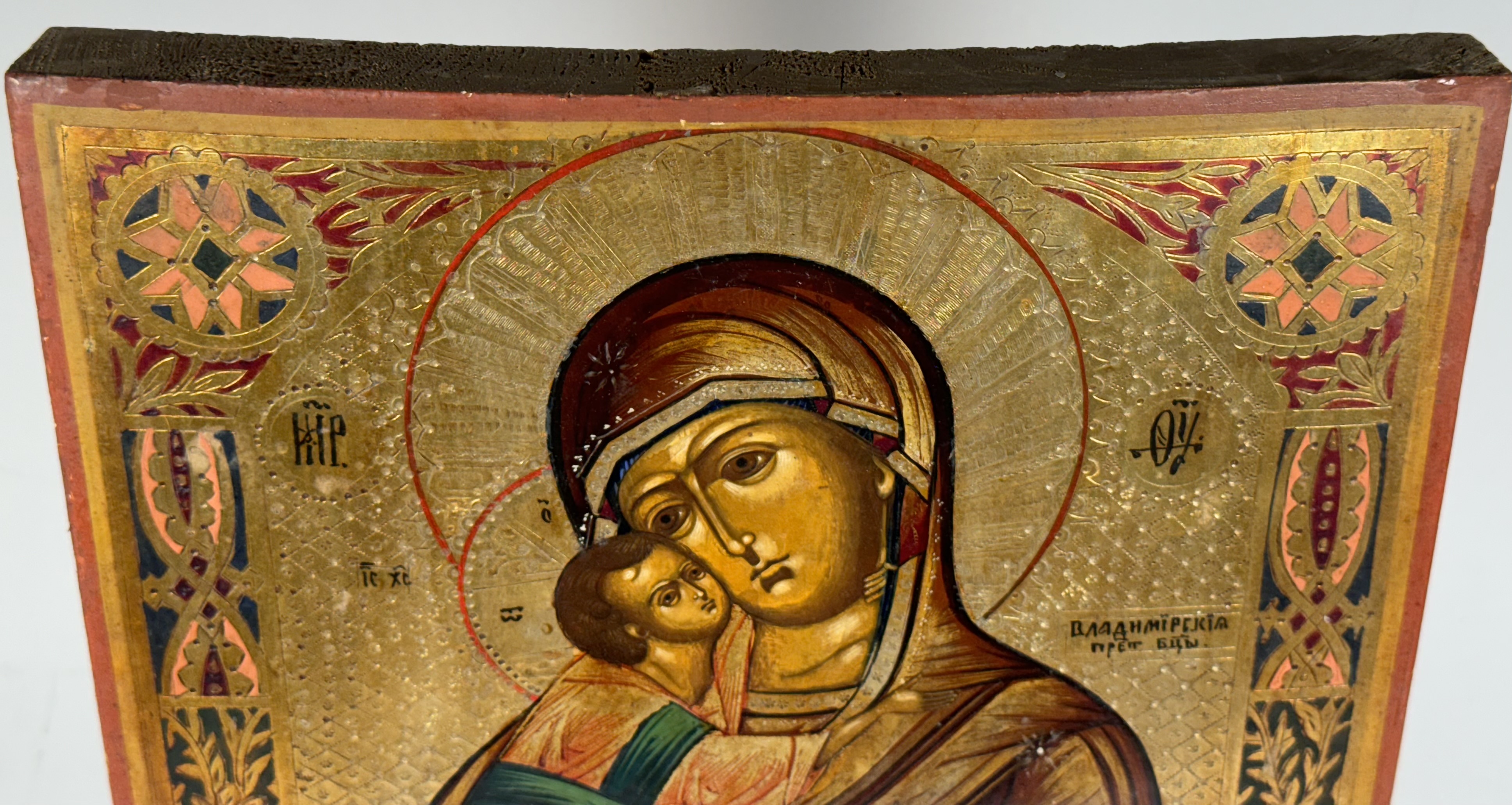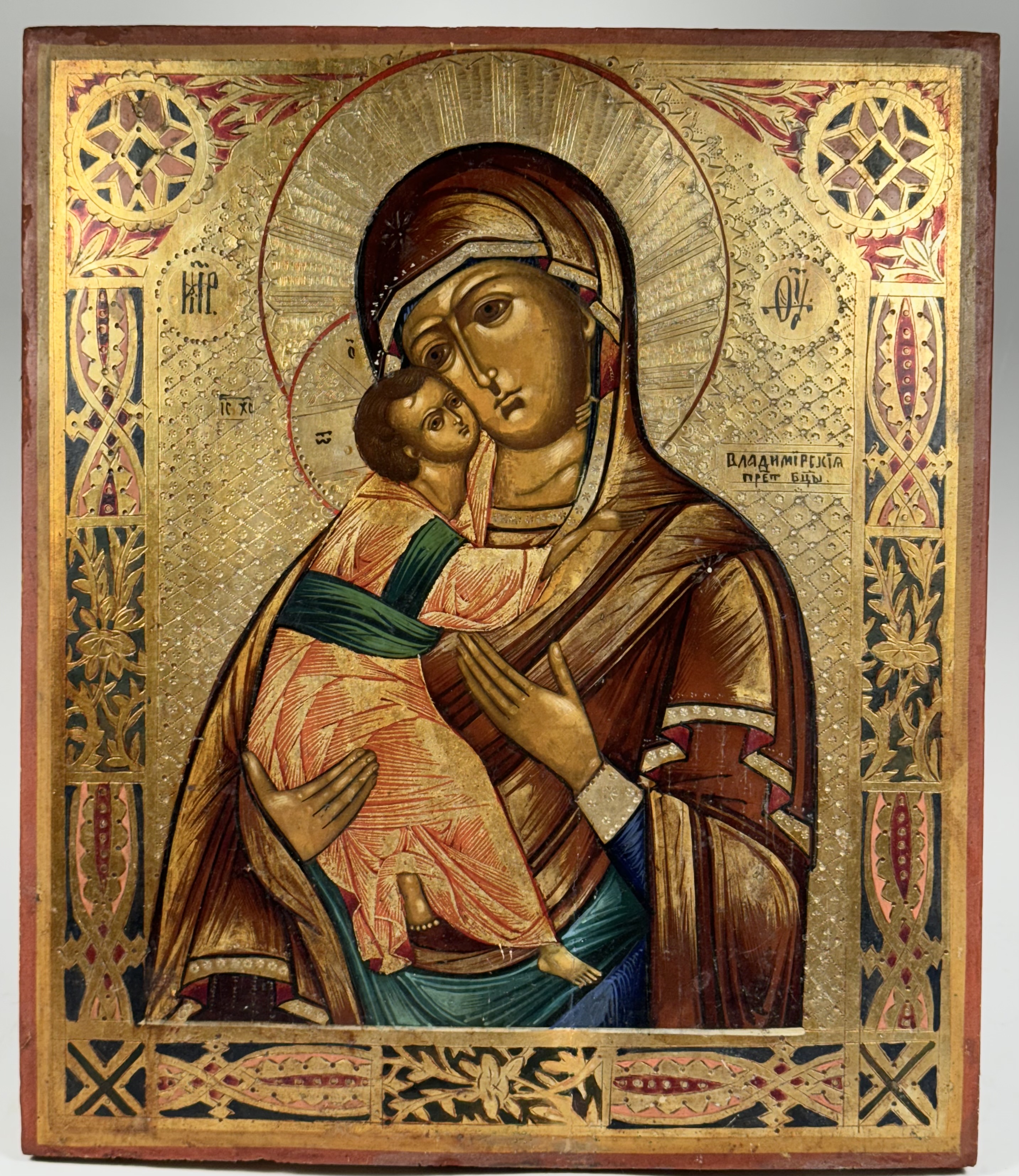 Our Lady of Vladimir is one of the most highly venerated Orthodox icons and a typical example of Byzantine iconography. The original 12th-century icon survived and is displayed in the Tretyakov Gallery museum in Moscow. Even more than most famous icons, the original has been copied repeatedly for centuries and many copies now have considerable artistic and religious significance of their own. The icon is a version of the Eleusa (Tenderness) type, with the Christ child snuggling up to his mother's cheek. The venerated image was used to celebrate the coronations of tsars, the elections of patriarchs, and other important ceremonies of the Russian state. Her feast day is June 3.