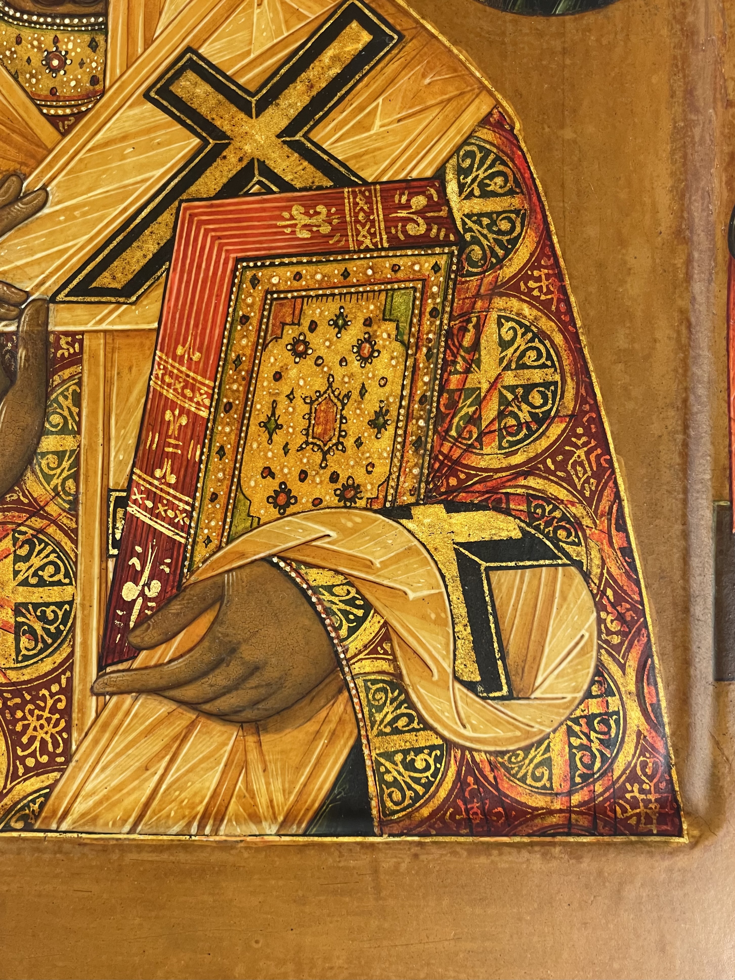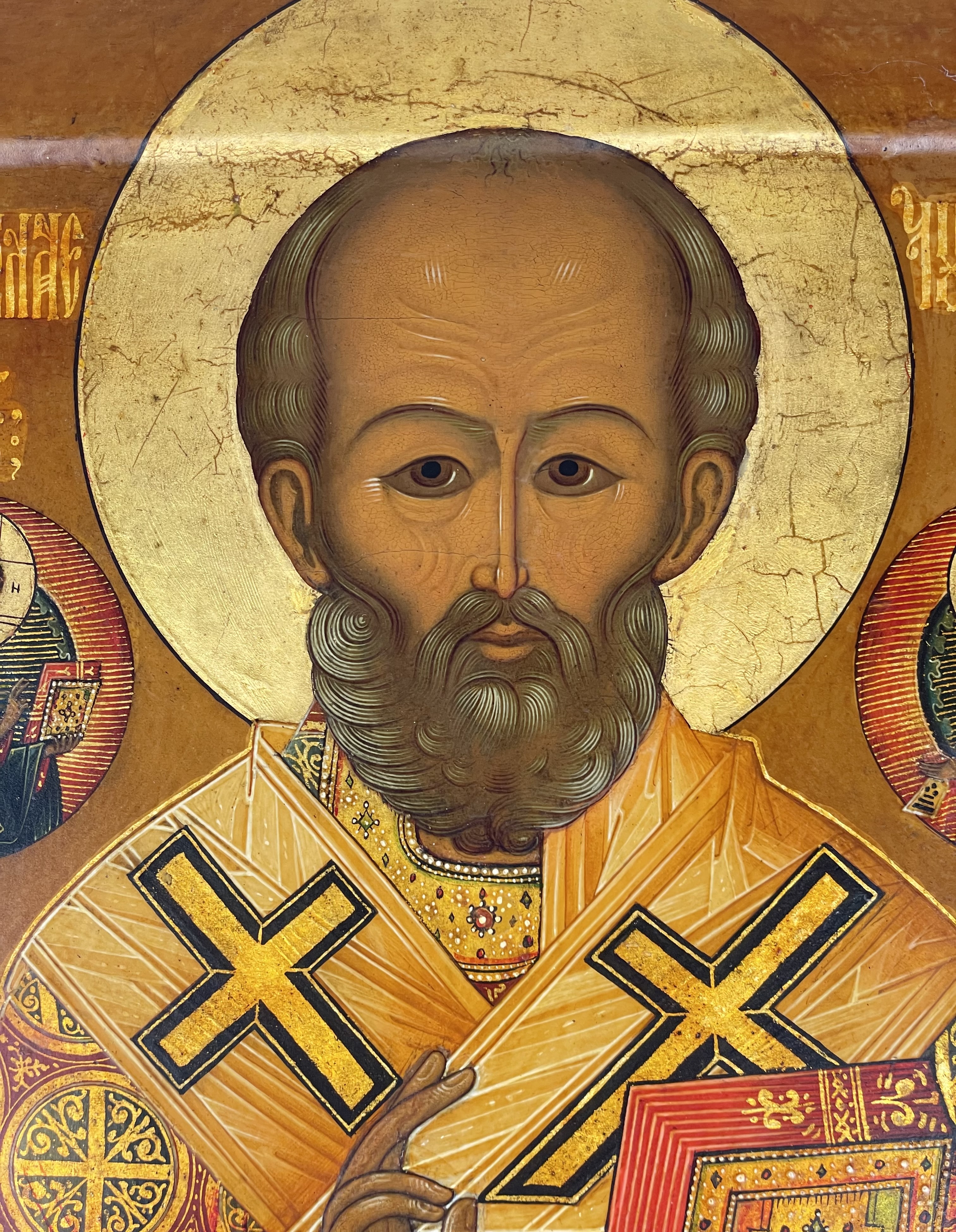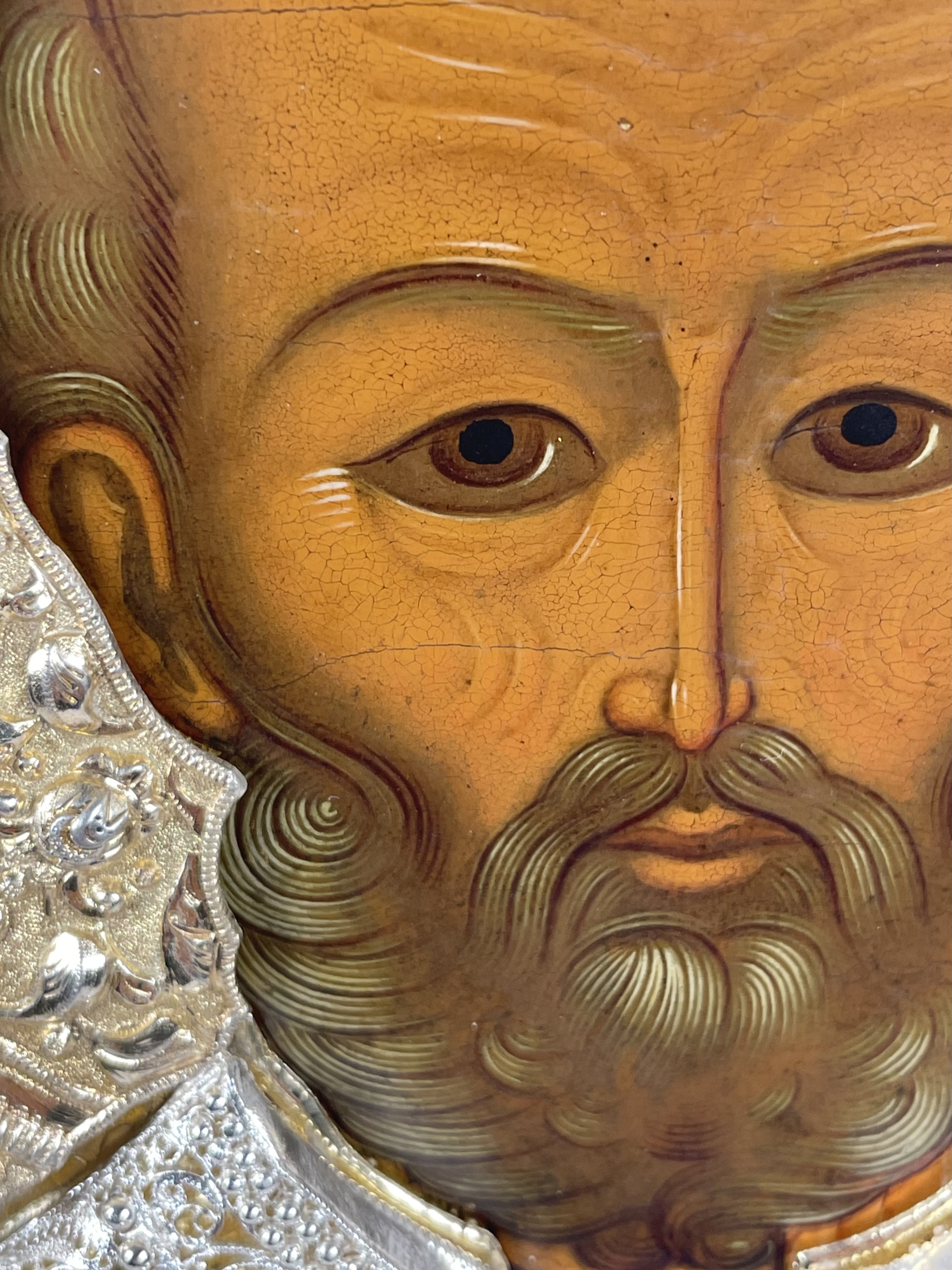 Spectacular Russian Icon - St. Nicholas the Wonderworker of Myra in silver revetment cover with 2 border saints