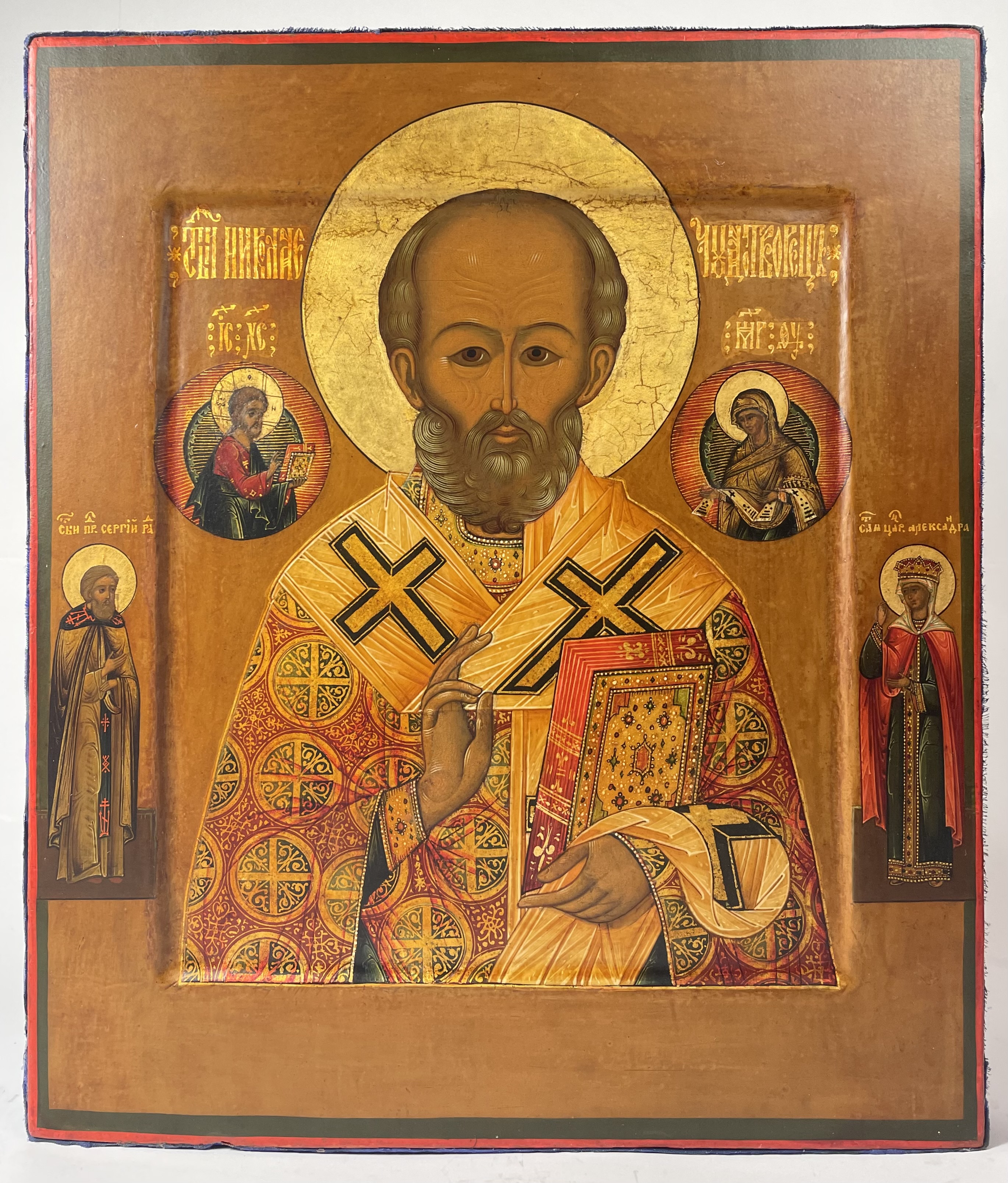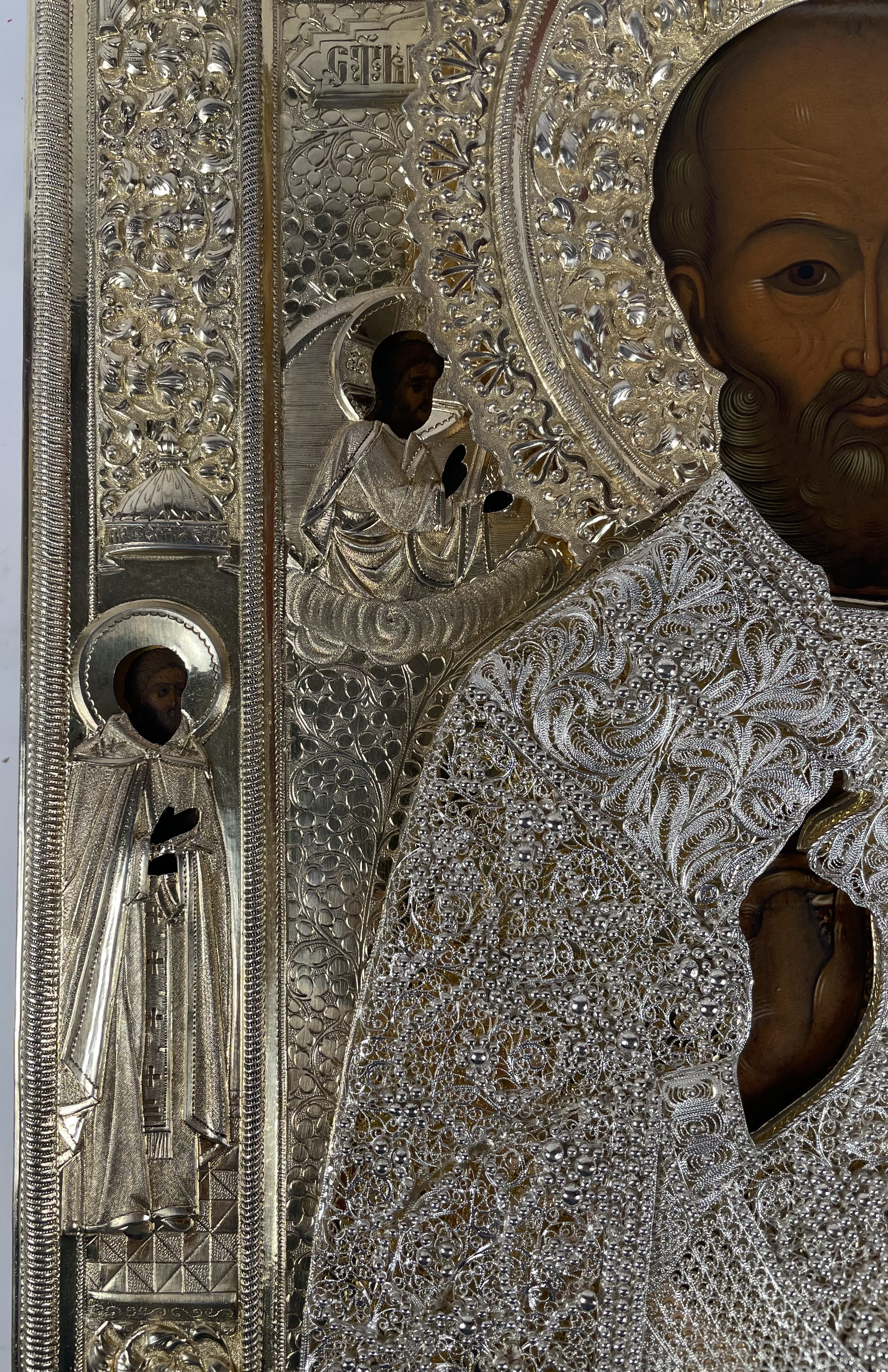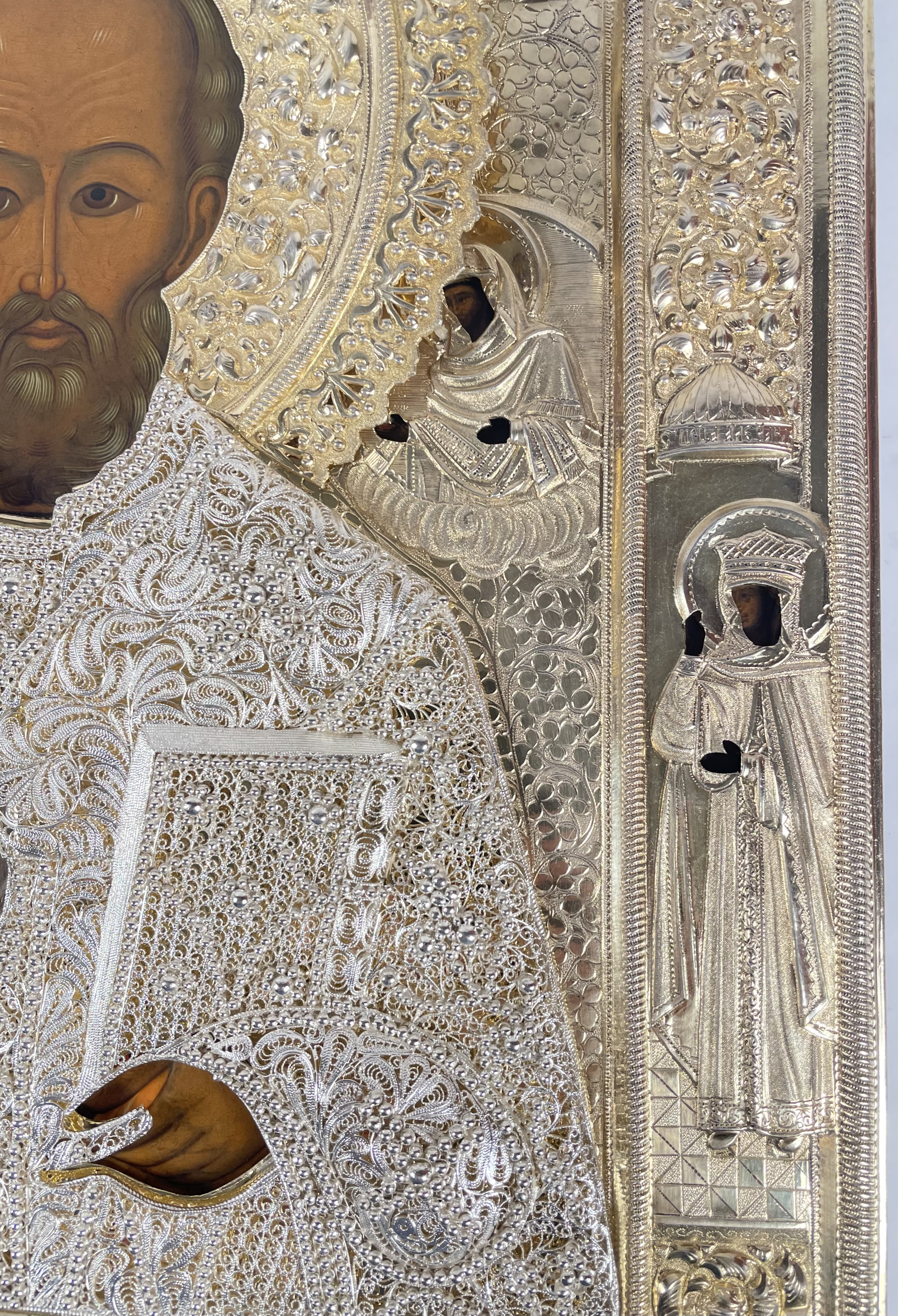 An impressive icon depicting finely painted image of St. Nicholas the Wonderworker and Bishop of Myra flanked by the Virgin Mary and Christ. Borders with two additional saints - St. Sergius of Radonezh on the left and and St. Empress Alexandra on the right. Mounted with an opulent gilt silver revetment cover profusely decorated with chased scrolled foliate and an intricate filligree skirt. The cover is hallmarked with Moscow town mark dated 1895.