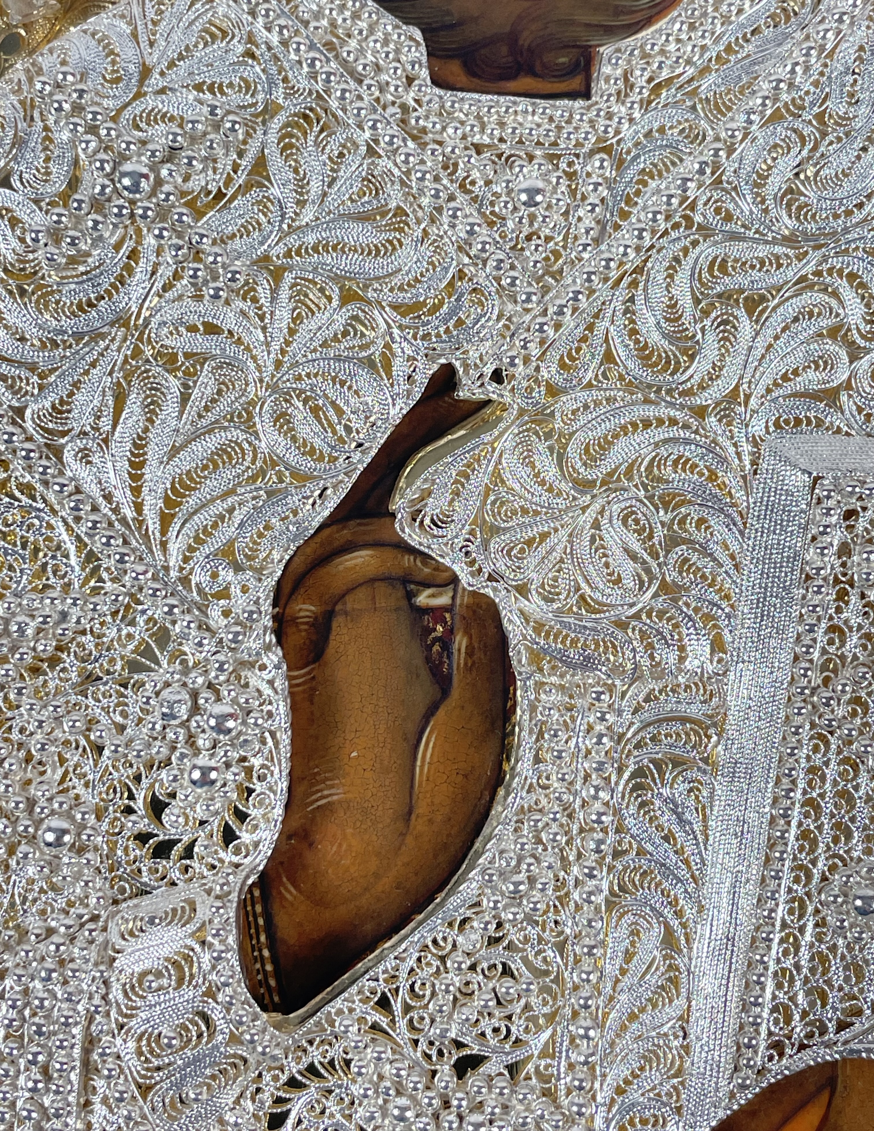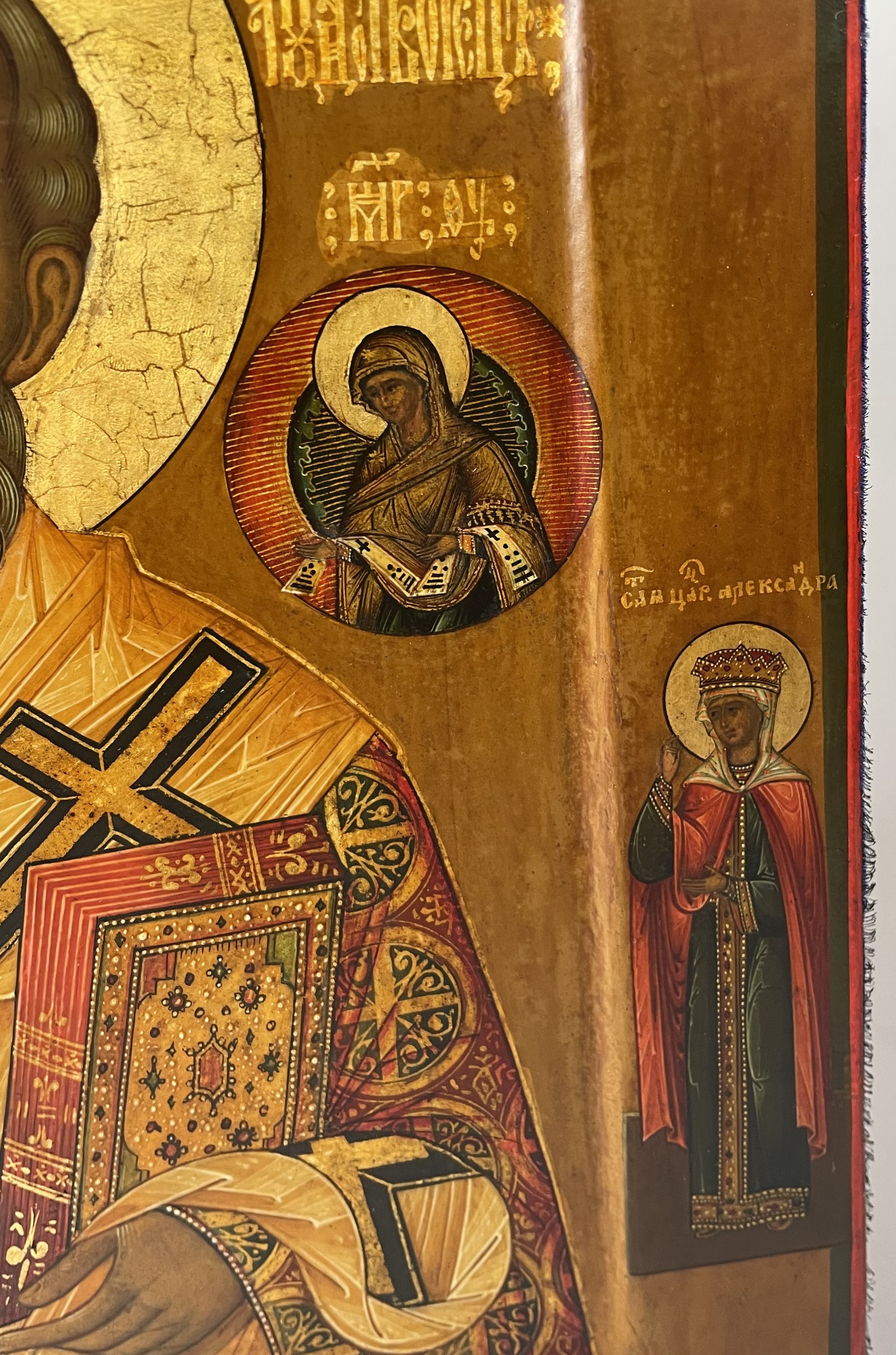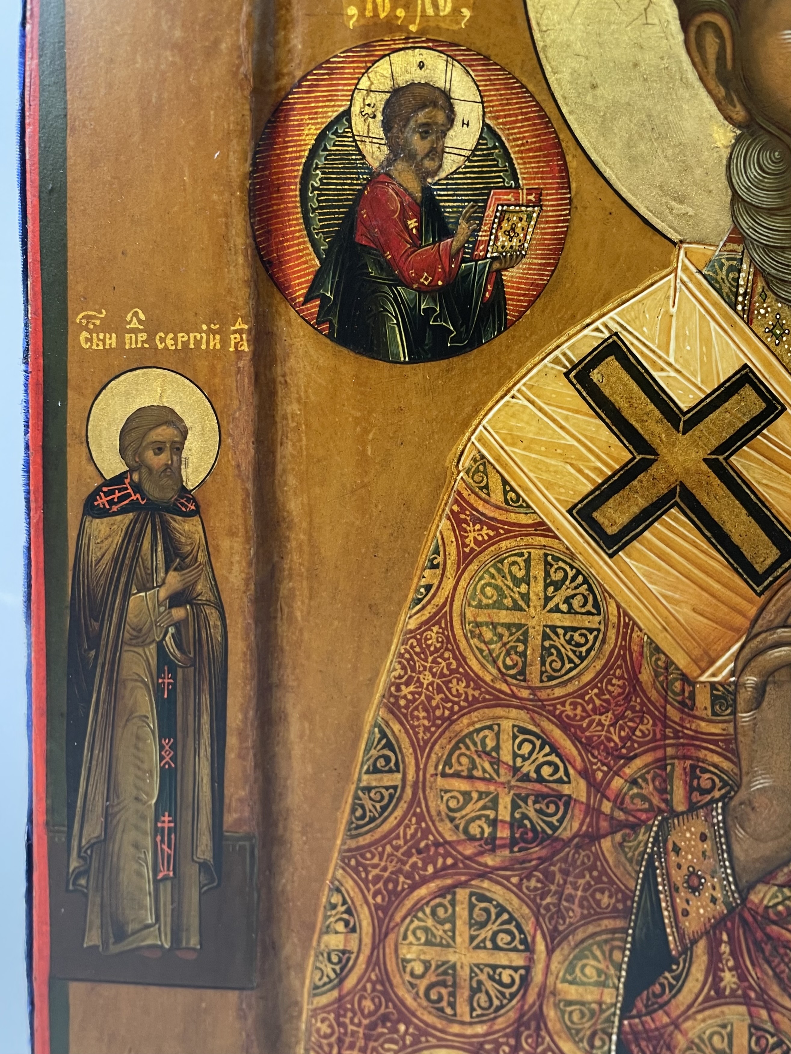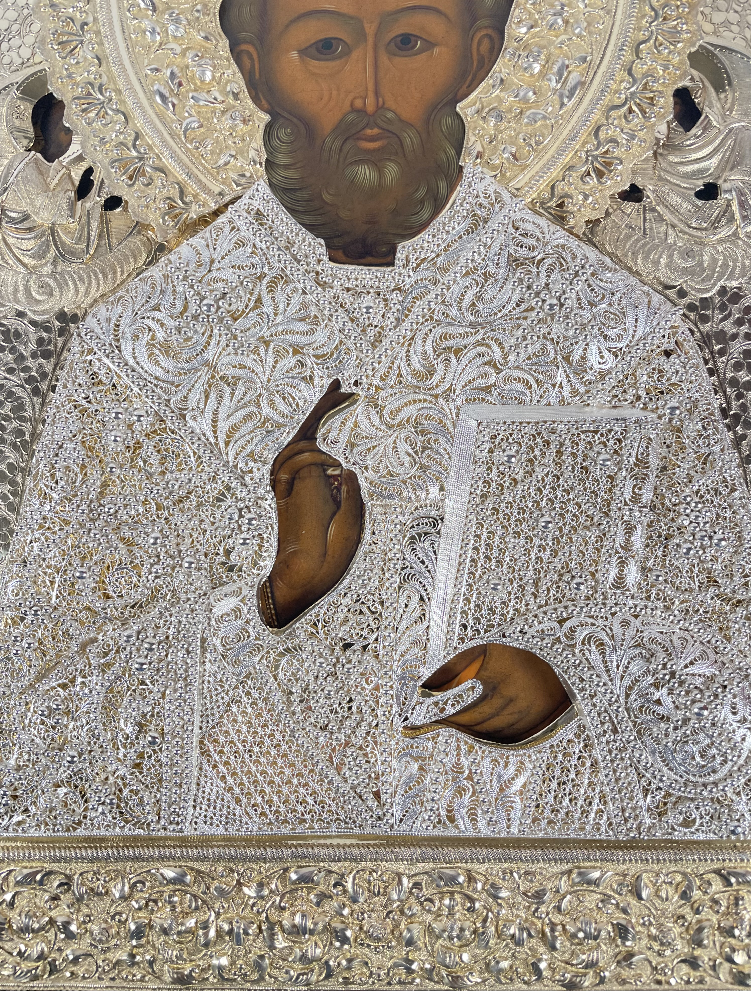 An impressive icon depicting finely painted image of St. Nicholas the Wonderworker and Bishop of Myra flanked by the Virgin Mary and Christ. Borders with two additional saints - St. Sergius of Radonezh on the left and and St. Empress Alexandra on the right. Mounted with an opulent gilt silver revetment cover profusely decorated with chased scrolled foliate and an intricate filligree skirt. The cover is hallmarked with Moscow town mark dated 1895.