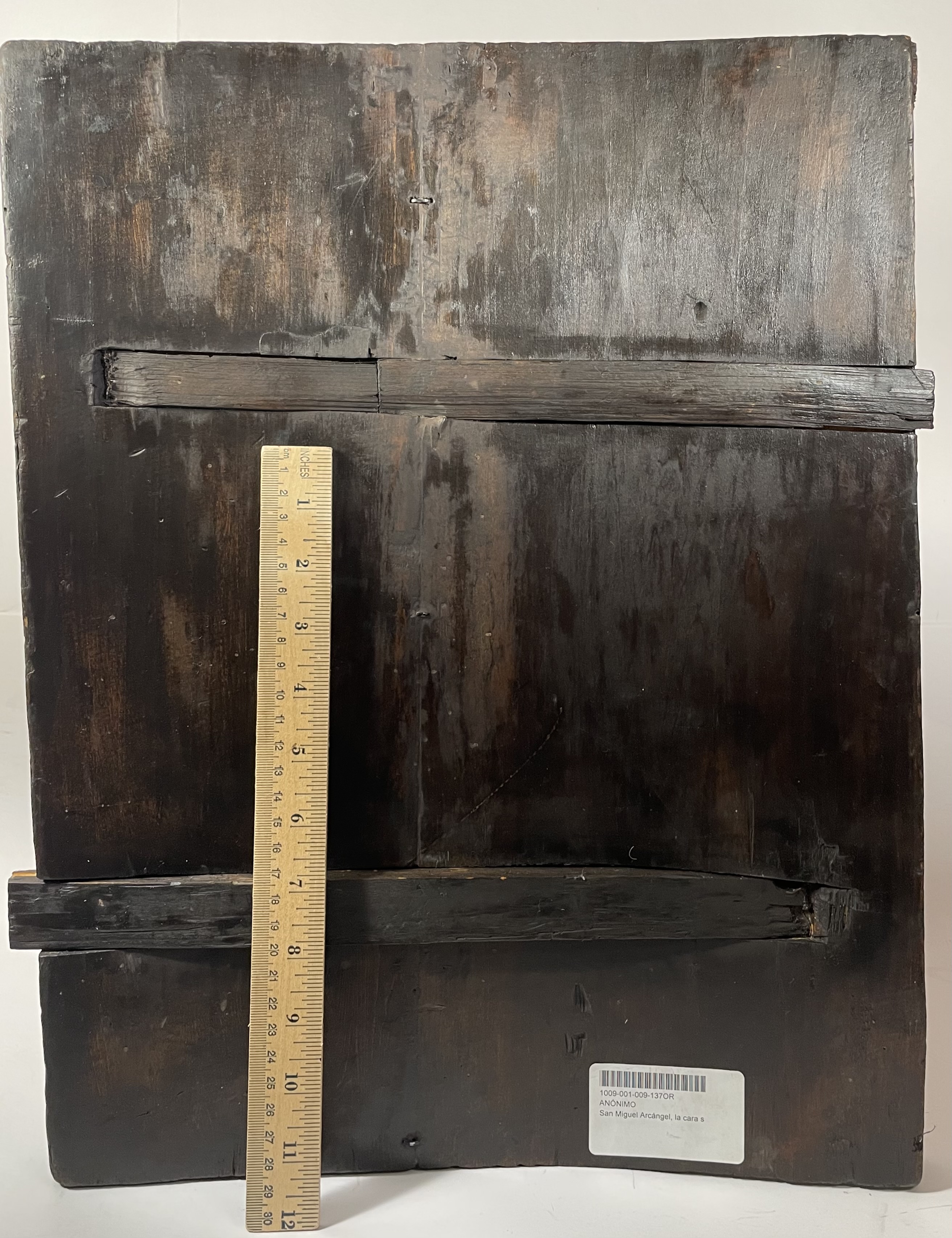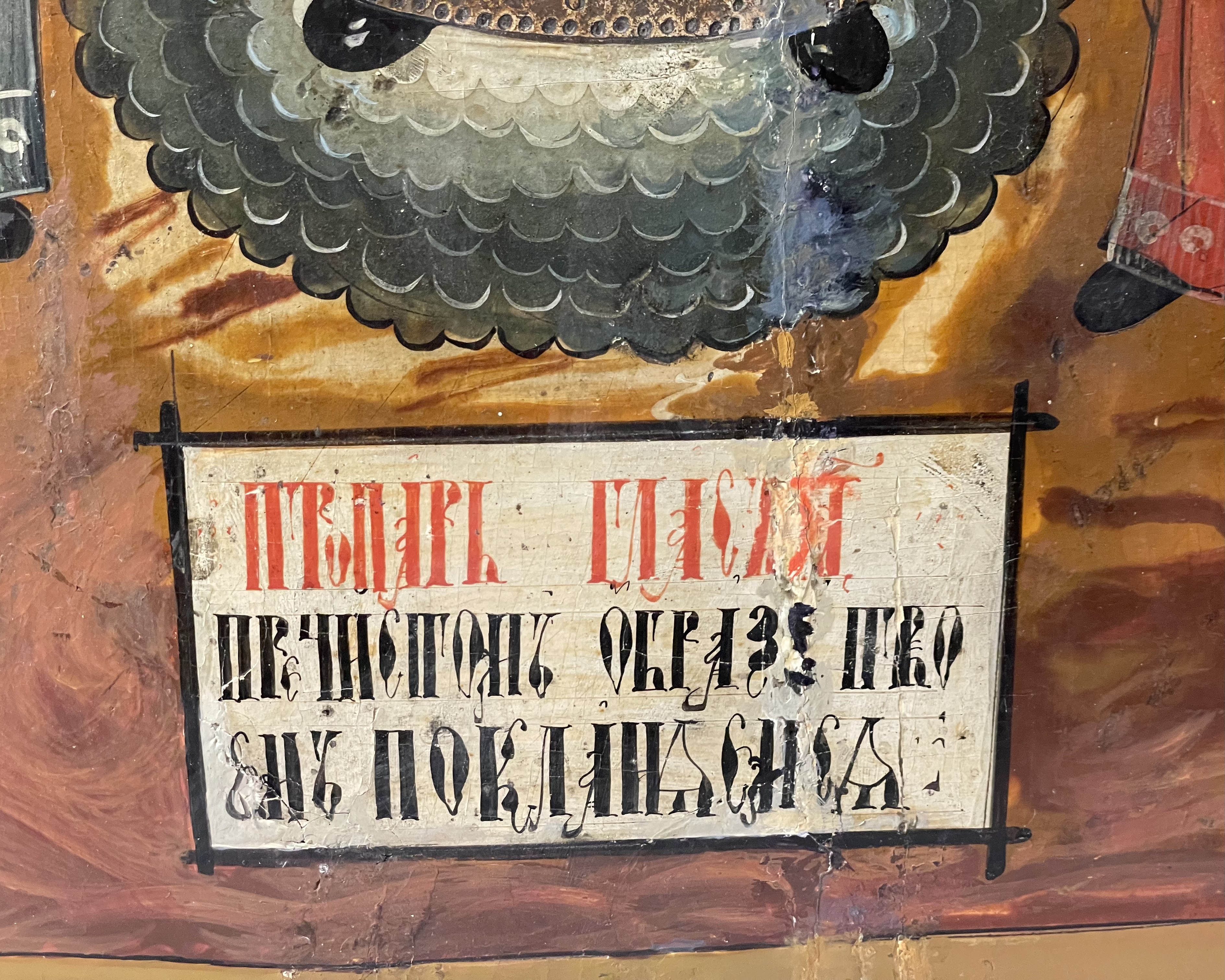 The icon depicts the Miracle of Saint Michael the Archangel who taught the twin brothers, Saints Florus and Laurus how to control horses and understand their language. The center figure at the upper part of the icon depicts the Archangel Michael holding the Holy Mandylion (Image of Christ Not Made by Human Hands) flanked by Saints Florus and Laurus.