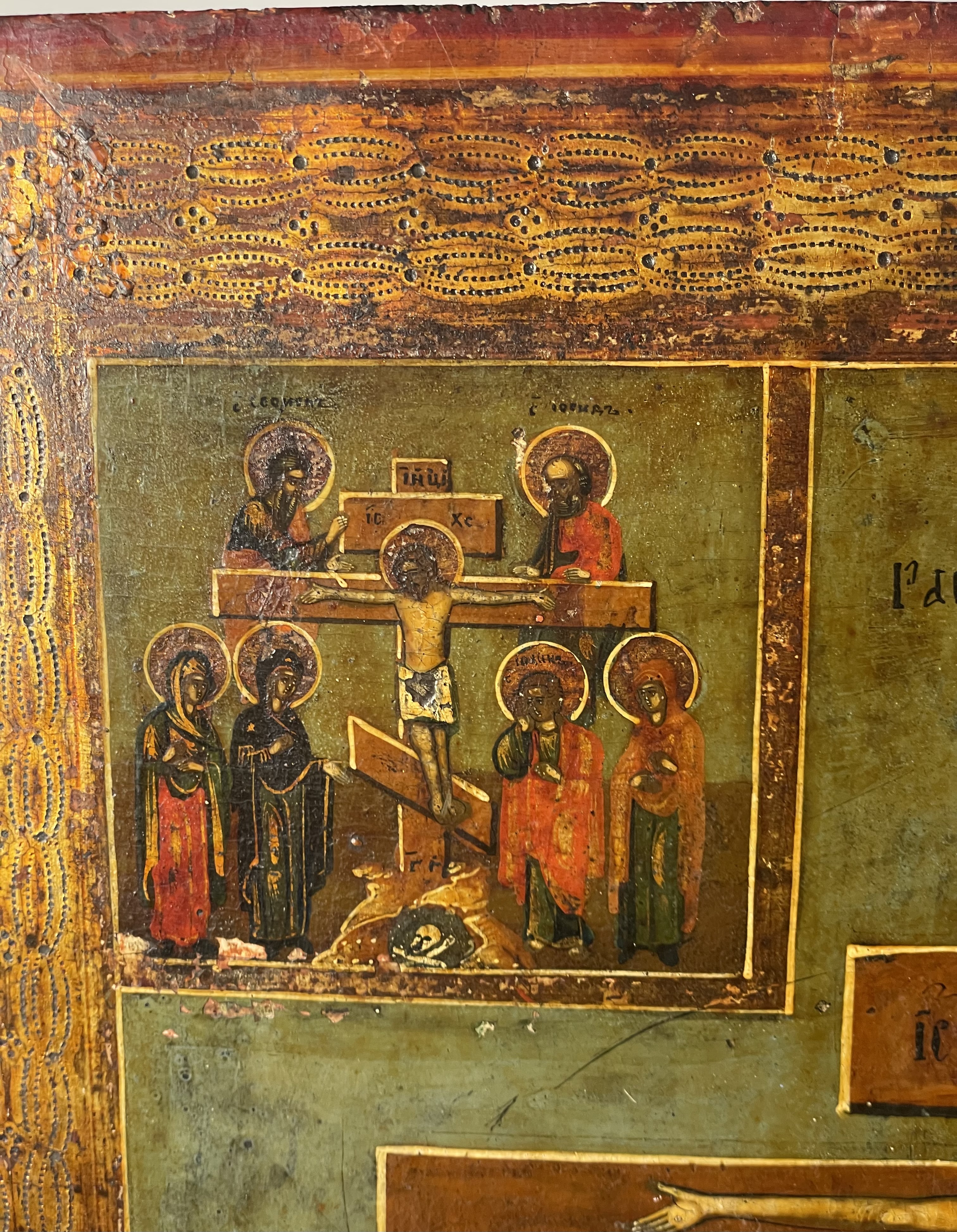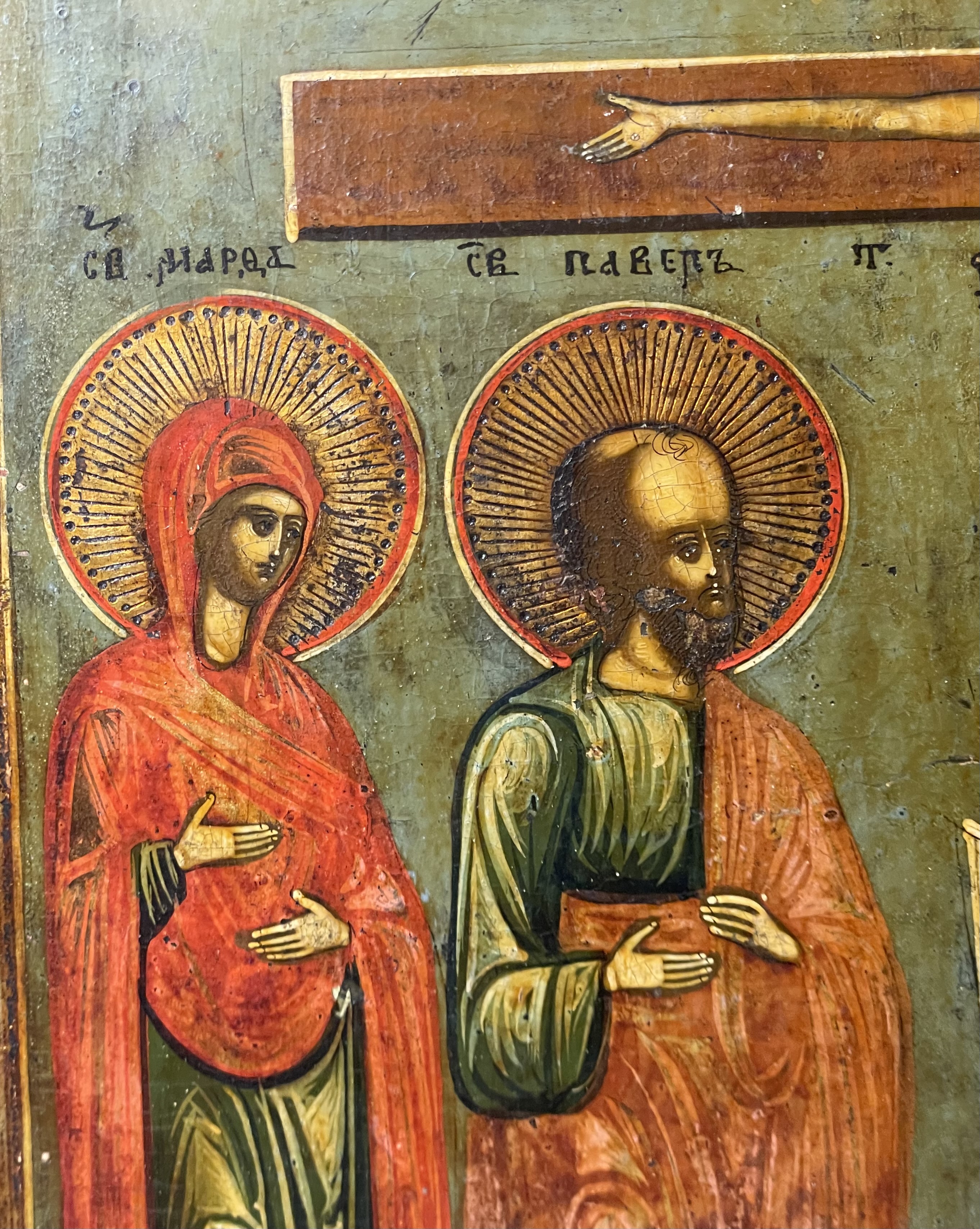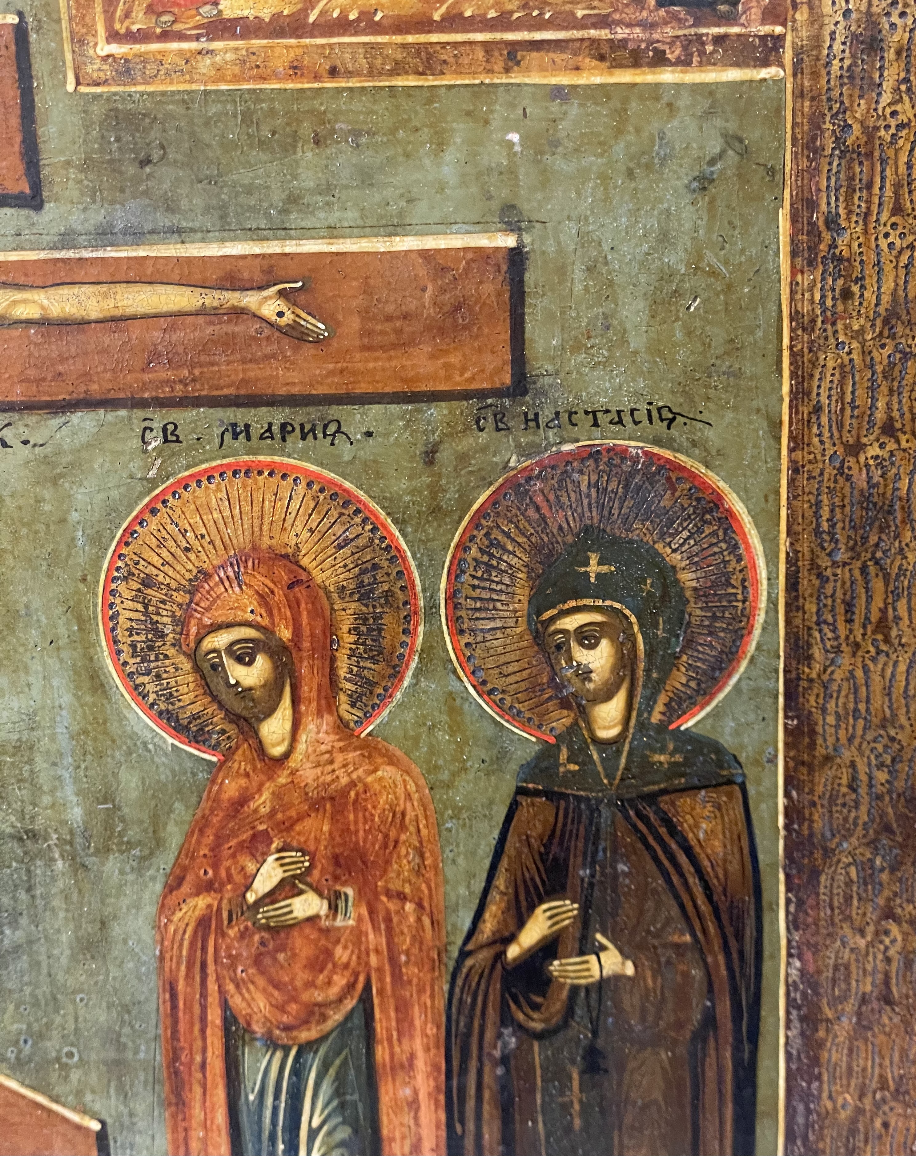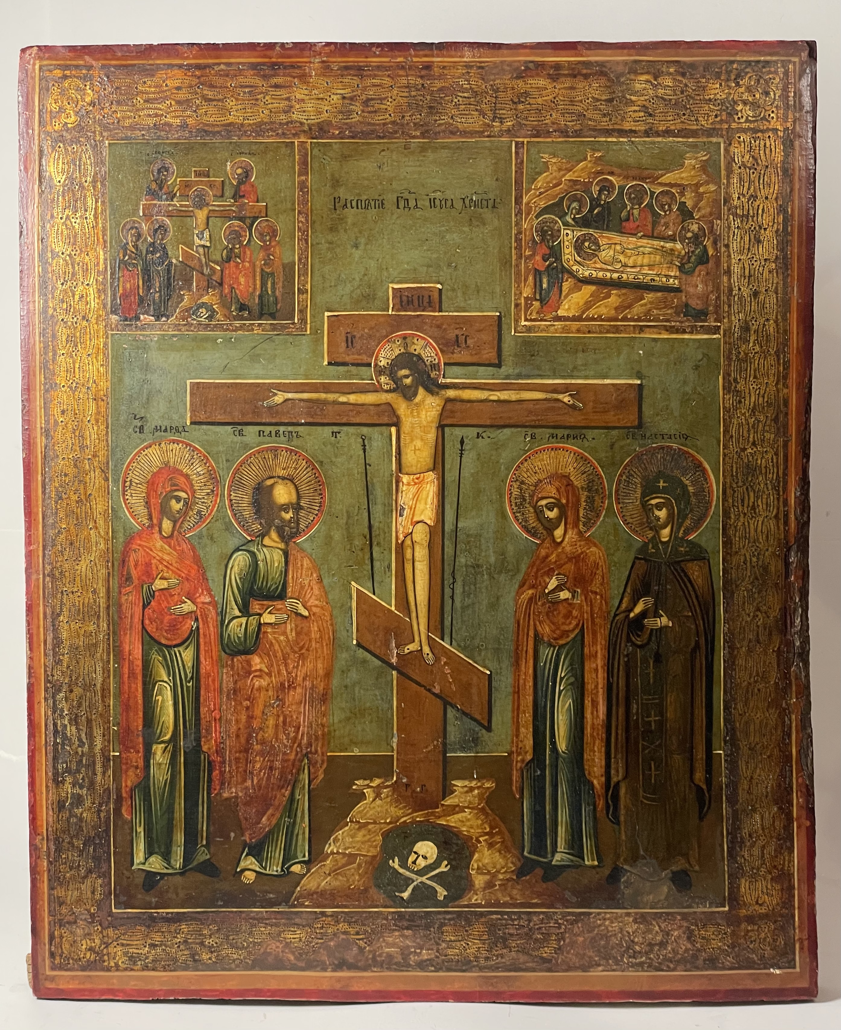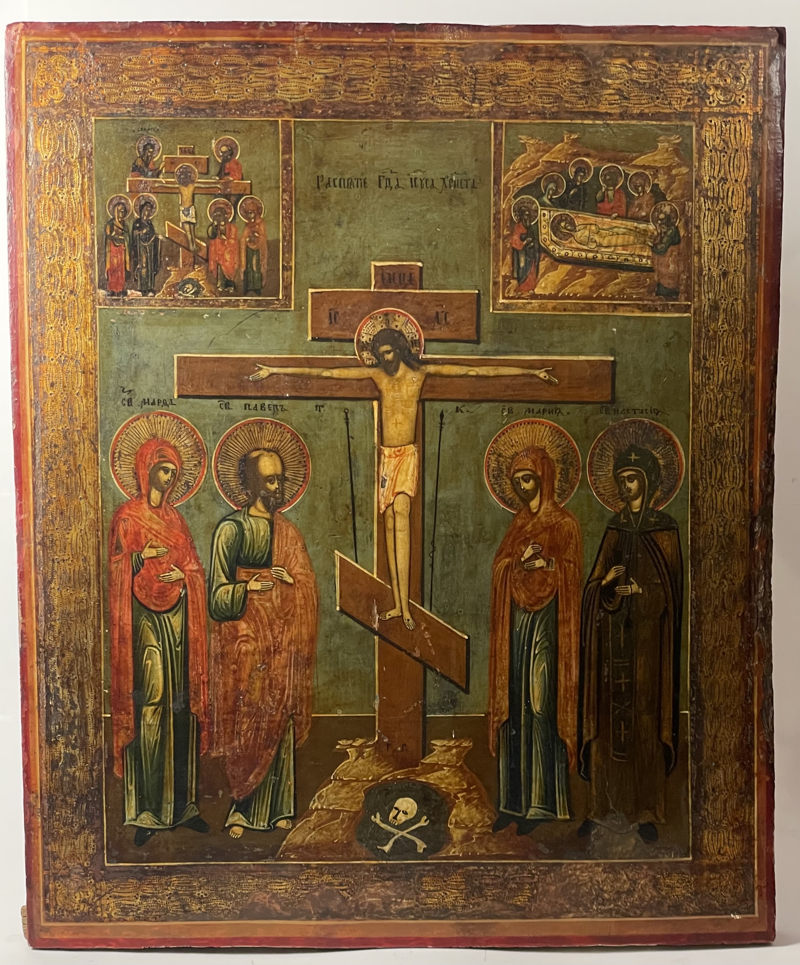 The icon depicts the crucified Christ flanked on the left by St.Martha, St. Paul and on the right with St. Mary and St. Anastasia. The vignettes with scenes of the Descent from the Cross and the Burial of Christ are depicted in the upper corners.