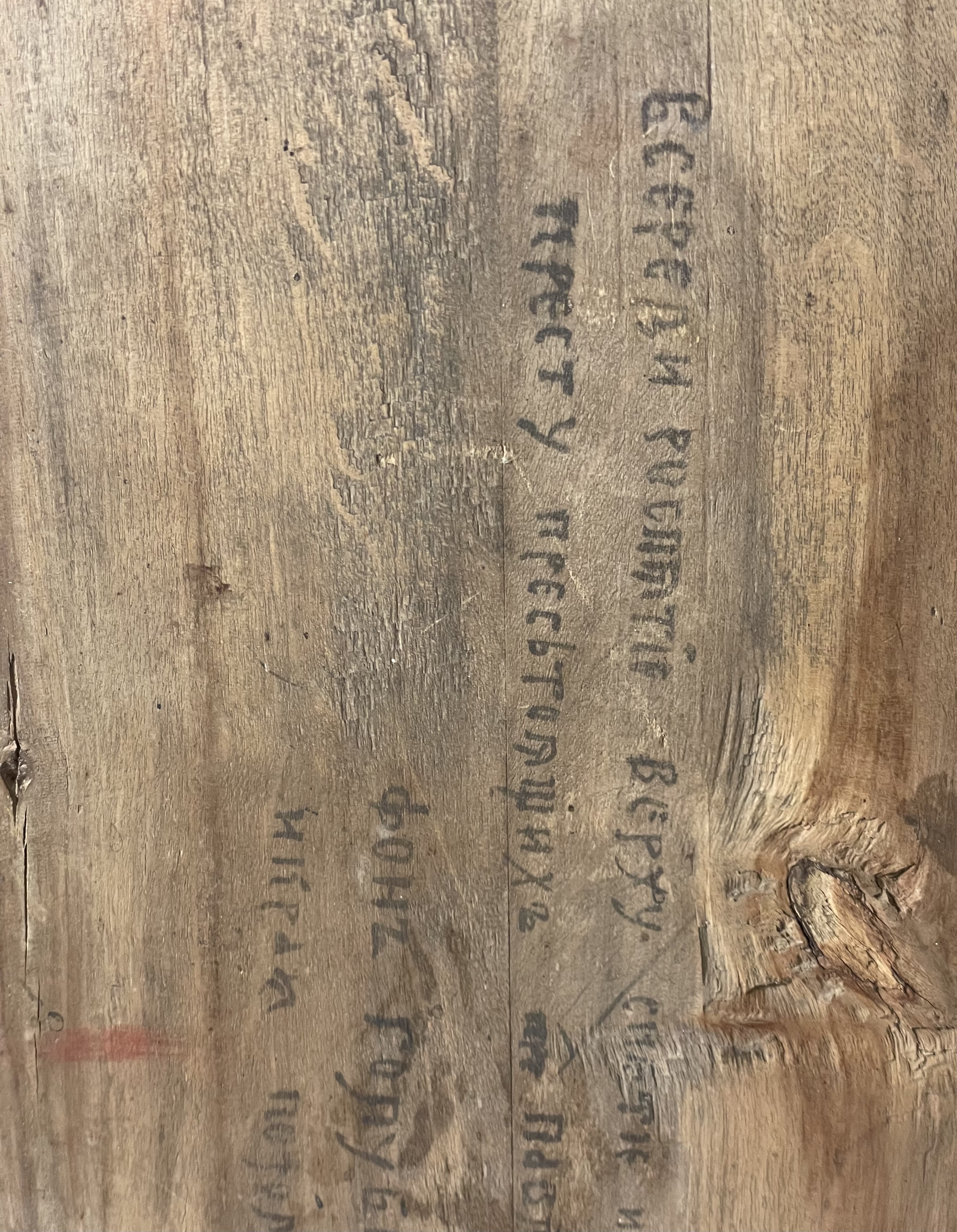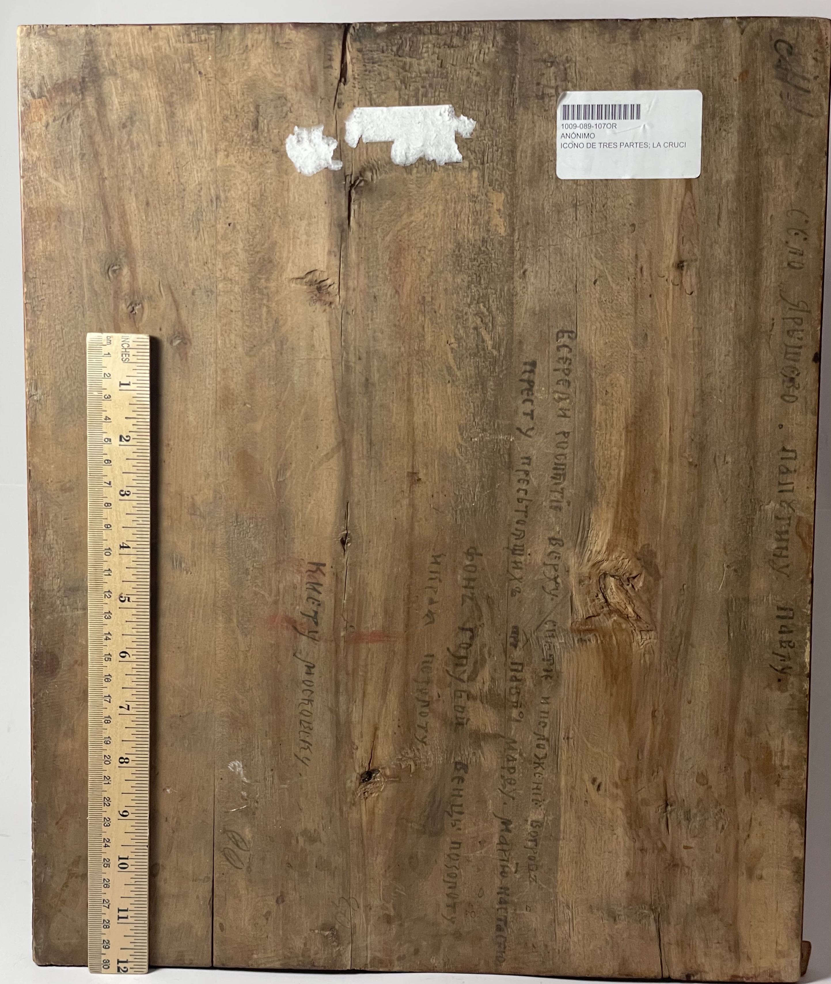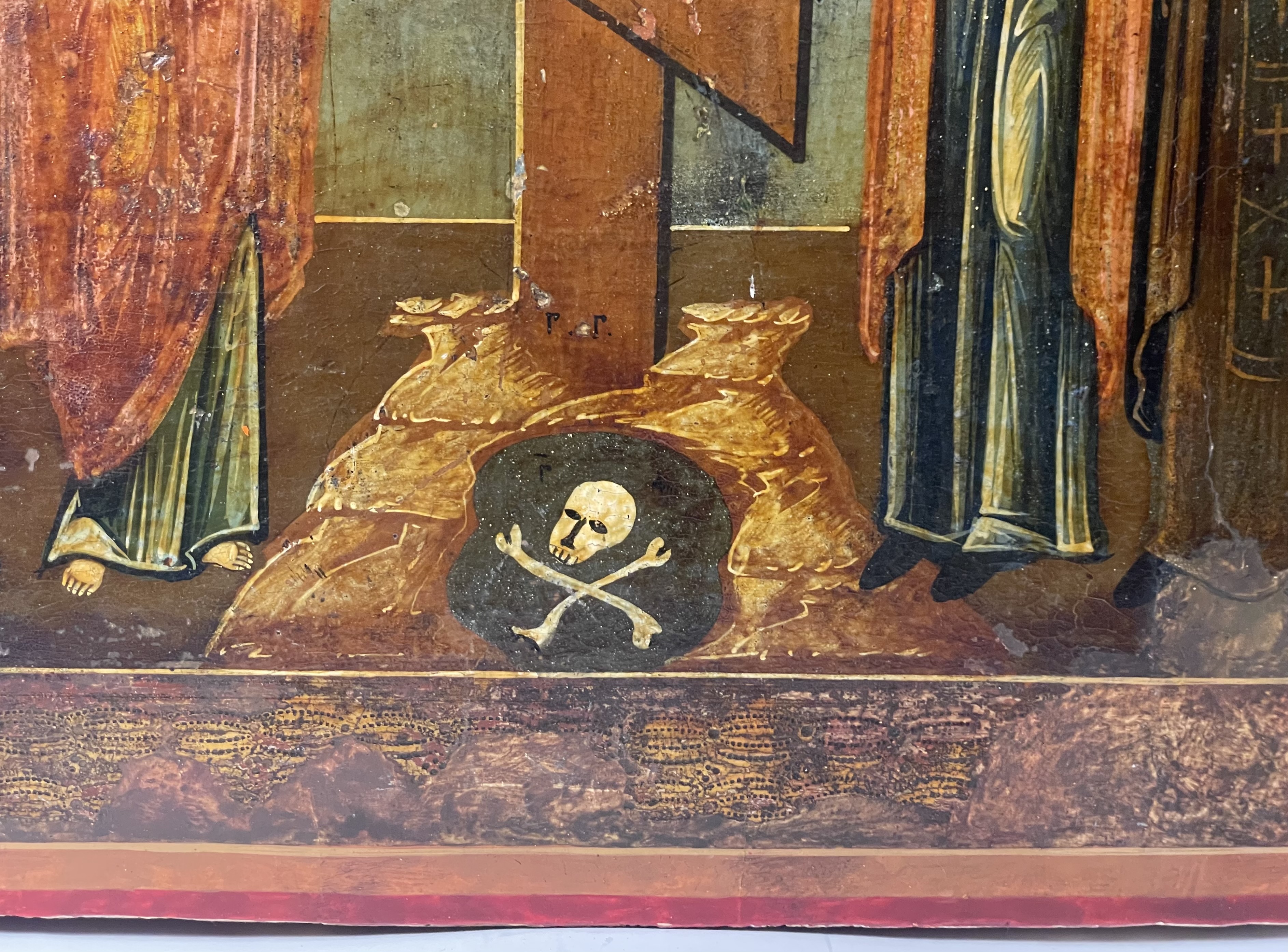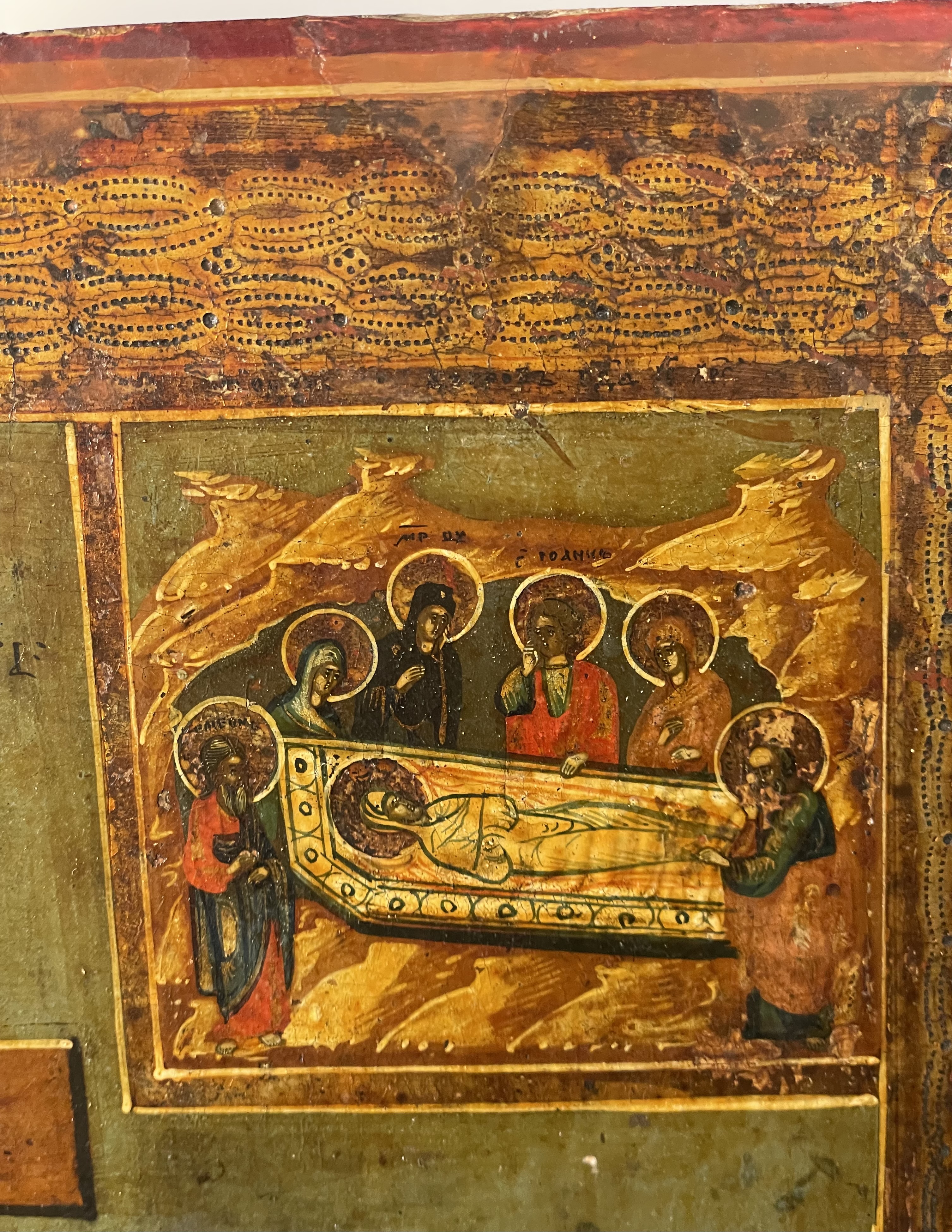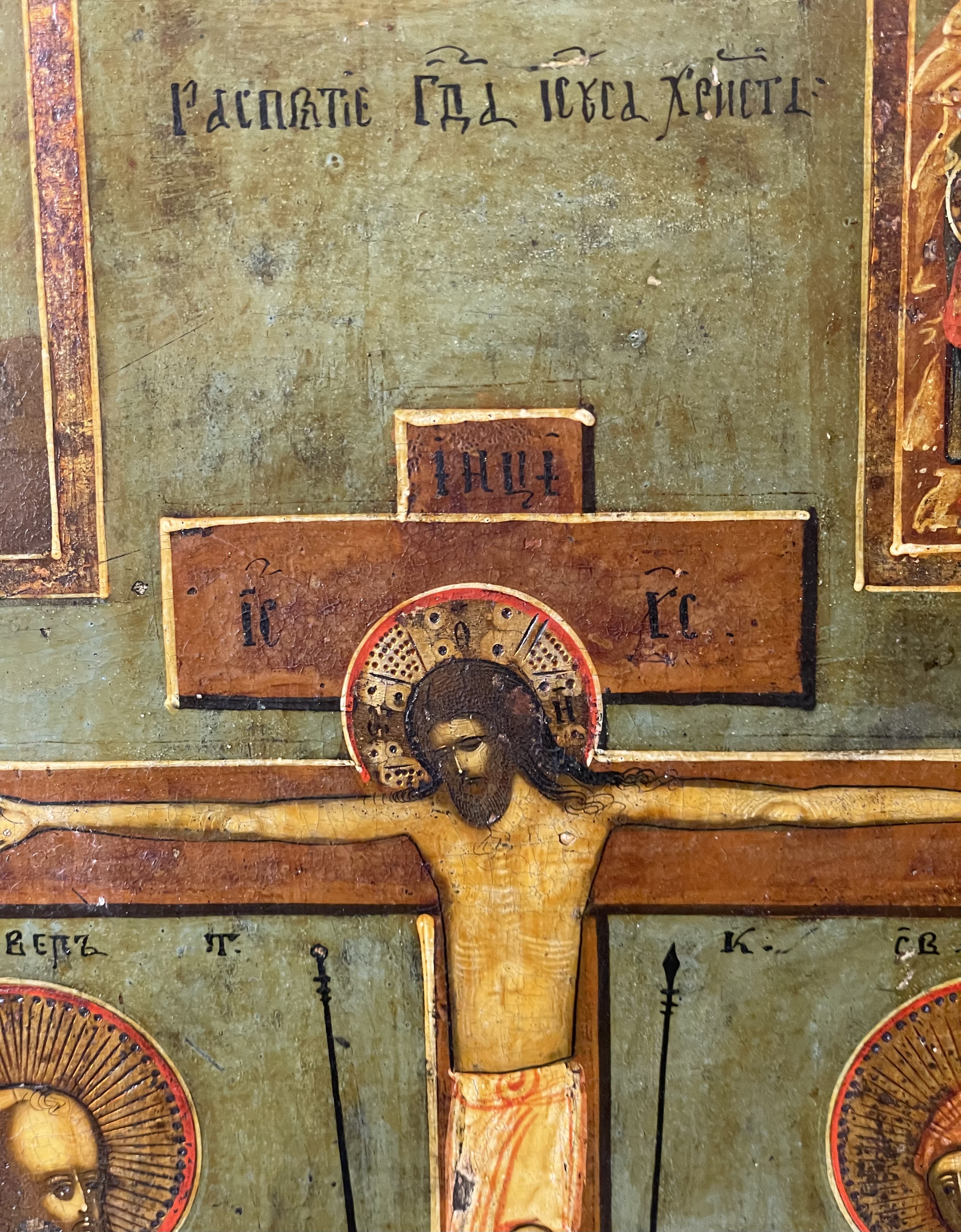 The icon depicts the crucified Christ flanked on the left by St.Martha, St. Paul and on the right with St. Mary and St. Anastasia. The vignettes with scenes of the Descent from the Cross and the Burial of Christ are depicted in the upper corners.