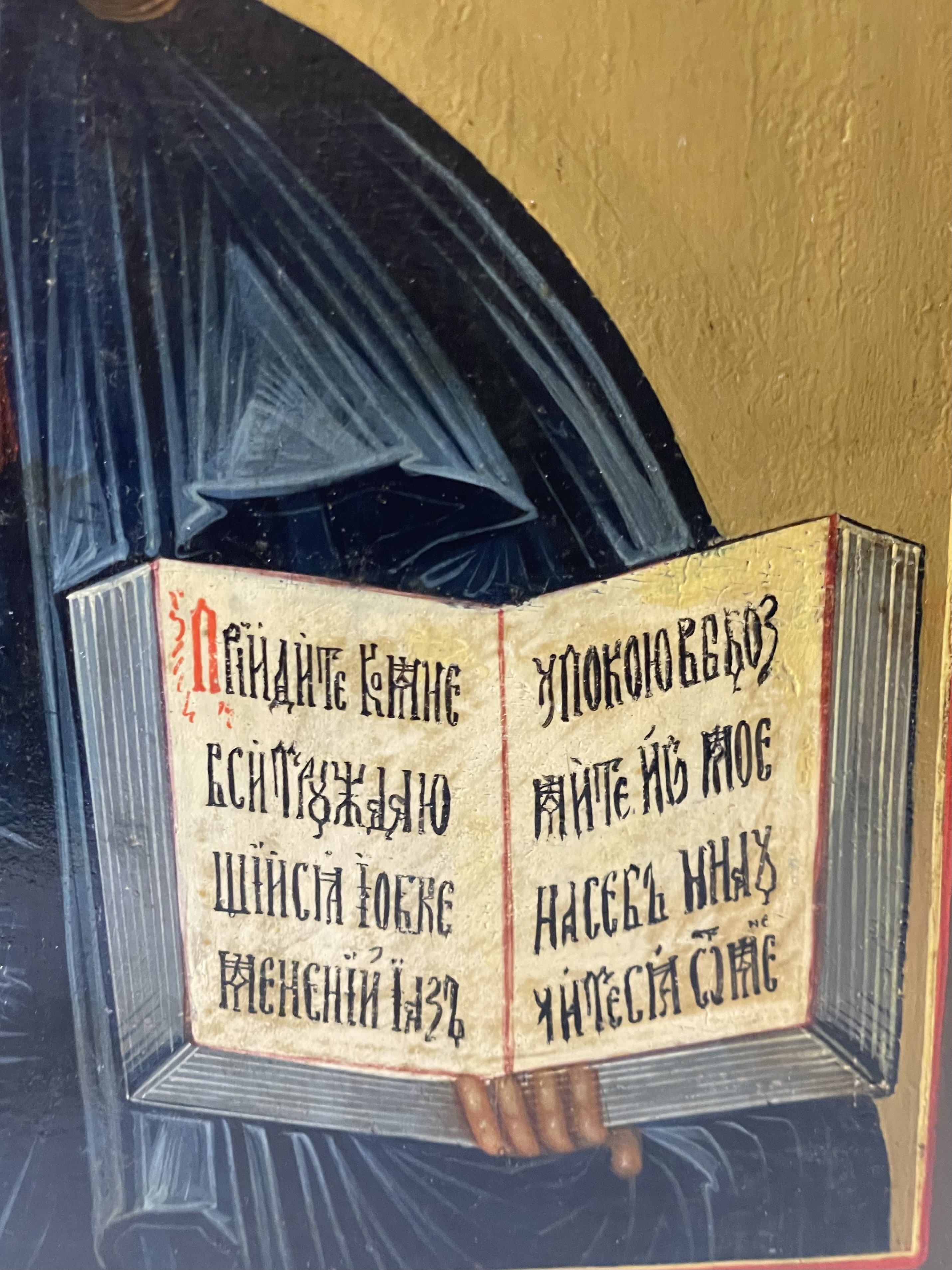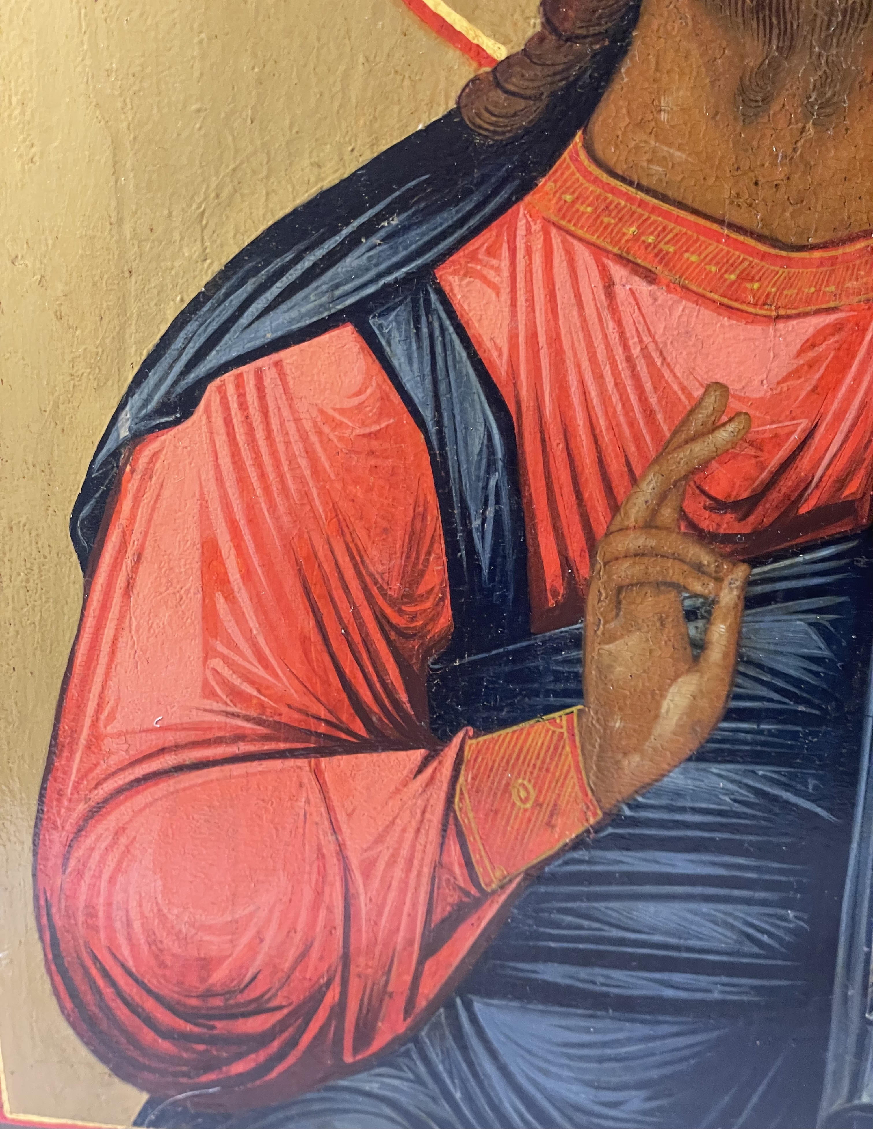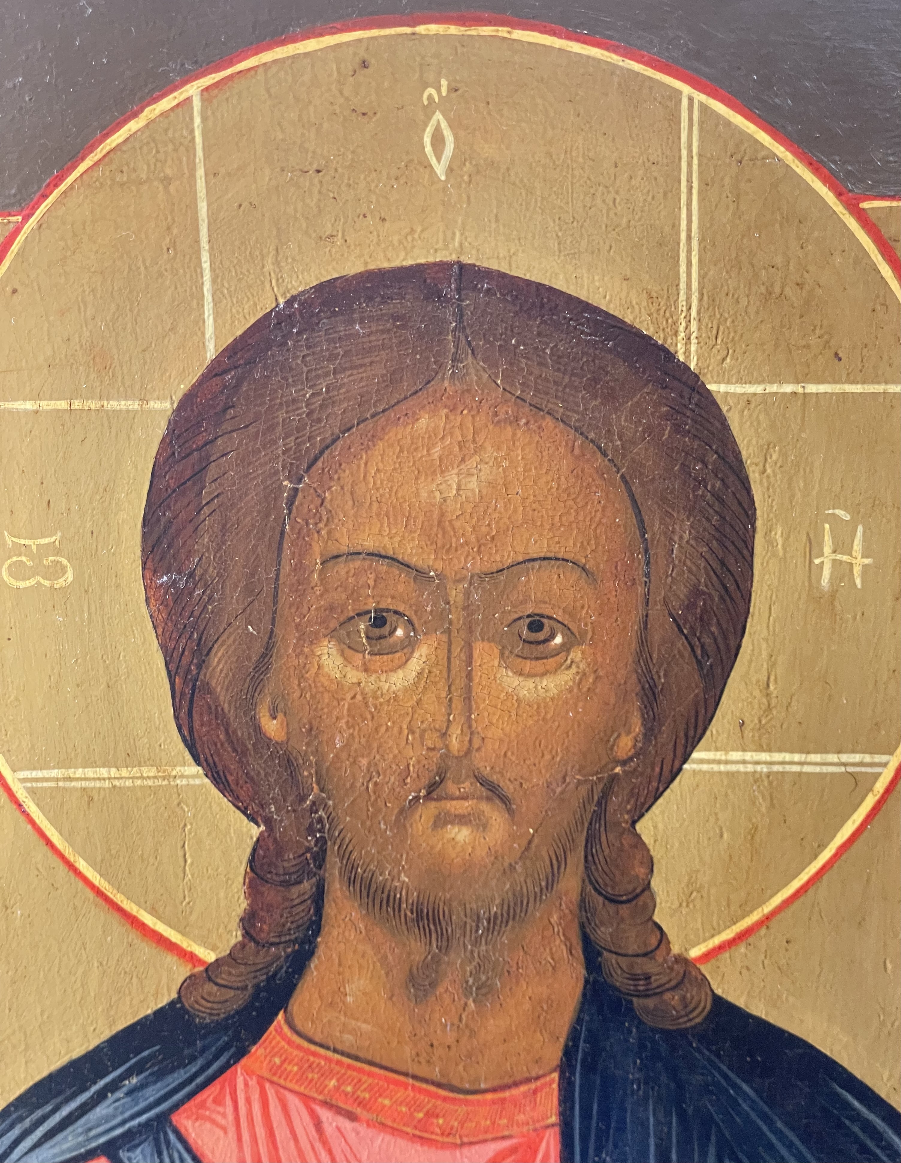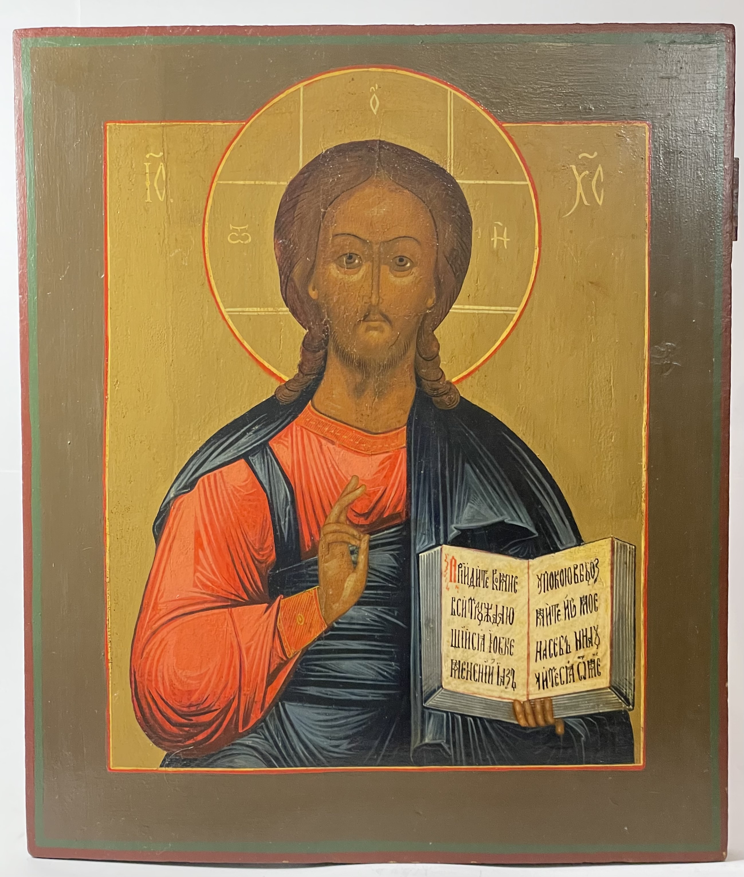 Christ Pantocrator is one of the most common subjects in Russian iconography, and its iconography follows a traditional pattern. In these icons, Christ is depicted as a powerful and majestic figure, with his right hand raised in blessing and his left hand holding an open book of the Gospels. The term "Pantocrator" means "Almighty" or "Ruler of All," and the image of Christ in this role conveys his power and authority as the divine judge and ruler of the world. The icon portrays Christ with a stern expression, indicating his righteous judgment and the seriousness of his message. The icon's composition features Christ's head and shoulders in the center of the image, with his body slightly turned to the right. He is shown wearing a red tunic and blue mantle, with his long hair and beard flowing around his face. The Gospels are opened on Matthew 11:28 “Come unto me, all ye that labor and are heavy laden, and I will give you rest.” Overall, the iconography of Christ Pantocrator is a powerful and striking representation of Christ's authority and judgment and a reminder of the spiritual power and majesty of the Christian faith.