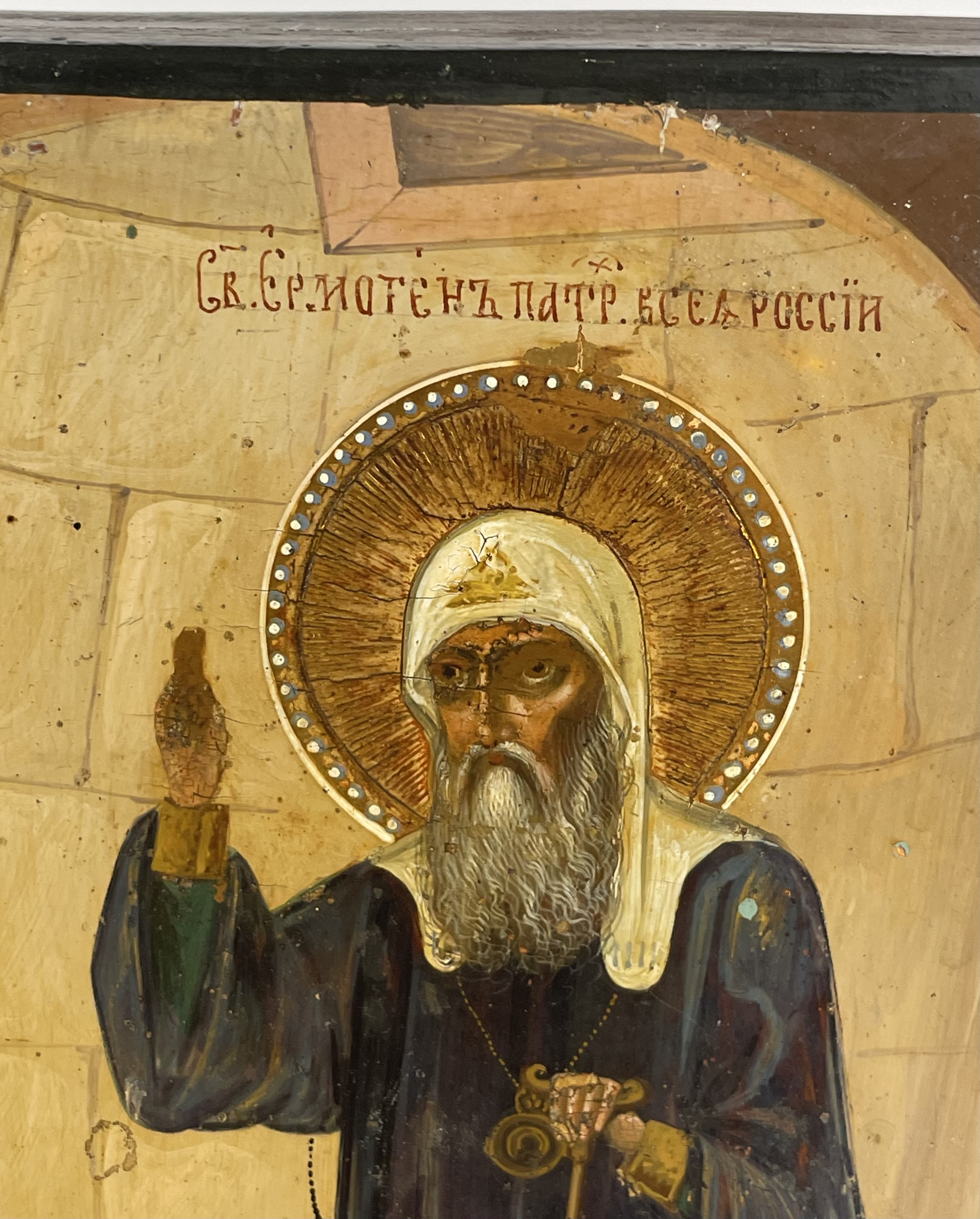 Saint Hermogenes, or Germogen (†1612) was the Patriarch of Moscow and all Russia who inspired the popular uprising that put an end to the Time of Troubles and was canonized by the Russian Orthodox Church in 1913. The icon was probably painted at the time of his canonization.