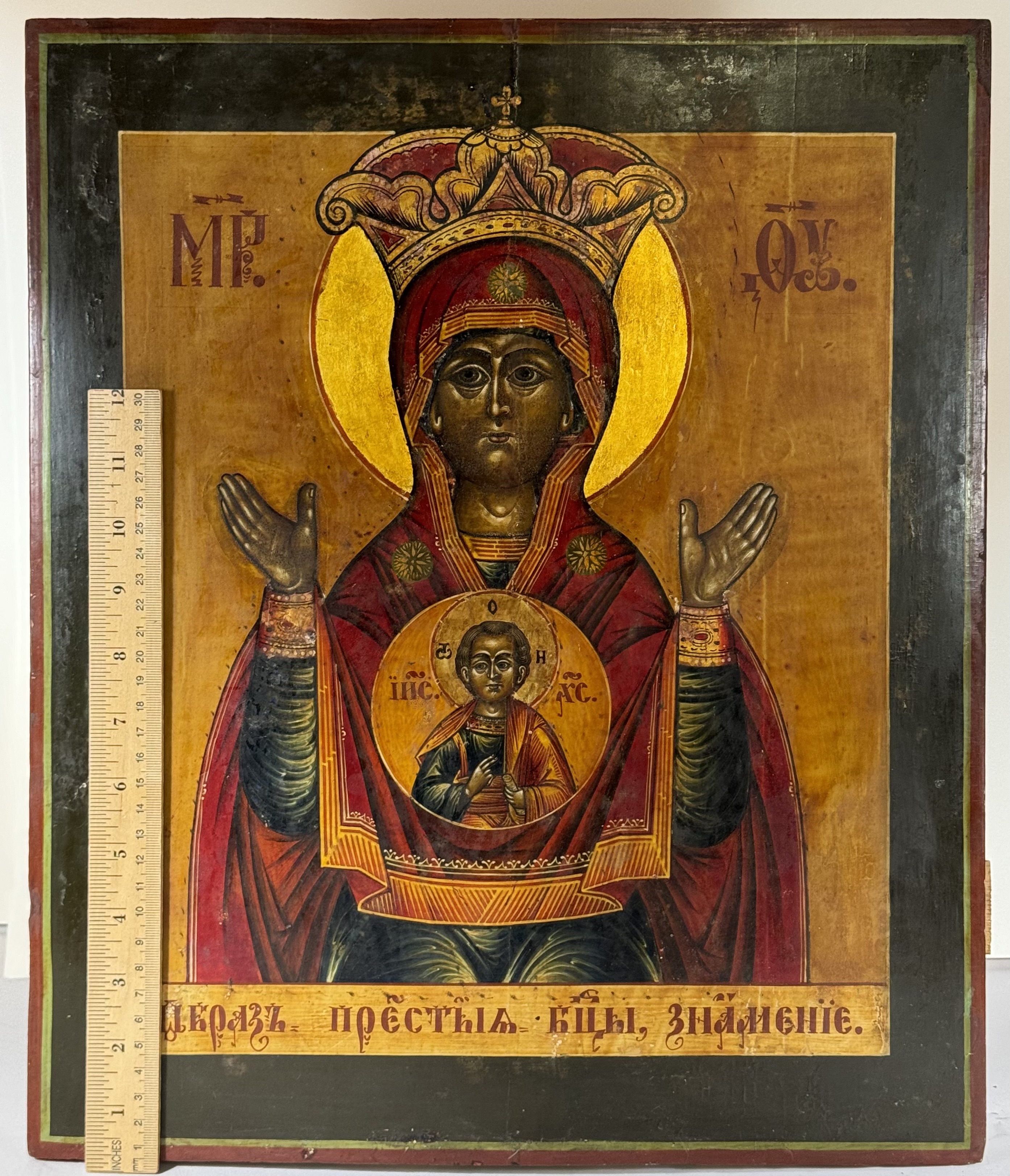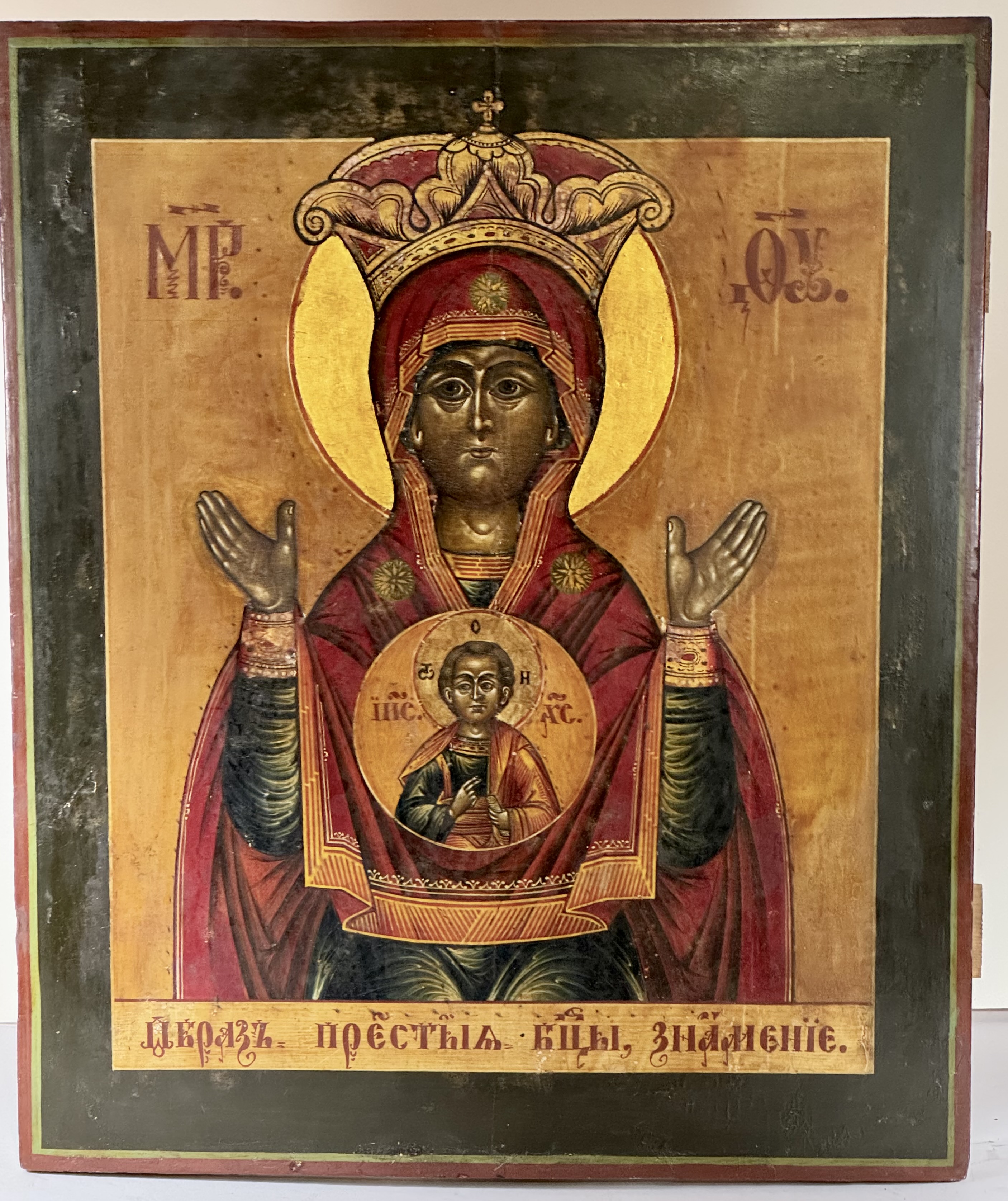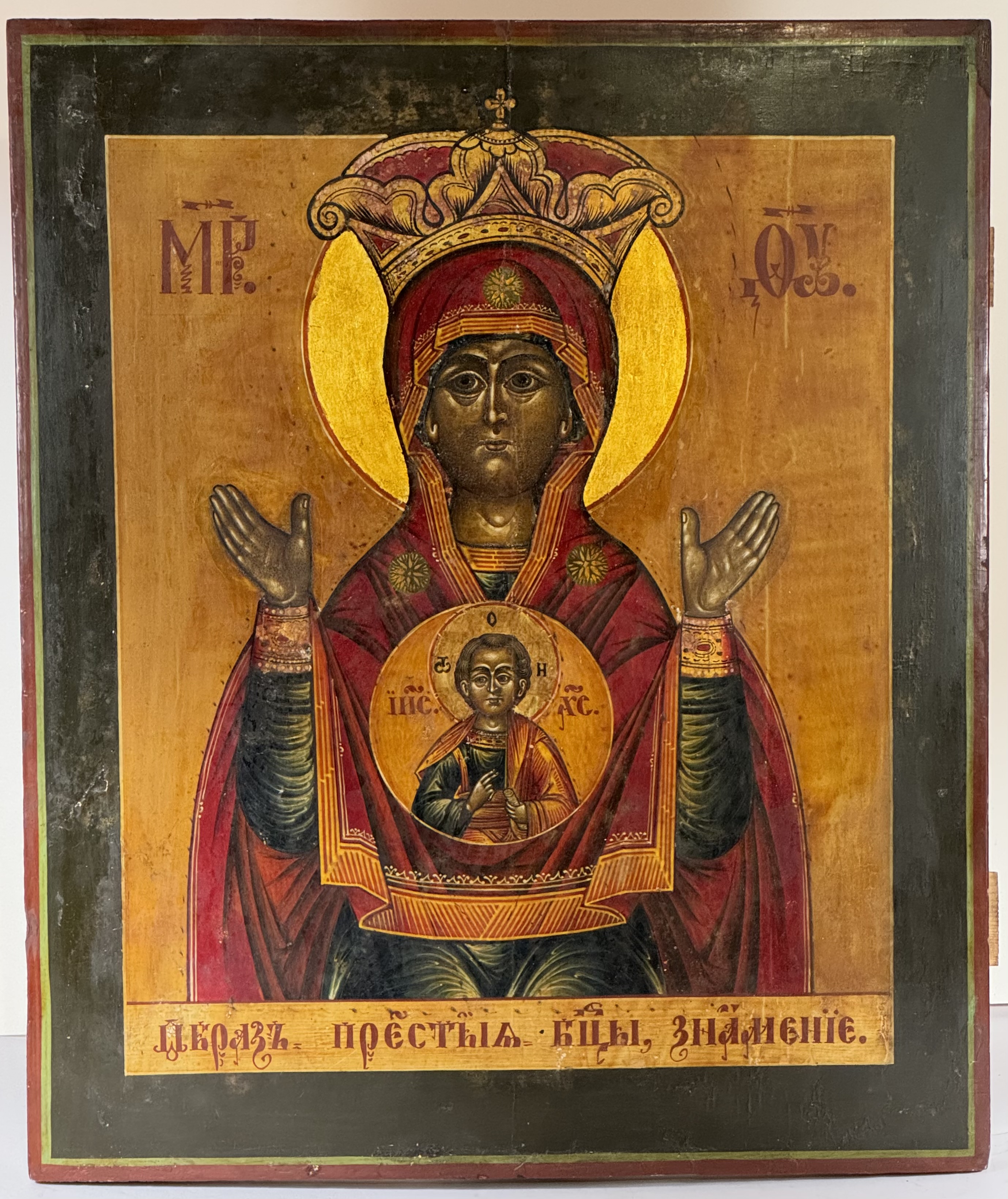 Our Lady of the Sign is one of the most beloved Russian miracle-working icons of Theotokos. The icon depicts Her during the Annunciation at the moment of saying, "May it be done to me according to your word." (Luke 1:38). The Virgin Mary is depicted frontally half-length, with her hands raised in a praying position, and the Child Jesus within a round aureole upon her breast representing him at the moment of his conception. The term Virgin of the Sign is a reference to the prophecy of Isaiah 7:14: "Therefore the Lord himself shall give you a sign; Behold, a virgin shall conceive, and bear a son, and shall call his name Immanuel."