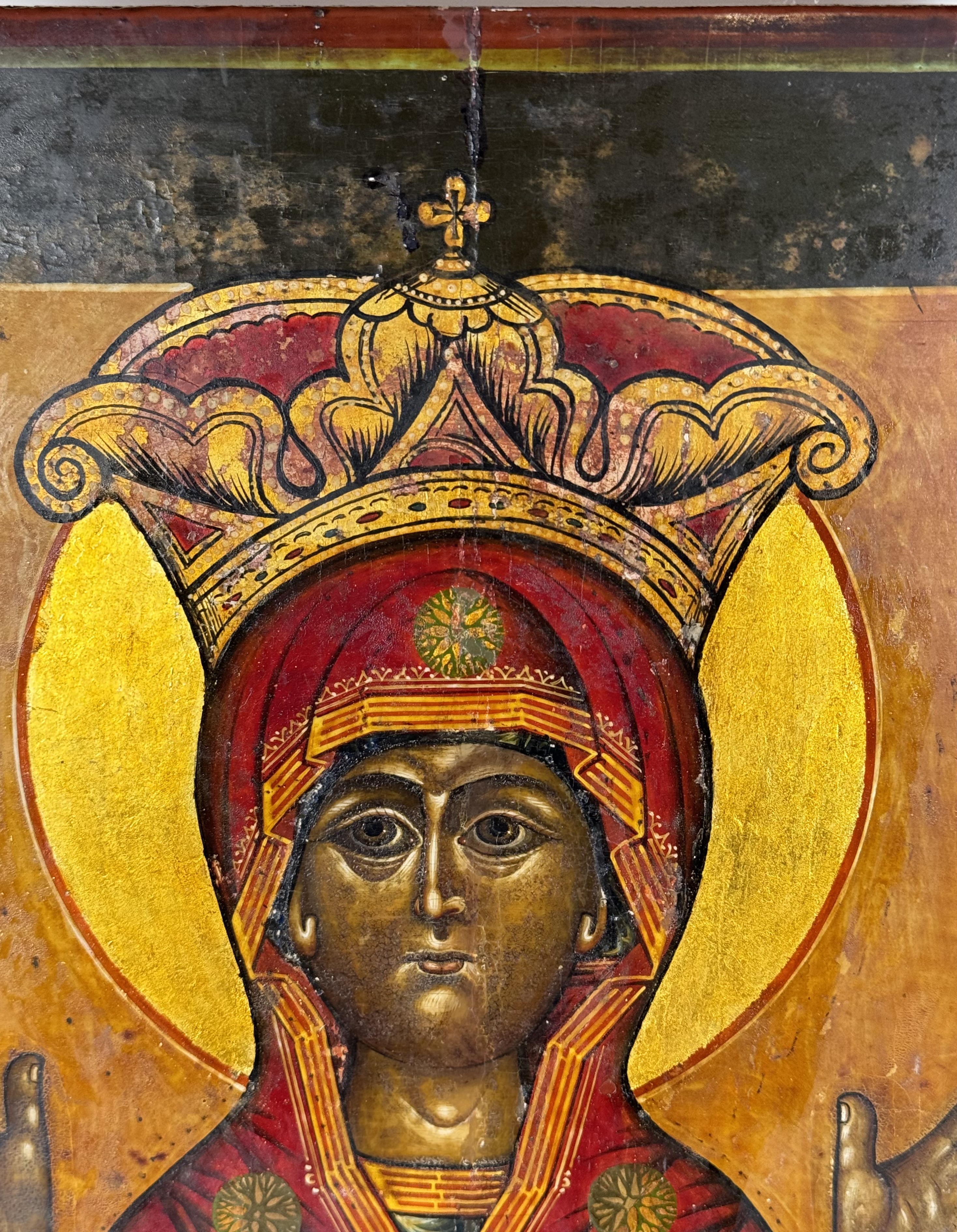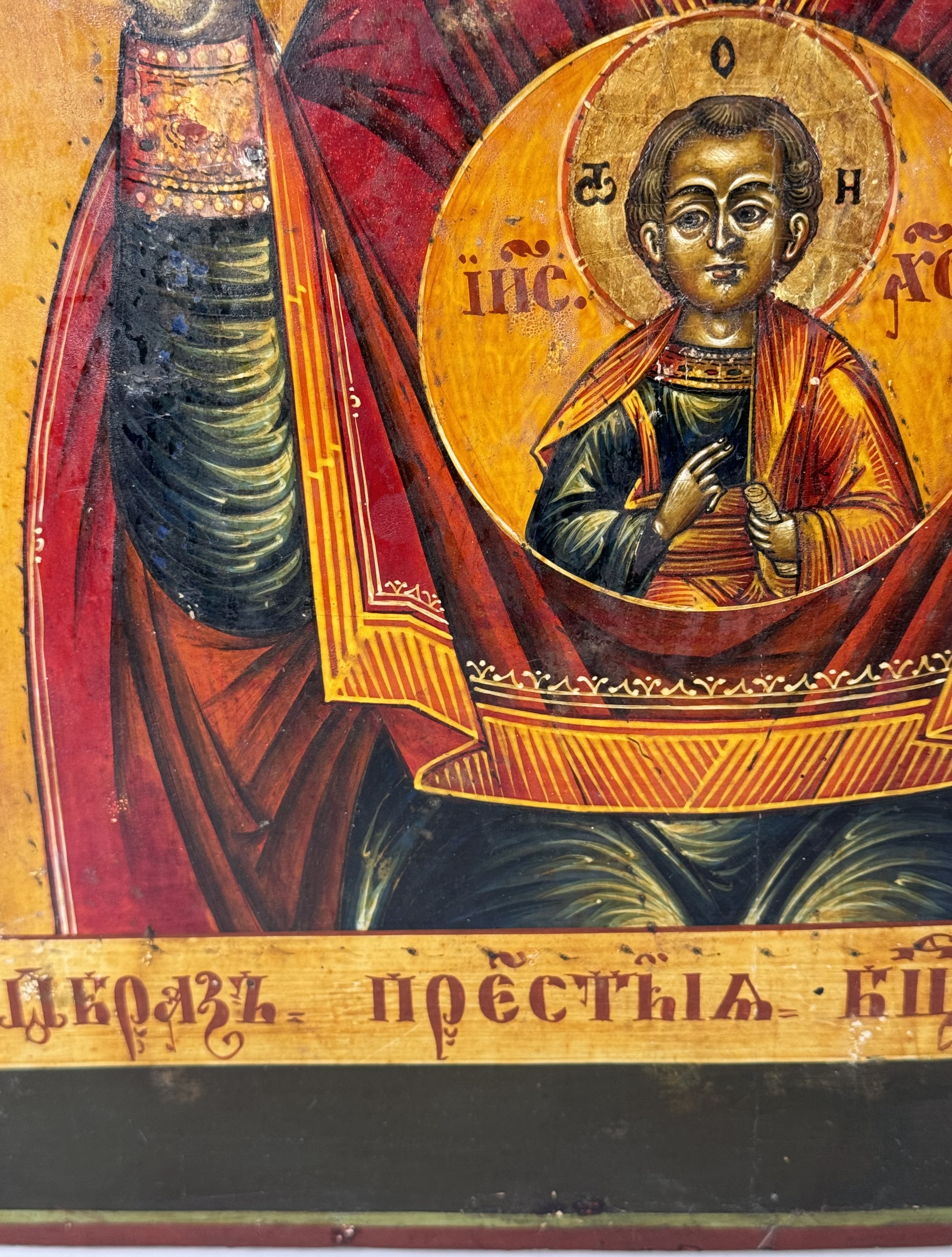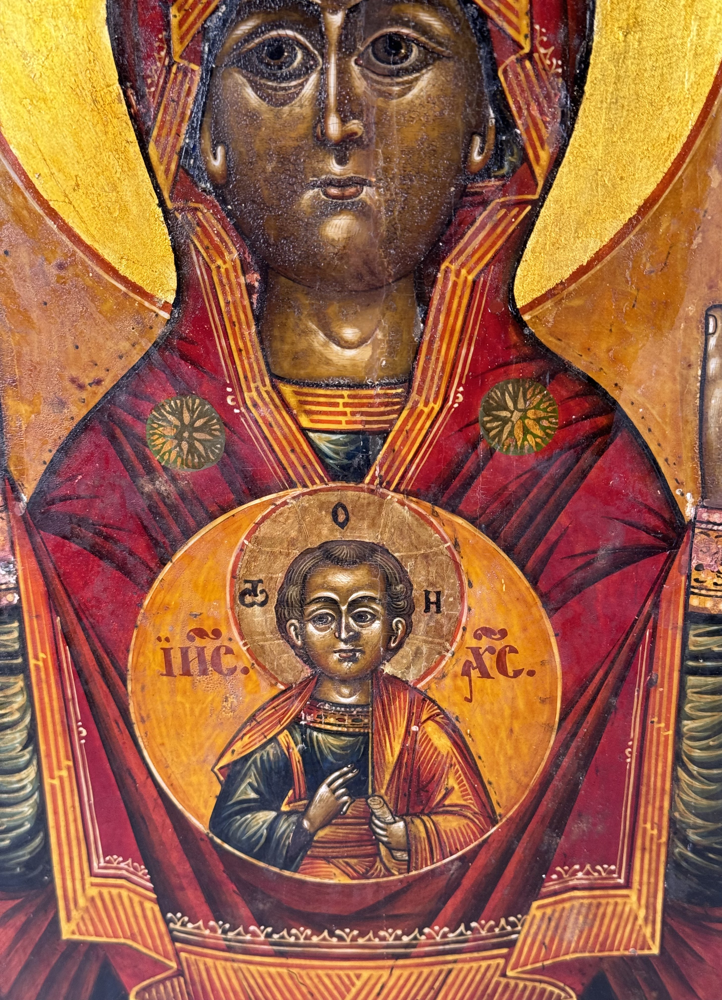 Our Lady of the Sign is one of the most beloved Russian miracle-working icons of Theotokos. The icon depicts Her during the Annunciation at the moment of saying, "May it be done to me according to your word." (Luke 1:38). The Virgin Mary is depicted frontally half-length, with her hands raised in a praying position, and the Child Jesus within a round aureole upon her breast representing him at the moment of his conception. The term Virgin of the Sign is a reference to the prophecy of Isaiah 7:14: "Therefore the Lord himself shall give you a sign; Behold, a virgin shall conceive, and bear a son, and shall call his name Immanuel."