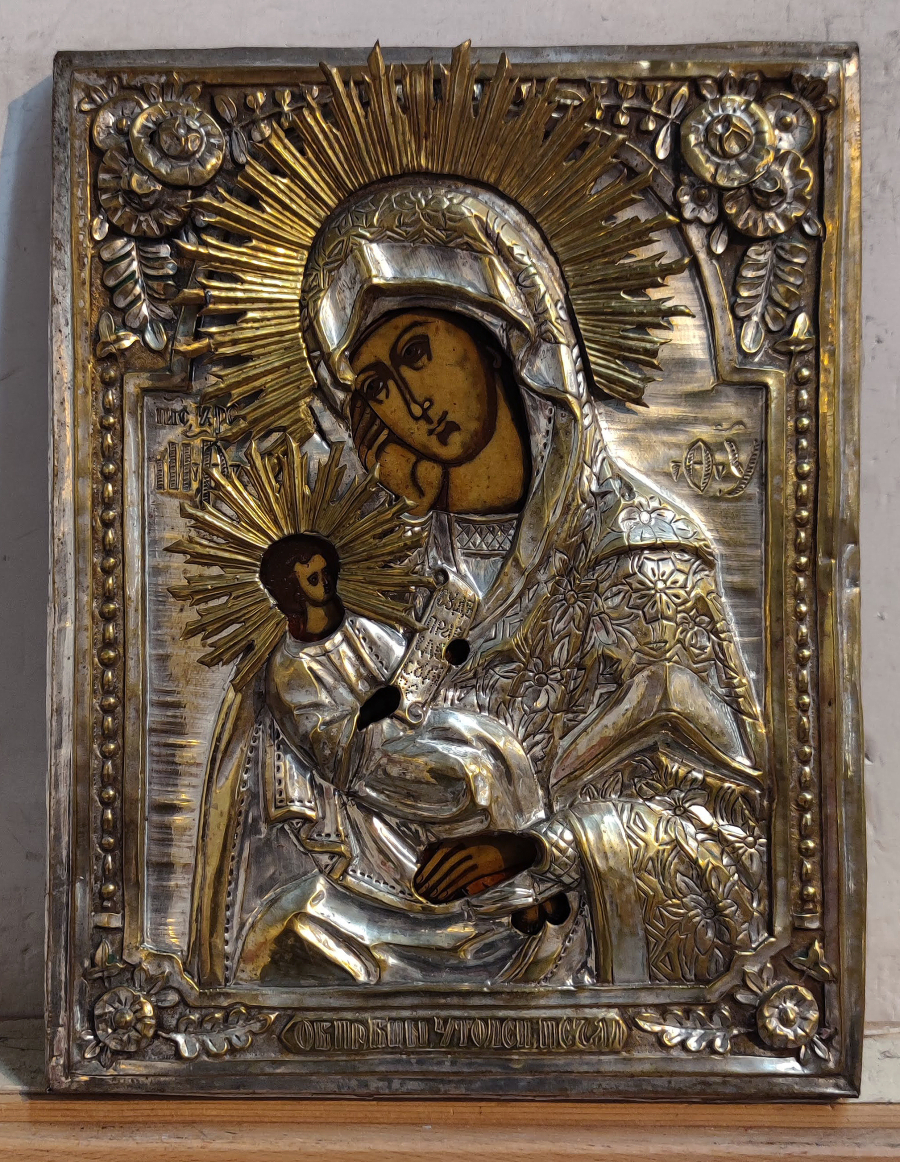 Soothe My Sorrows Mother of God is the name of a wonderworking icon treasured in the Church of St. Nikolaev Odrin Monastery in Karachev, Orlov province and copies of this icon are to be found in churches all over Moscow. The Mother of God is depicted crowned with a hand bending toward her head and with the Child holding a scroll in both hands directly sitting on her left hand. On the scroll are the words: "Judge righteously; each show mercy to one another; do not offend widows and orphans, and do not keep malice in your heart towards your brother." Tradition relates that the first time this icon was glorified was in the second half of the 18th century when the miraculous power was revealed through a certain woman who had been suffering from a weakness in her hands and feet. Physicians were not able to help her with her ailment and in a vision, she was told to go to Moscow and pray before the icon of the Mother of God bearing the inscription "Soothe my Sorrows;" in the same vision, she was shown the icon. Not finding that icon in the church, she turned to the priest for help, who then brought all of the ancient icons down from the bell tower. One of the icons bore the inscription "Soothe my Sorrows." As soon as the woman saw the icon, she exclaimed: “It is she! It is she!” After a prayer, the ailing woman felt so much stronger that she was able to stand and leave the church unaided.