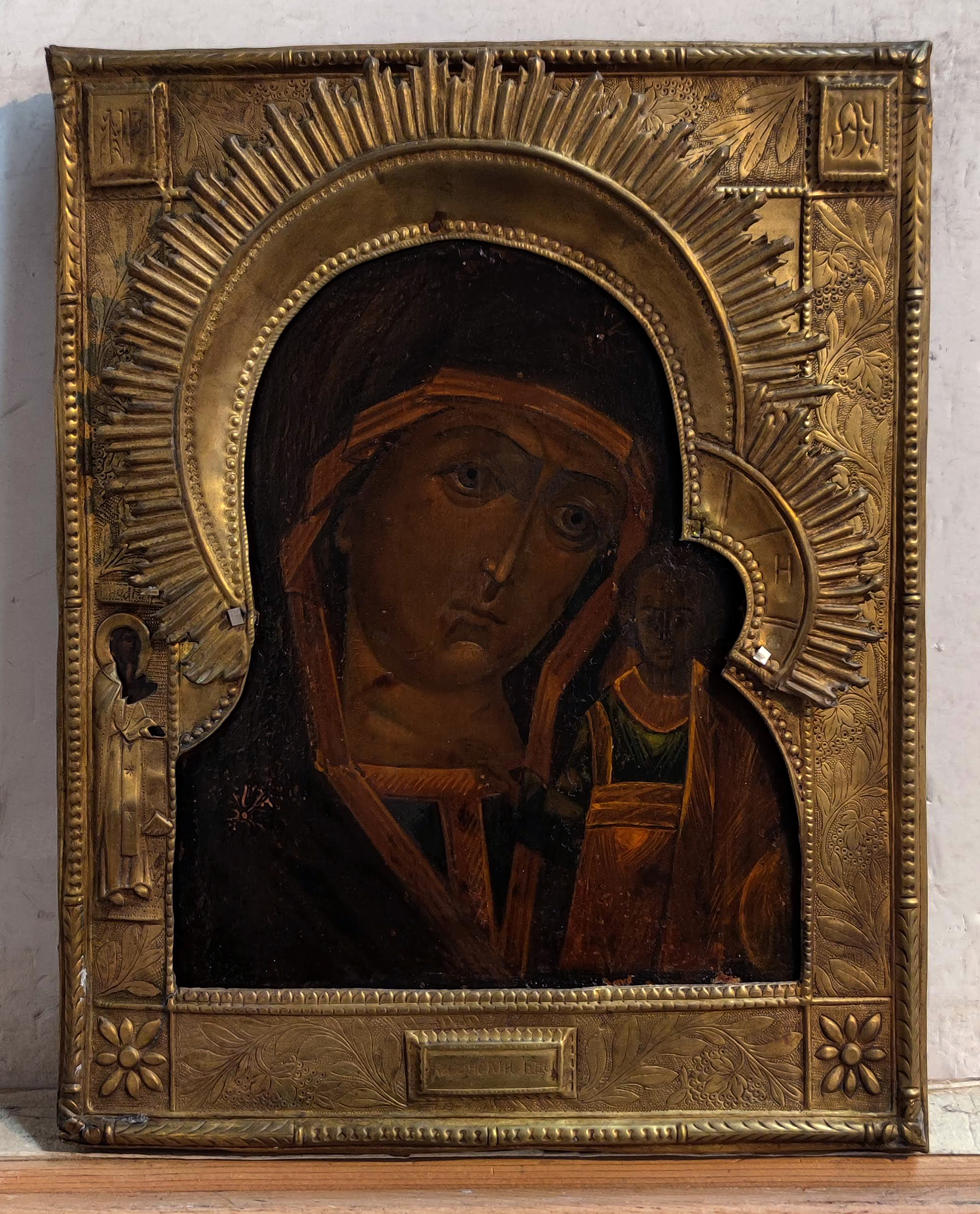 Our Lady of Kazan is a holy icon of the highest stature within the Russian Orthodox Church and is considered a palladium of Russia for centuries until its theft and likely destruction in 1904. The icon represents the Virgin Mary as the protector and patroness of the city of Kazan. It is a close-up variant of the Hodegetria (Directress) style, it is noted mainly for the Child standing, with the Virgin chest length. The Kazan icons are traditionally small, following the original. The Kazan icon was very popular in Russia, especially as a wedding gift, and many copies were made in the design of the original. Two major Kazan Cathedrals, in Moscow and St. Petersburg, are consecrated to Our Lady of Kazan, as are numerous churches throughout the land. Her feast days are July 21 and November 4.