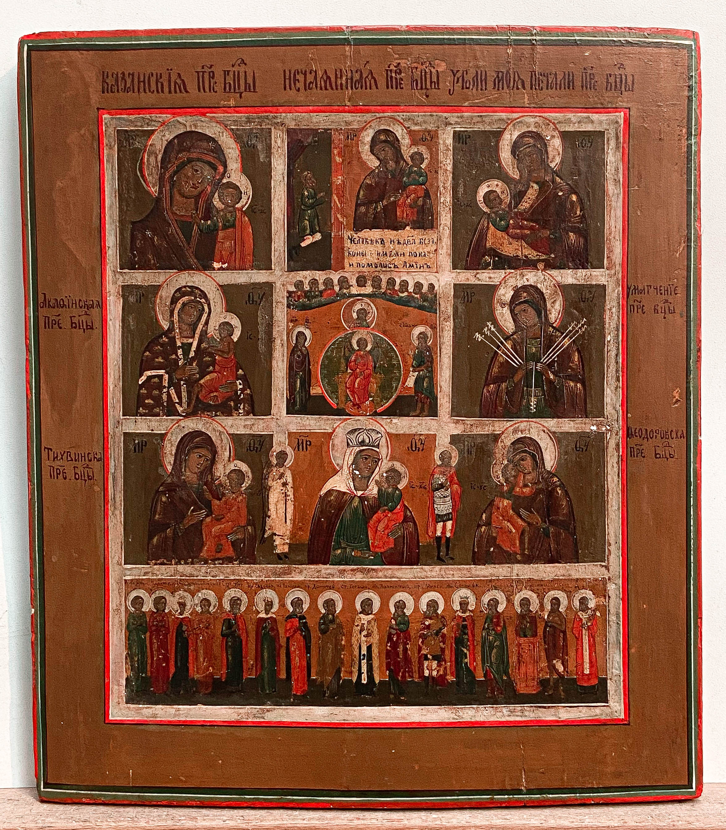 The icon depicts the following eight miracle-working Madonnas surrounding the Orthodox Deisis: Our Lady of Kazan, Our Lady of the Unexpected Joy, Sooth My Sorrow Mother of God, Soothing of the Evil Hearts Mother of God, Theodorovsky Mother of God, Our Lady of Częstochowa, Our Lady of Tikhvin, Our Lady of Akhtyrsk. A row of full-figured local saints is depicted below them.
