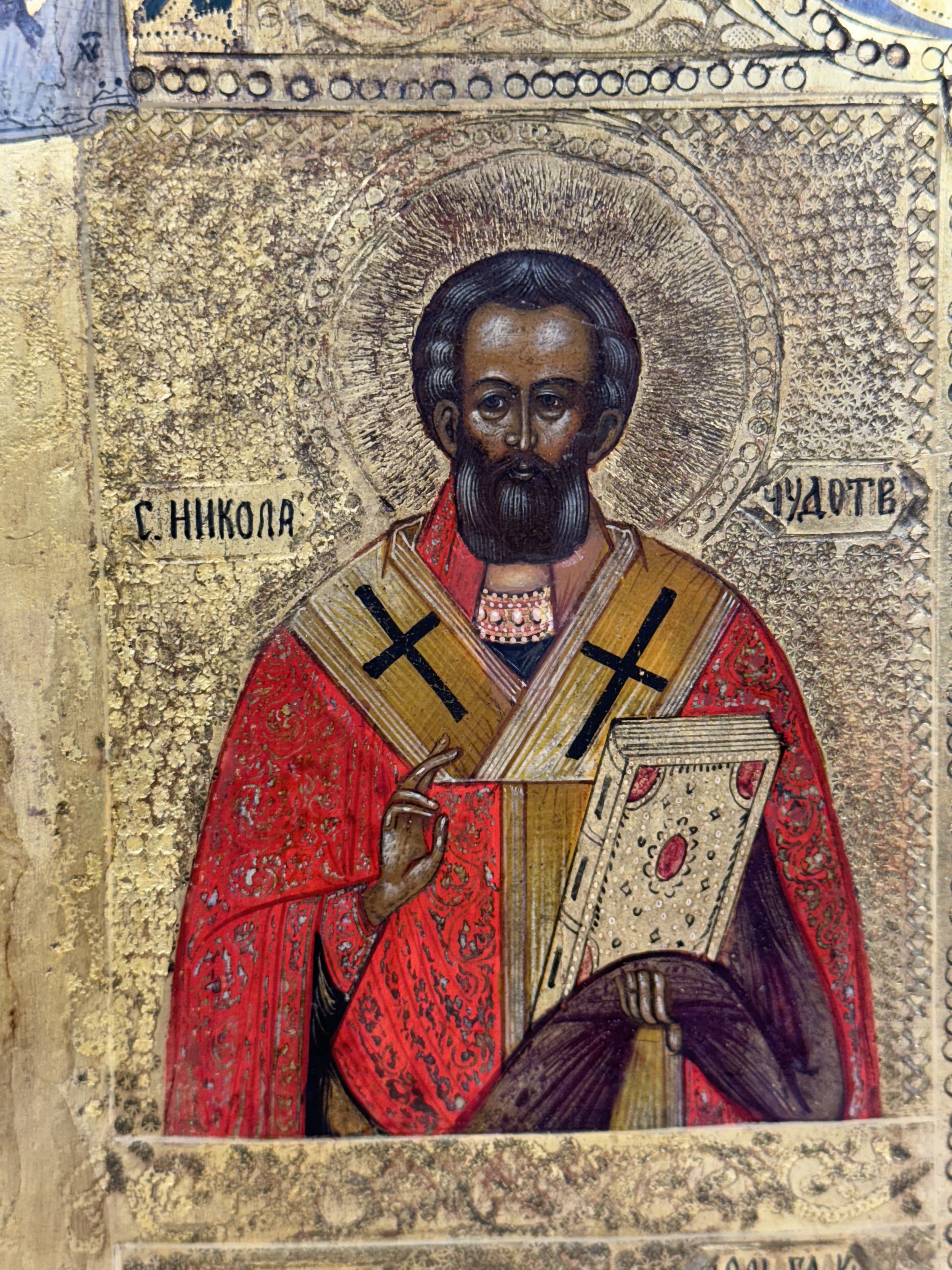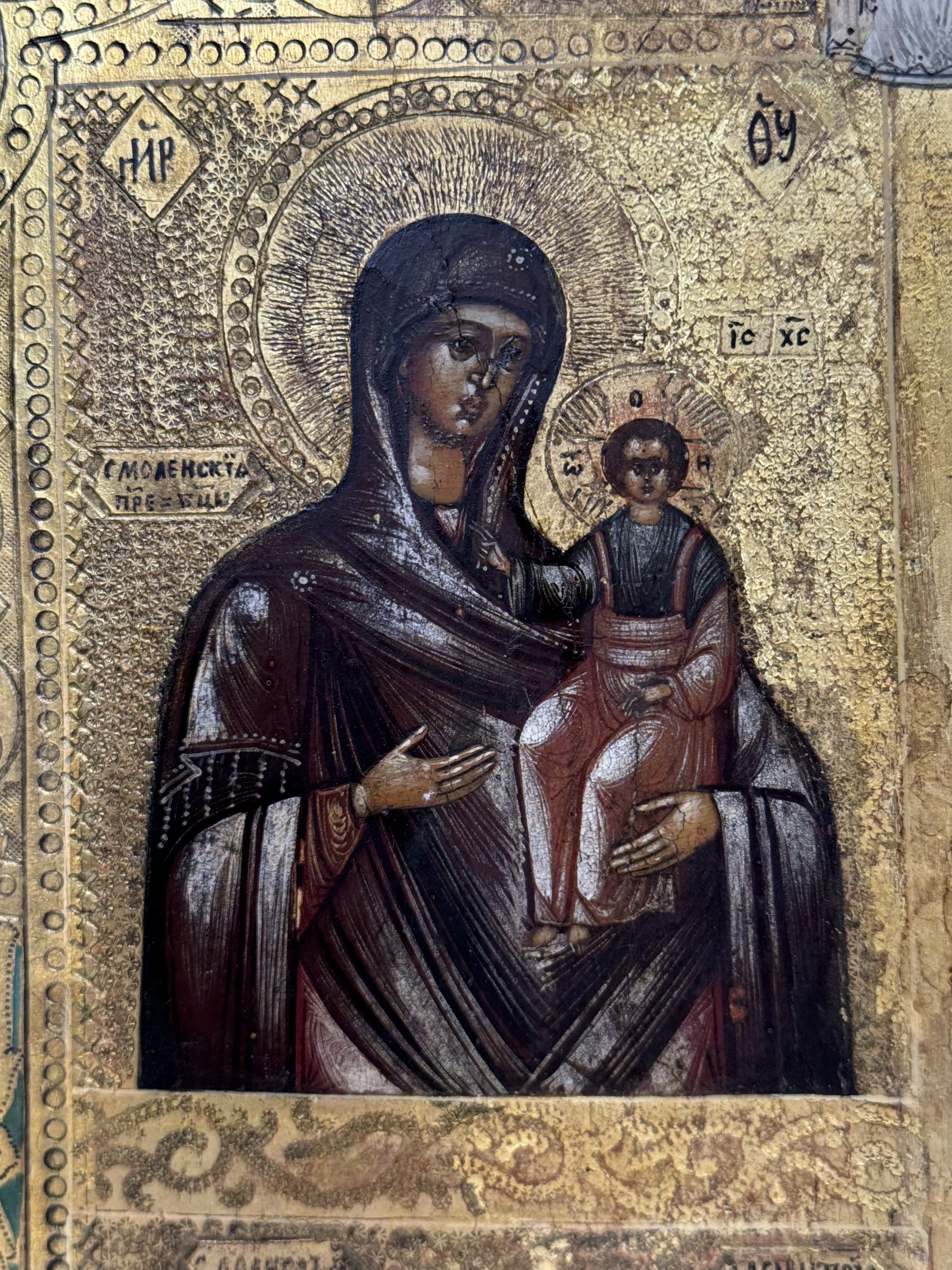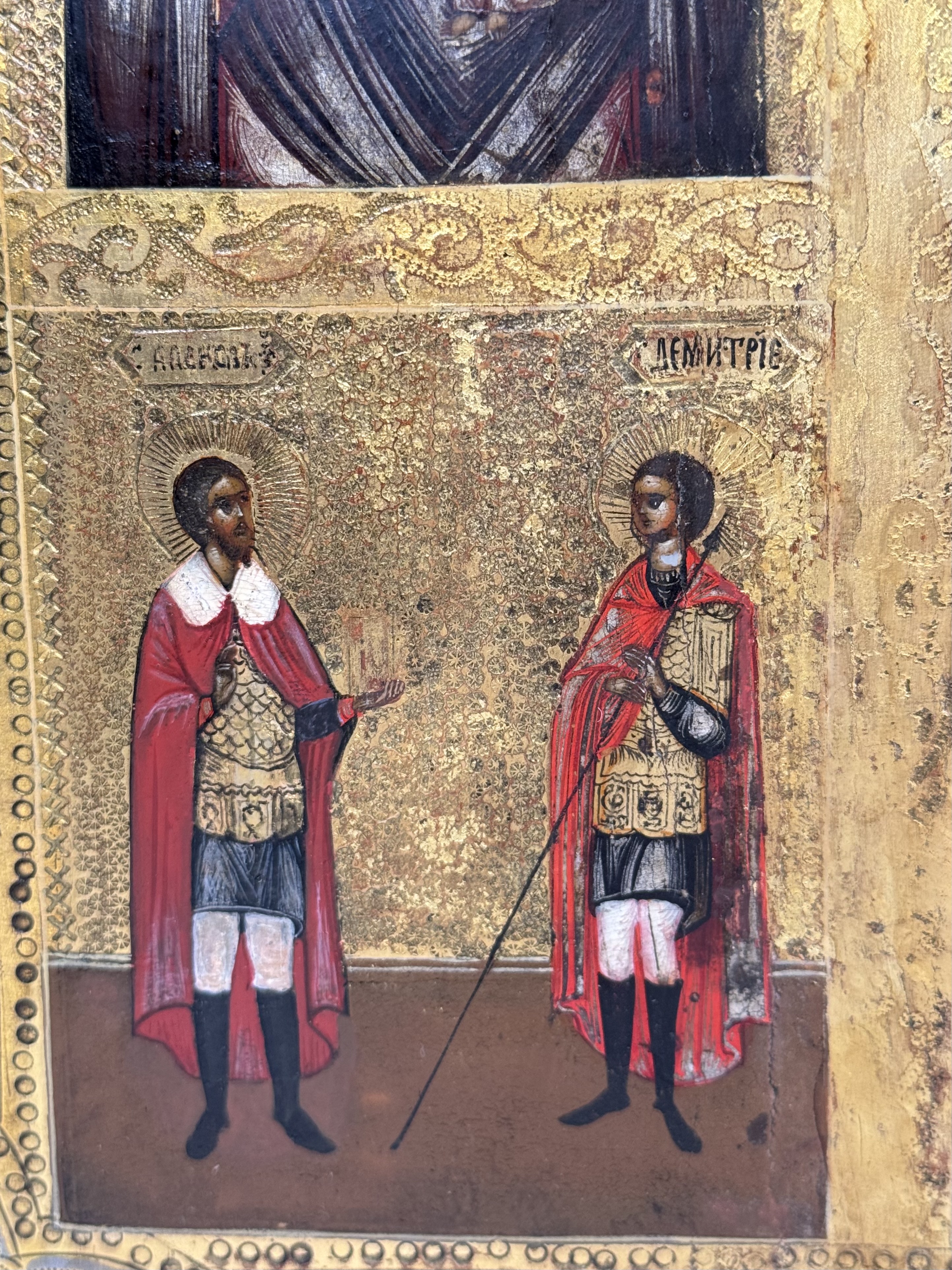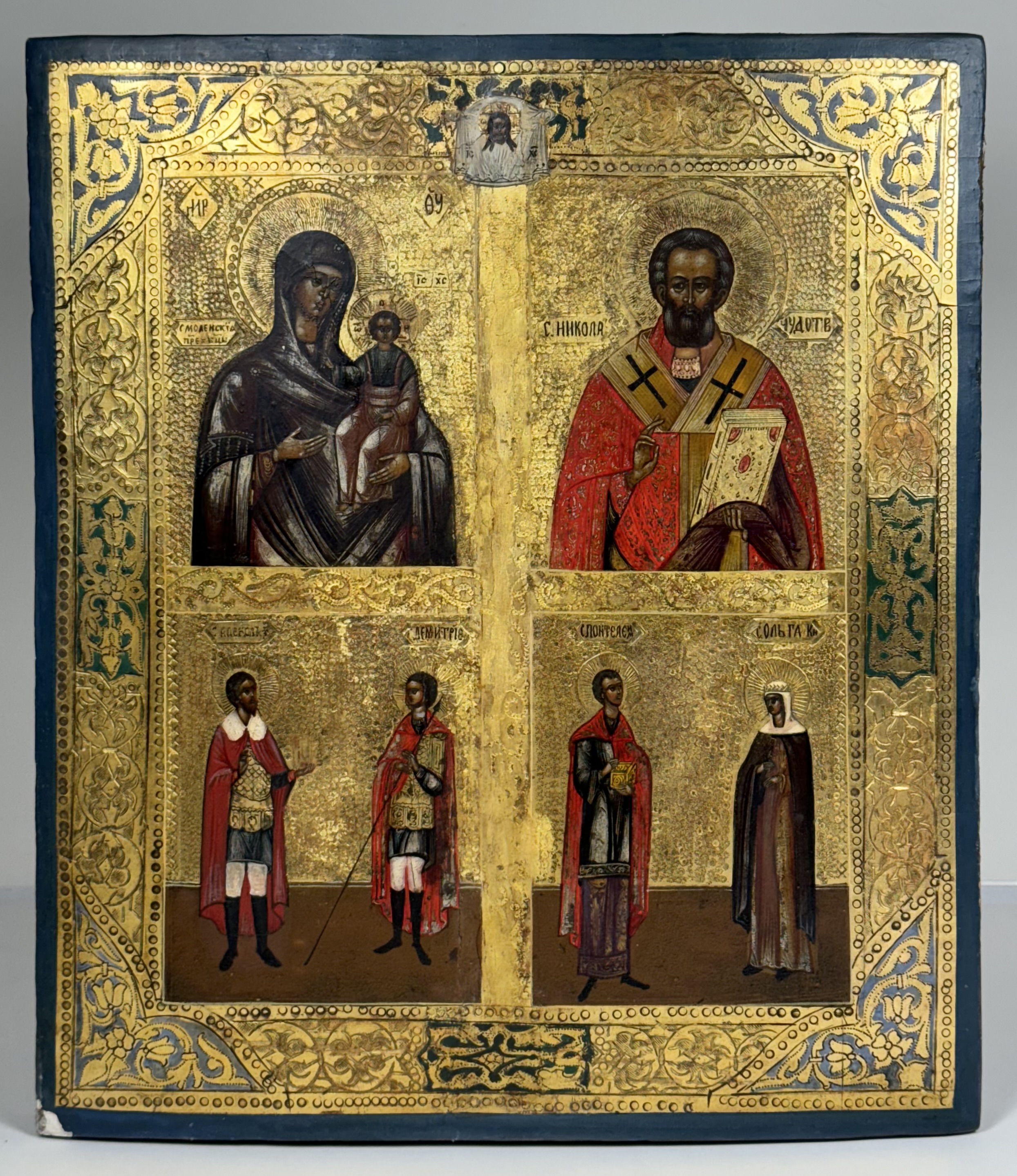 The 4-part icon is painted on gold and tooled ground depicting Our Lady of Smolensk, St. Nicholas the Wonderworker of Myra, and four Selected Saints in the lower registers: St. Prince Alexander Nevsky, St. Dmitrius of Thessaloniki, St. Panteleimon the Unmercenary Healer, and St. Princess Olga.