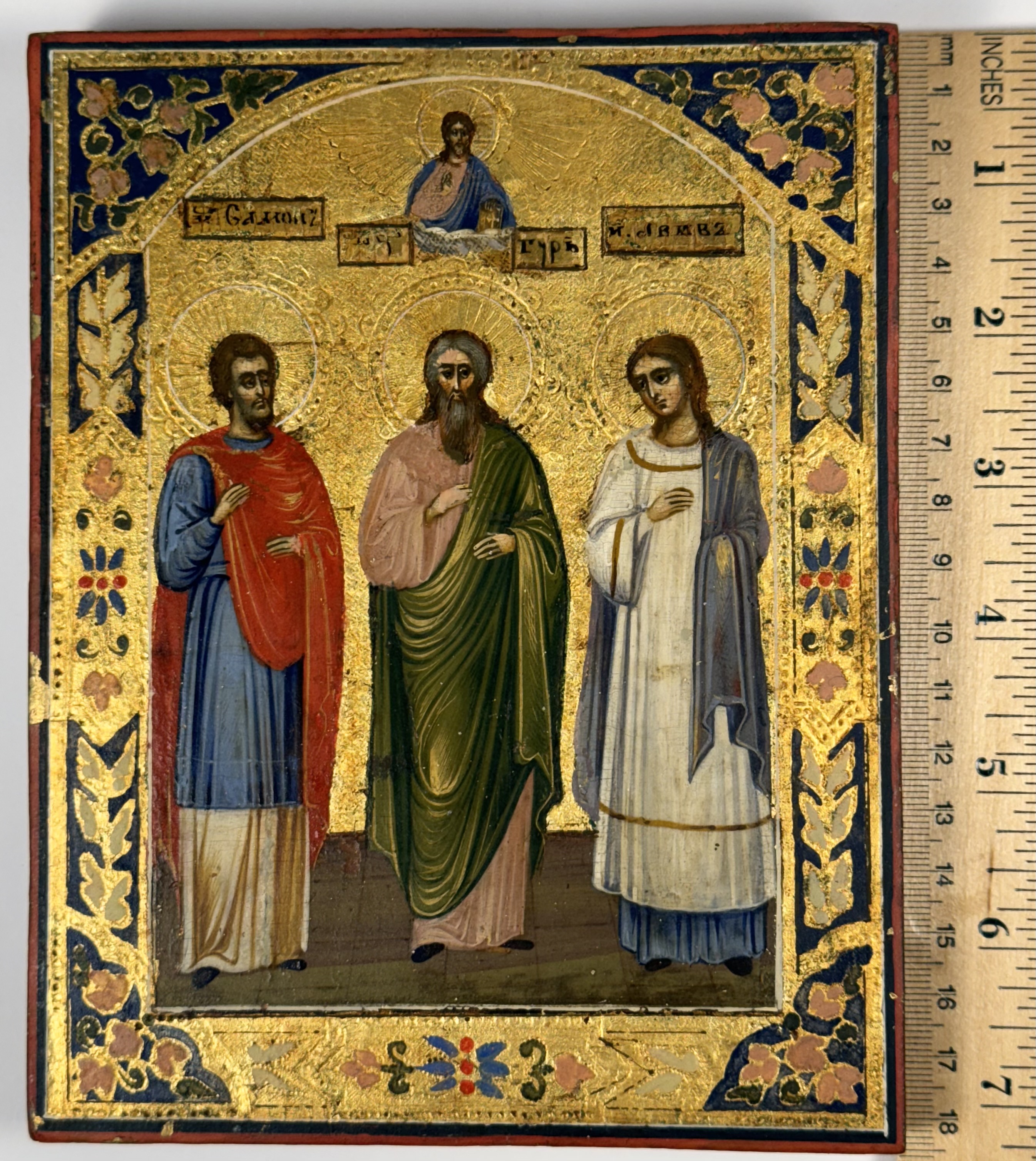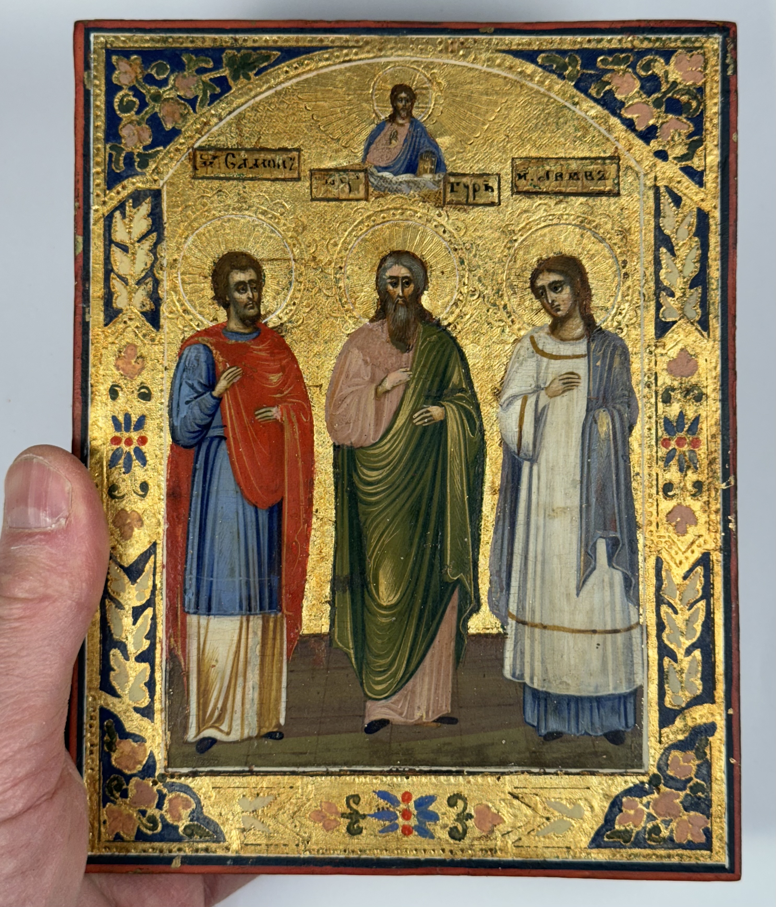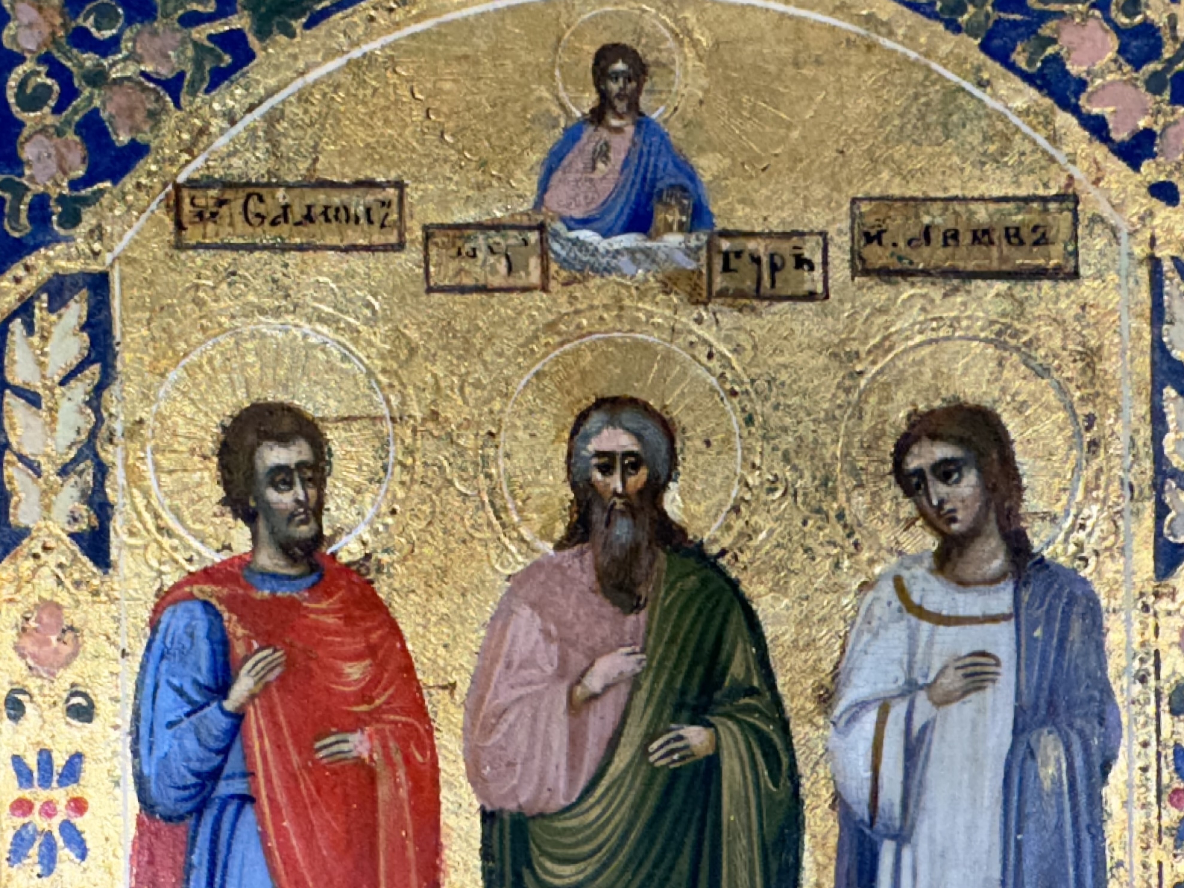 Saints Shamona, Guria, and Deacon Abibus of Edessa (known in Russia as Saints Samon, Gury, and Aviv) († ca. 322) were Christians who were martyred in Edessa, Mesopotamia under Emperor Licinius for refusal to worship the Pagan Gods. They are venerated in the Orthodox Church as Patron Saints of the Holy Matrimony and their Feast day is celebrated on November 15. The Orthodox icons depicting the Saints are traditionally gifted as a wedding present. Saint Samon is depicted as a middle-aged man with dark hair and a small beard with a cross in his hands; Saint Gury is depicted as a gray-haired elder with a long beard also holding a cross; Aviv as a young, beardless man in a deacon’s stole holding a censer.