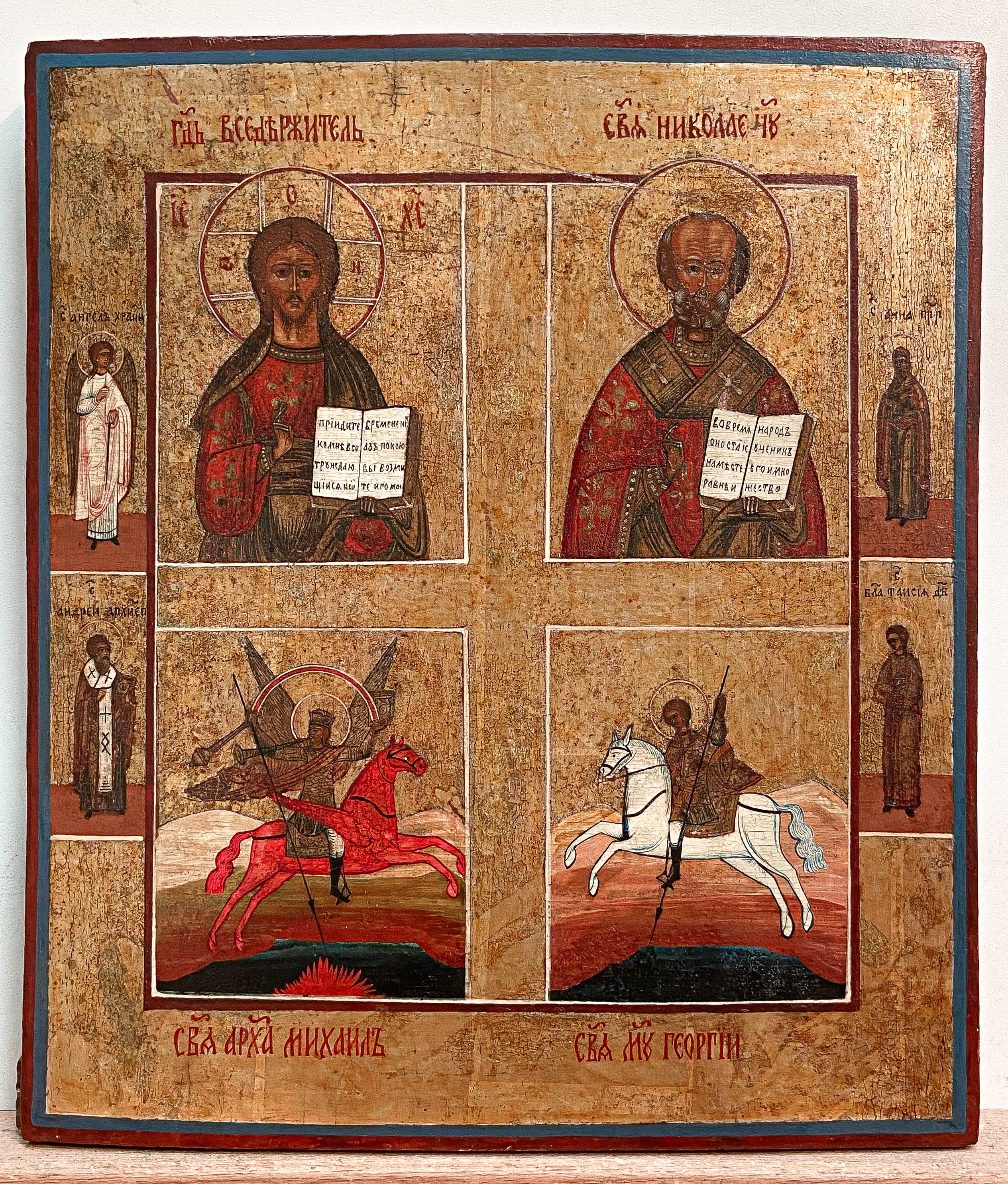 The icon depicts Christ Pantocrator, St. Nicholas, St. Michael the Archangel, St. George, and 4 border Saints: the Guardian Angel, St. Andrew the Archbishop of Crete, St. Venerable Anna, and St. Virgin Taisia of Egypt.