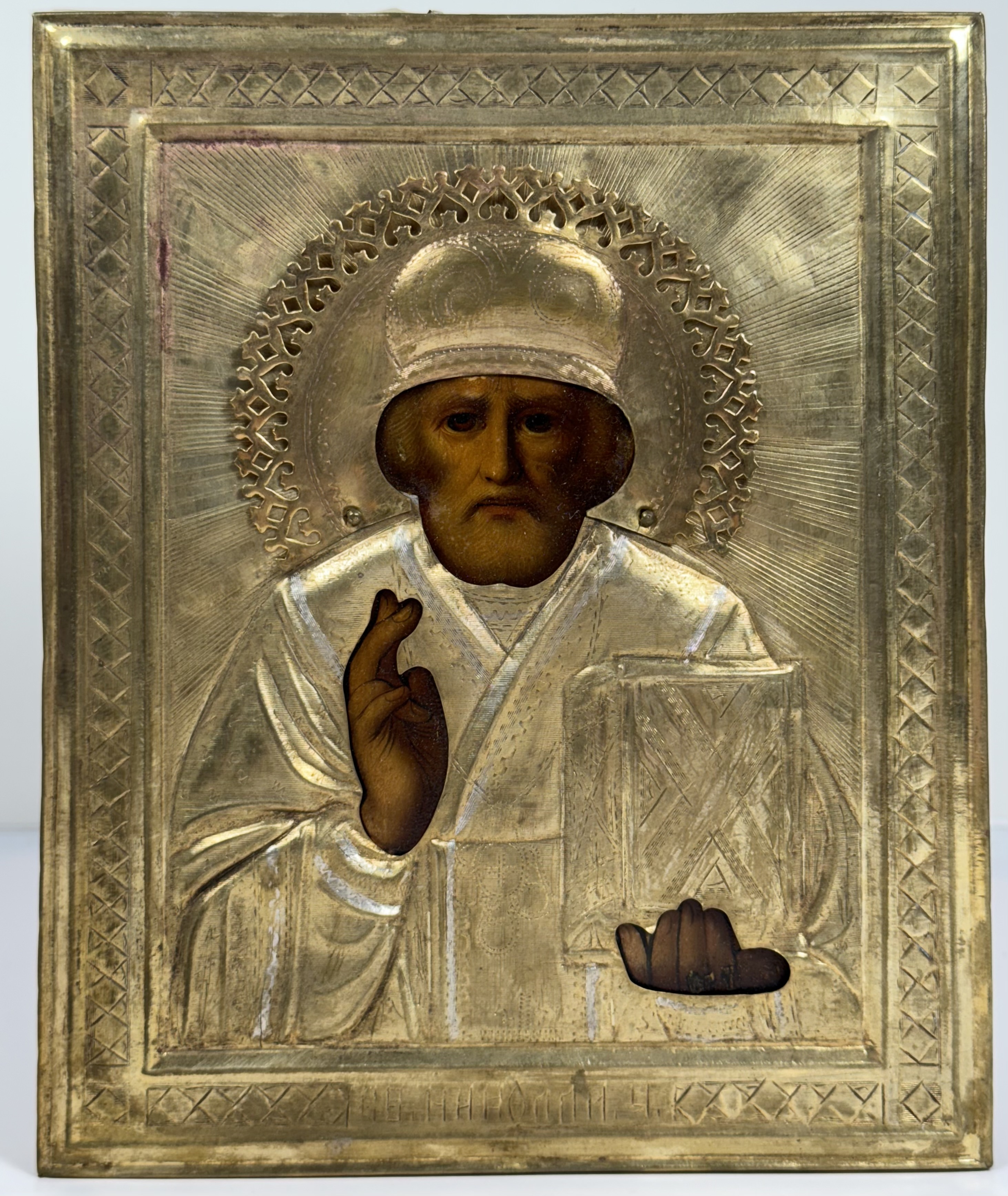 Russian Icon - Saint Nicholas the Wonderworker of Myra in brass revetment cover