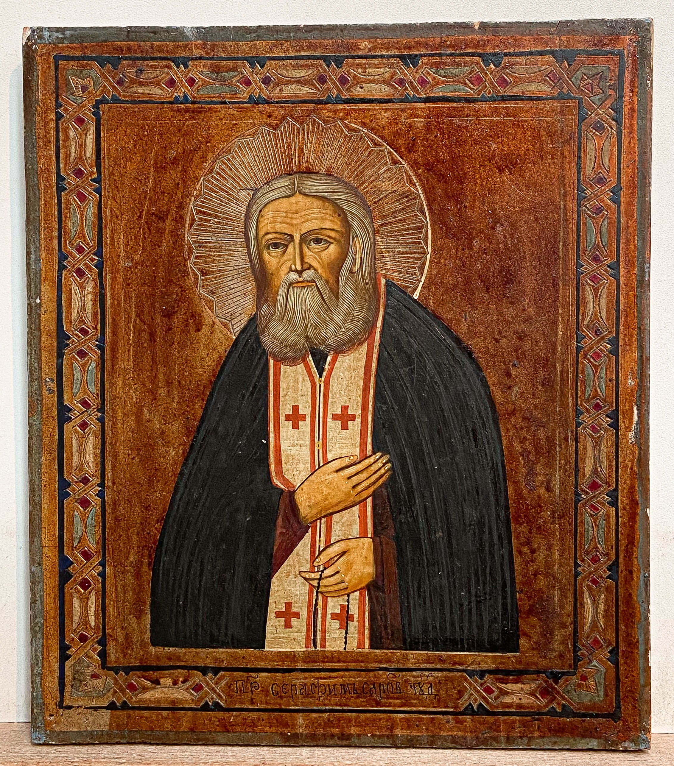 Saint Seraphim of Sarov (Серафим Саровский) († 1833), is one of the most renowned Russian monks and mystics in the Orthodox Church who was canonized in 1903. He is generally considered the greatest of the 19th century startsy (elders) and, arguably, the first. He is remembered for extending the monastic teachings of contemplation, theoria and self-denial to the layperson, and taught that the purpose of the Christian life was to acquire the Holy Spirit. He was canonized in 1903 in Sarov at the ceremony attended by the Tsar and senior members of the Russian Imperial family.
