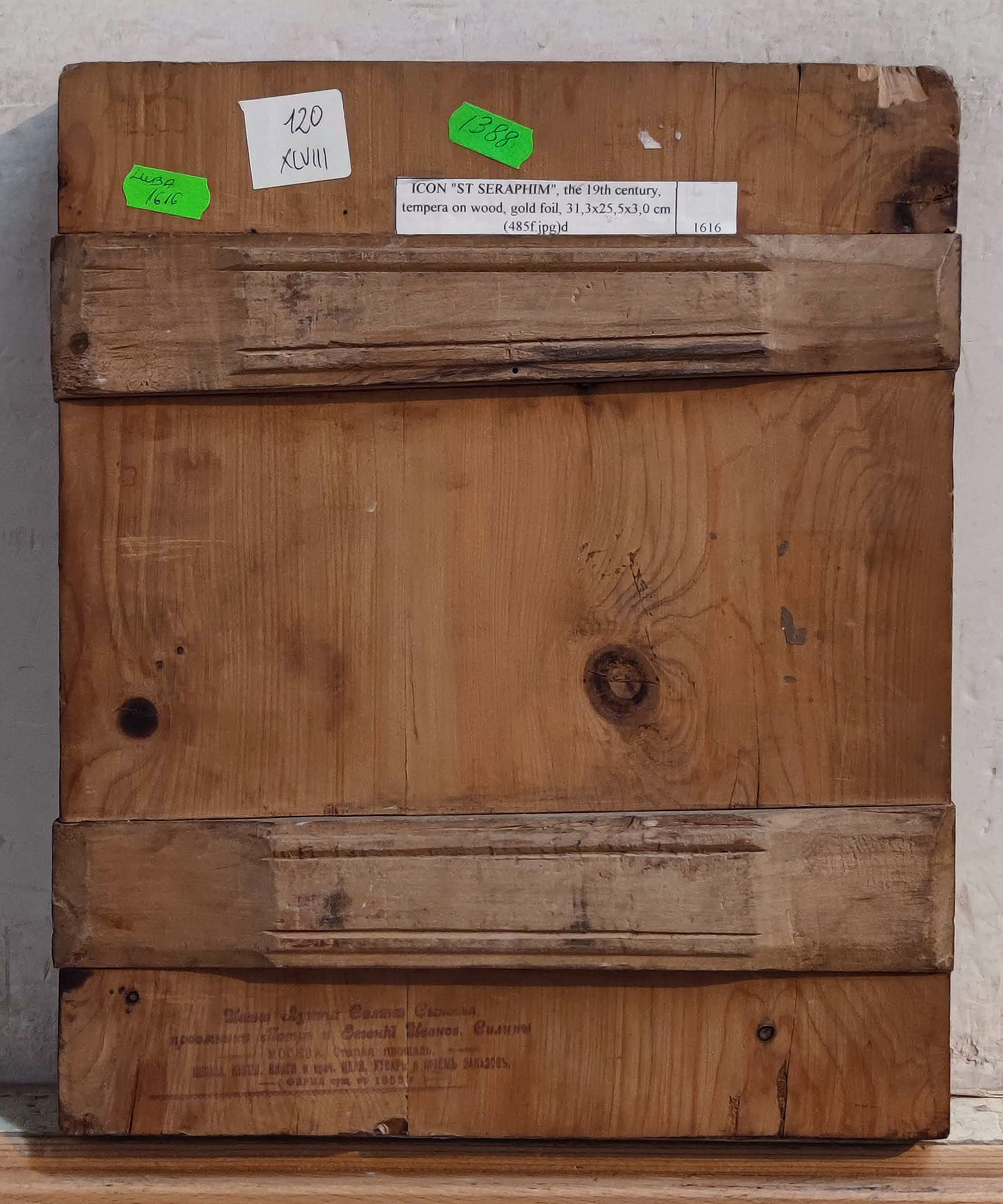 Saint Seaphim is depicted in front of the Monastery of the Sarov-Dormition of the Mother of God where he lived from 1778 to 1833. On the back, the icon bears a stamp from the famous icon shop of Ivan Silin in Moscow.