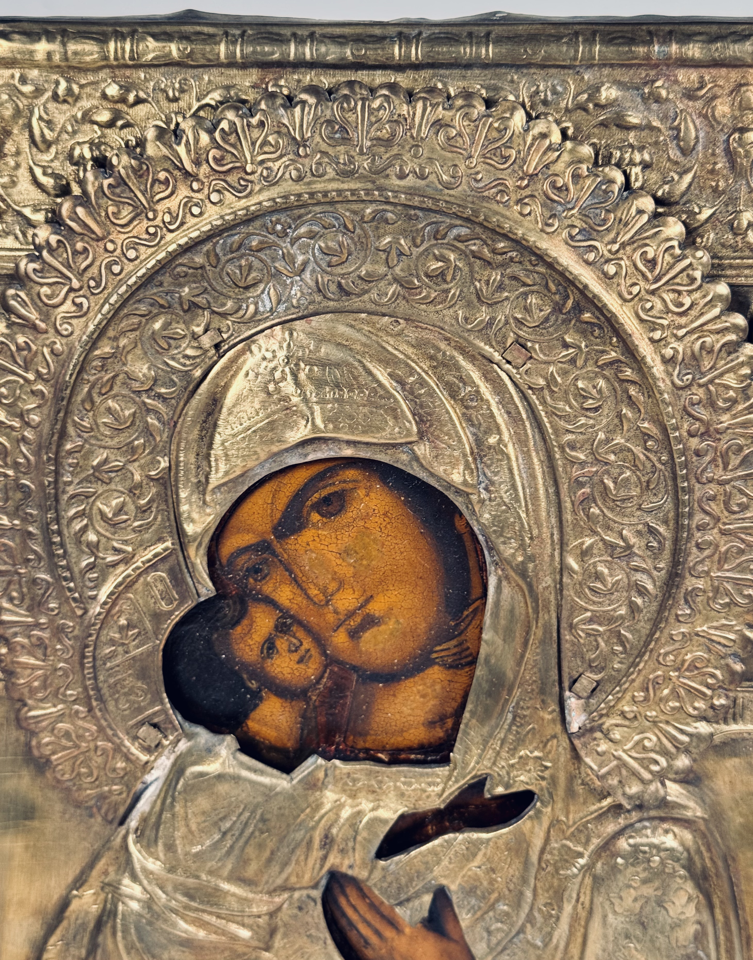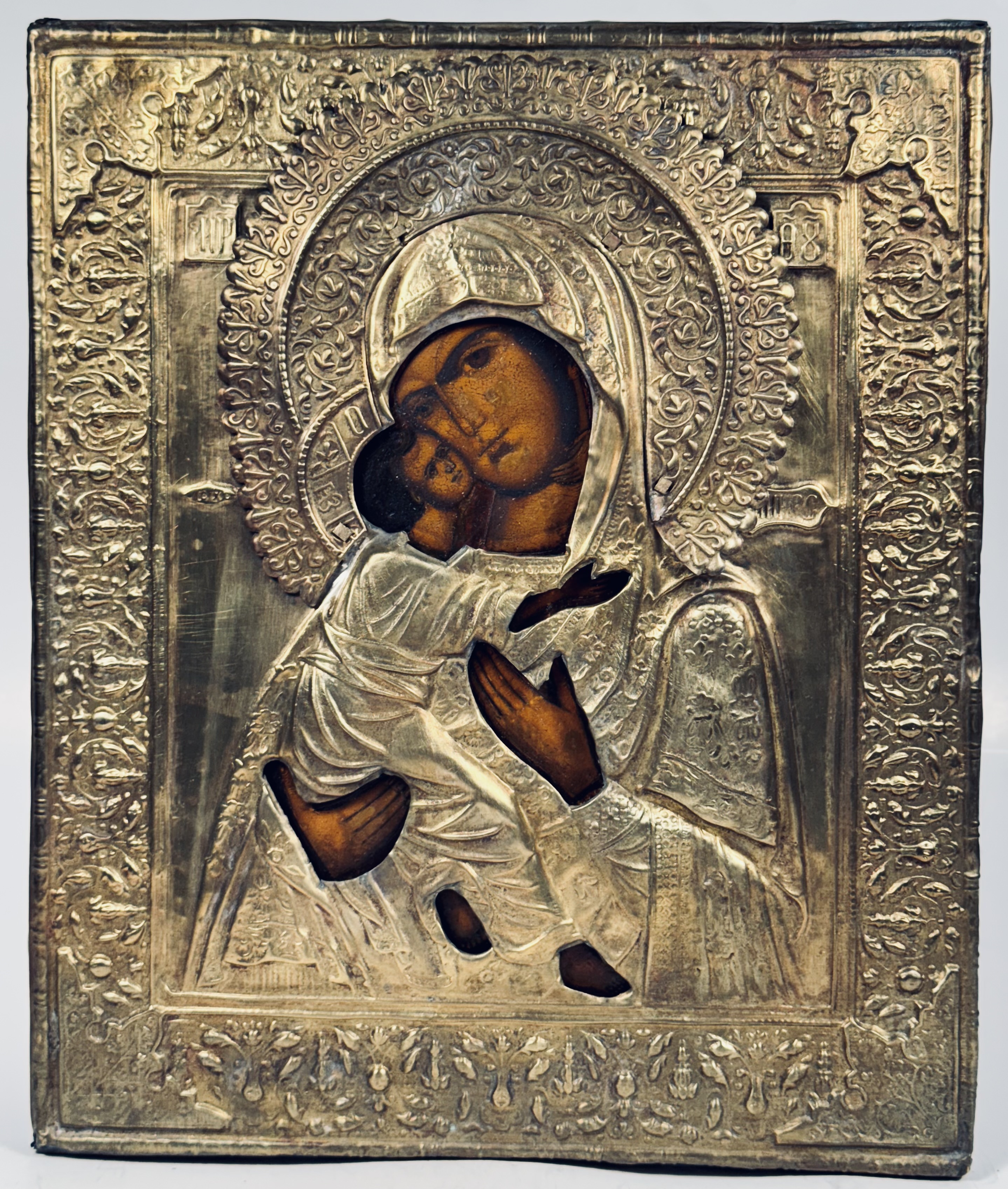 Russian Icon - Our Lady of Vladimir in brass revetment cover