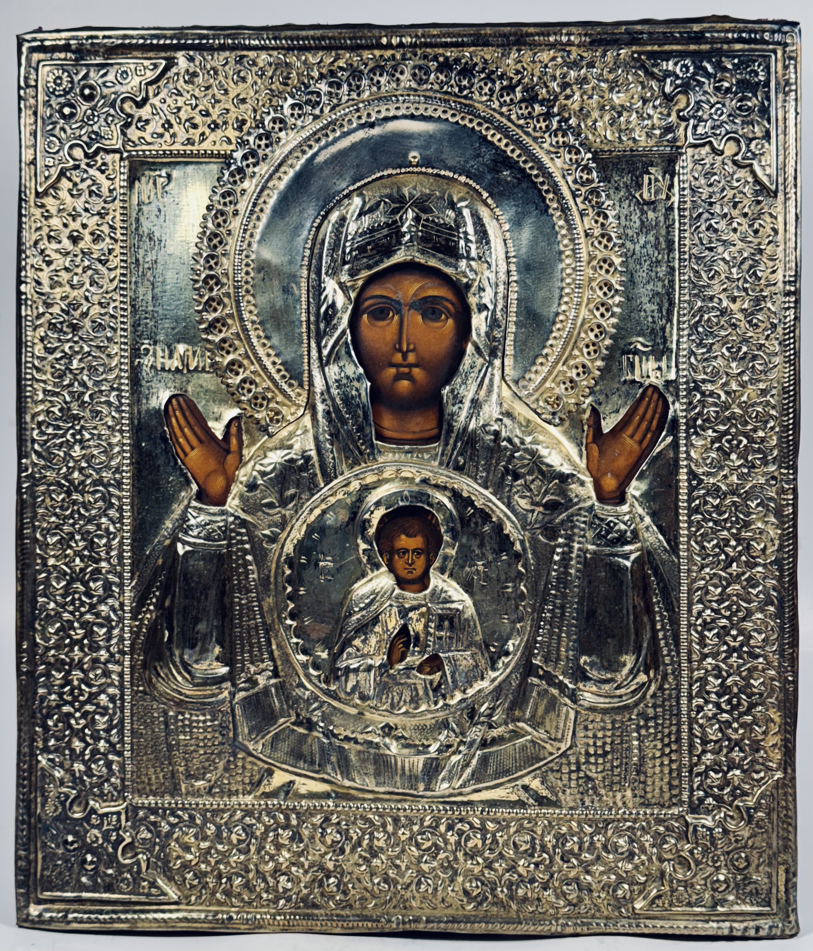 Our Lady of the Sign is one of the most beloved Russian miracle-working icons of Theotokos. The icon depicts Her during the Annunciation at the moment of saying, "May it be done to me according to your word." (Luke 1:38). The Virgin Mary is depicted frontally half-length, with her hands raised in a praying position, and the Child Jesus within a round aureole upon her breast representing him at the moment of his conception. The term Virgin of the Sign is a reference to the prophecy of Isaiah 7:14: "Therefore the Lord himself shall give you a sign; Behold, a virgin shall conceive, and bear a son, and shall call his name Immanuel."