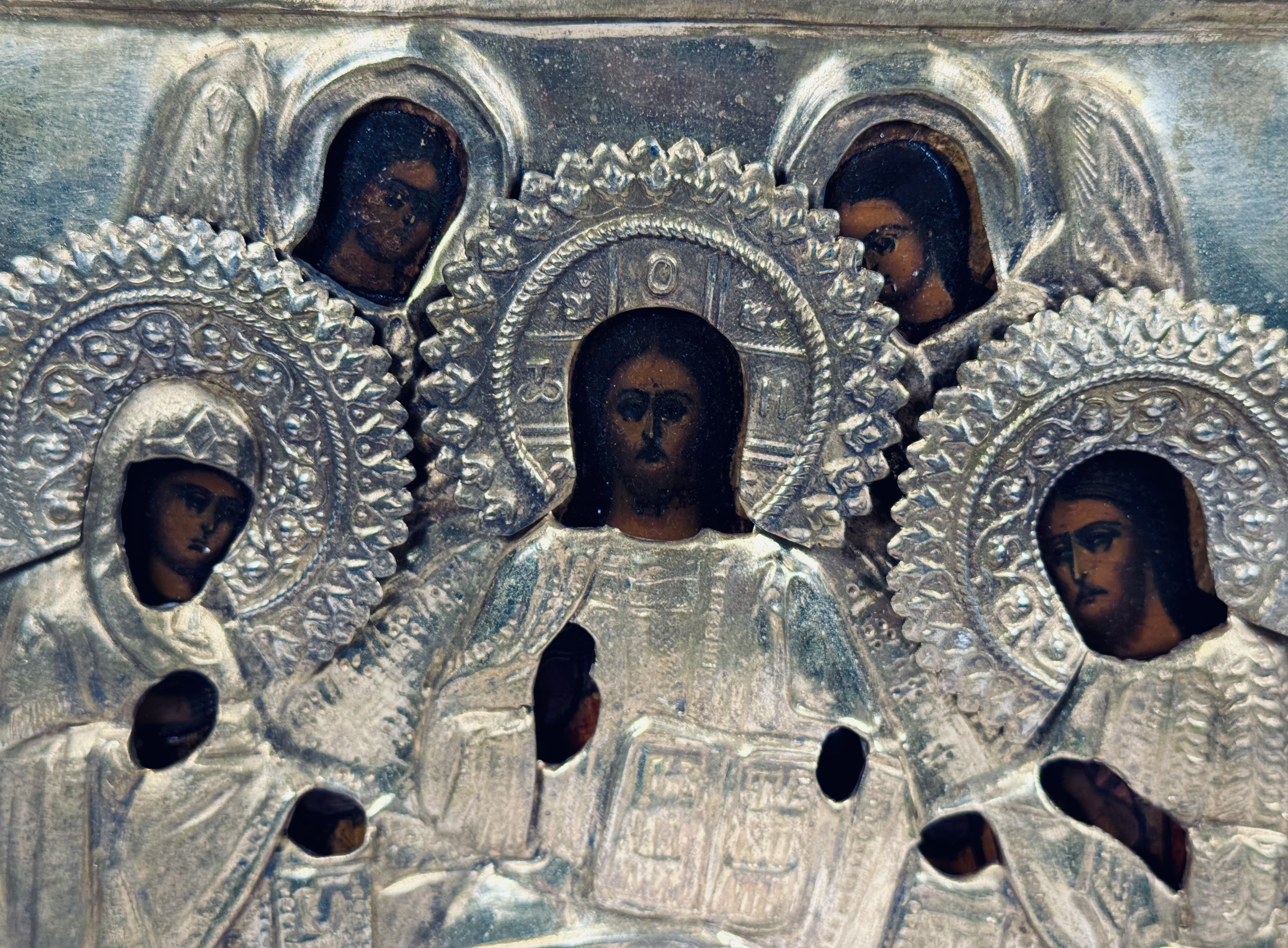 The icon depicts Our Savior of Smolensk, the iconographic type of Jesus Christ represented as the enthroned Pantocrator, full-figured with his right hand raised in a blessing gesture and his right hand holding an open book of Gospels. He is flanked by the Virgin Mary and Saint John the Baptist and surrounded by two Angels. To either side of Him, kneeling in prayer at His feet, are Saint Sergius of Radonezh and the Venerable Barlaam of Khutyn.
